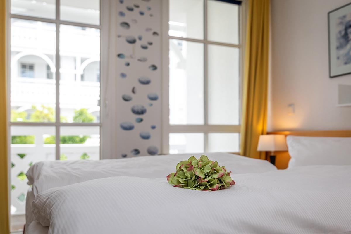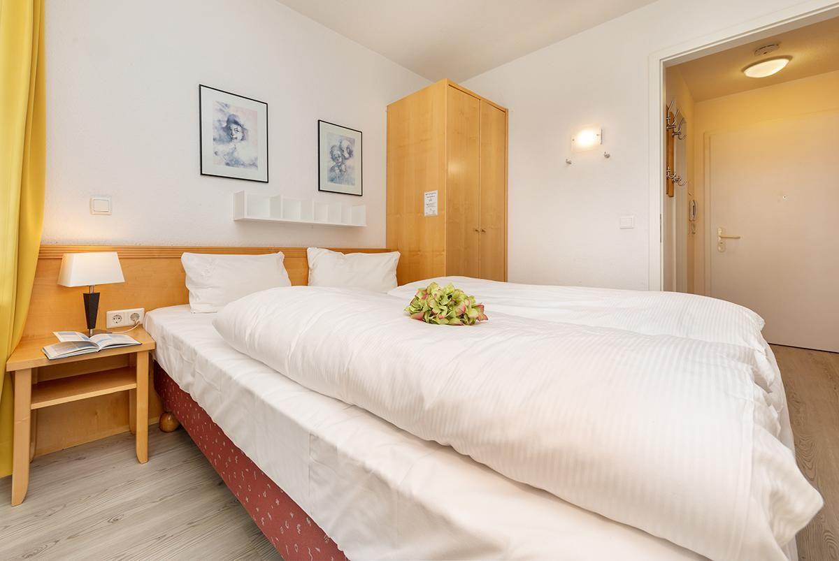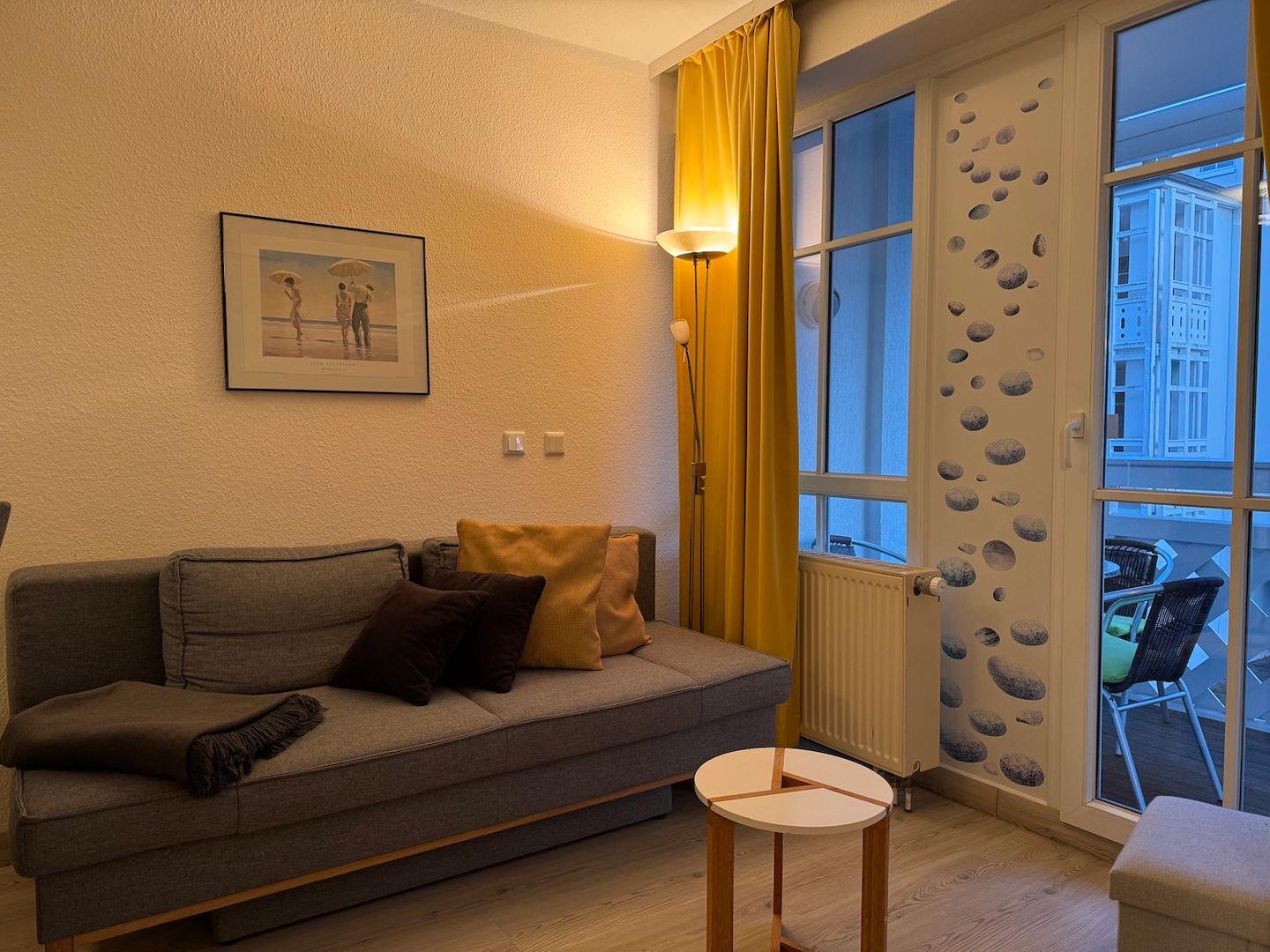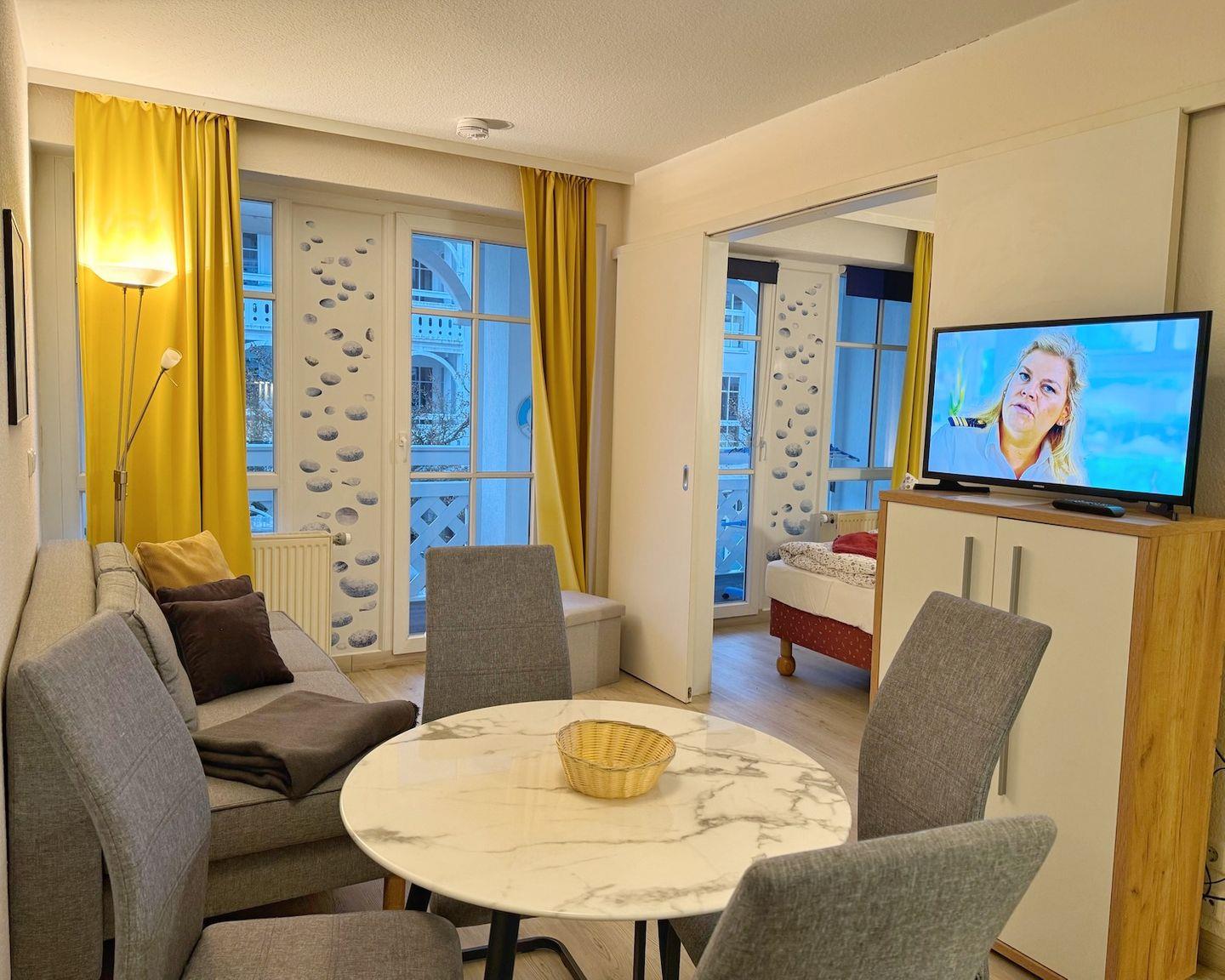 Das Appartement 506 befindet sich im 1. OG des Hauses und hat eine Wohnfläche von 37qm. Das Appartement bietet Platz für maximal 4 Personen. Ein überdachter Balkon erstreckt sich sowohl vor dem Wohnzimmer bis hin zum Schlafzimmer. Der Wohnbereich bietet neben einer gemütlichen Couch (die als Schlafcouch für 2 Personen hergerichtet werden kann) auch einen Esstisch für 4 Personen sowie eine integrierte, offene Küche, die komplett ausgestattet ist. Im hellen Schlafzimmer gibt es ein Doppelbett. Das Bad verfügt über eine ebenerdige Dusche. In der Wohnung gibt es kostenfreies WLAN. Zur Wohnung gehören ein Pkw-Stellplatz in der Tiefgarage sowie eine abschließbare Fahrradabstellmöglichkeit neben der Tiefgarage.