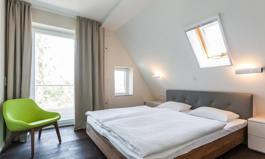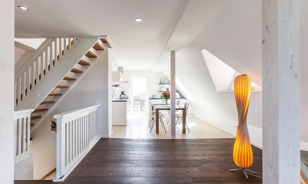 Über den Haupteingang gelangst du direkt in die moderne Wohnung. Im Obergeschoss erwartet dich der lichtdurchflutete Wohnbereich mit gemütlicher Sitzecke, eine offene Küche mit Essbereich, ein Schlafzimmer mit Doppelbett sowie ein exklusives Bad mit Dusche/WC. Im Dachgeschoss befindet sich eine offene Schlafgalerie mit Bettlandschaft und Gäste-WC. Das Sofa im Wohnbereich bietet den Gästen bei Bedarf eine zusätzliche Schlafmöglichkeit.