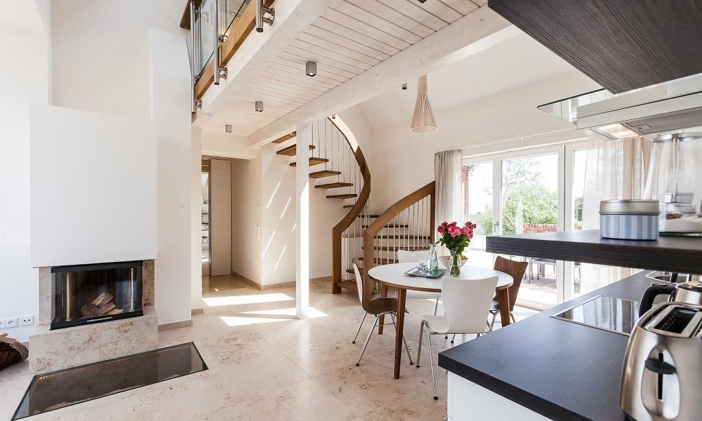 Im Erdgeschoss der Haushälfte ist der lichtdurchflutete Wohnbereich direkt im Wintergarten integriert und schafft mit der gemütlichen Sitzecke am Kamin ein besonderes Wohngefühl. Die offene Küche mit Essbereich lädt zum gemeinsamen Kochen ein. Weiterhin befindet sich in der unteren Etage ein Schlafzimmer mit Doppelbett (160 cm), ein zweiter TV und ein angeschlossenes Bad mit Dusche/WC, ein separates Gäste-WC sowie eine große umlaufende Holzterrasse, die dir erholsame Stunden an der frischen Ostseeluft beschert. Das Obergeschoss verfügt über ein zweites Schlafzimmer mit zwei Singlebetten, die sowohl als Einzelbett oder Doppelbett - ganz individuell nach Ihren Bedürfnissen genutzt werden können (Schiebesystem). Ein zweites Bad mit Dusche/WC findet ebenfalls im Obergeschoss Platz und sorgt für weiteren Wohnkomfort. Von der oberen Etage genießt du einen kleinen Blick auf die Ostsee.