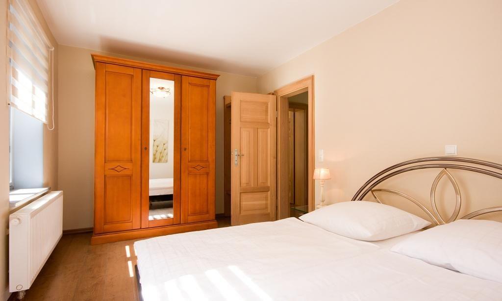 Die Erdgeschosswohnung empfängt dich mit einem hellen Wohnraum, der über eine gemütliche Sitzecke verfügt. Die komfortable Küchenzeile mit Essbereich am Fenster ist unmittelbar in den Wohnraum integriert. Das Schlafzimmer ist mit einem Doppelbett und einem großen Kleiderschrank ausgestattet. Ein separater Raum mit einer Schlafcouch bietet eine zusätzliche Aufbettungsmöglichkeit für zwei Personen. Zur Wohnung gehört ein exklusives Bad mit Dusche und WC.