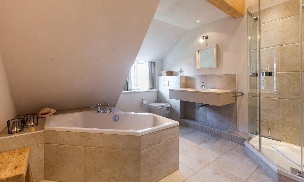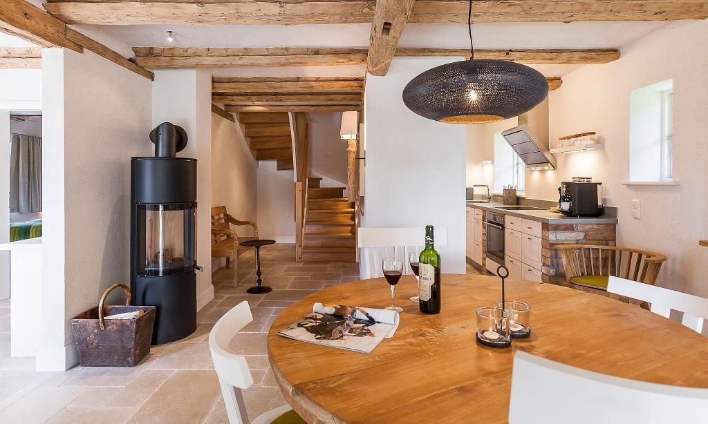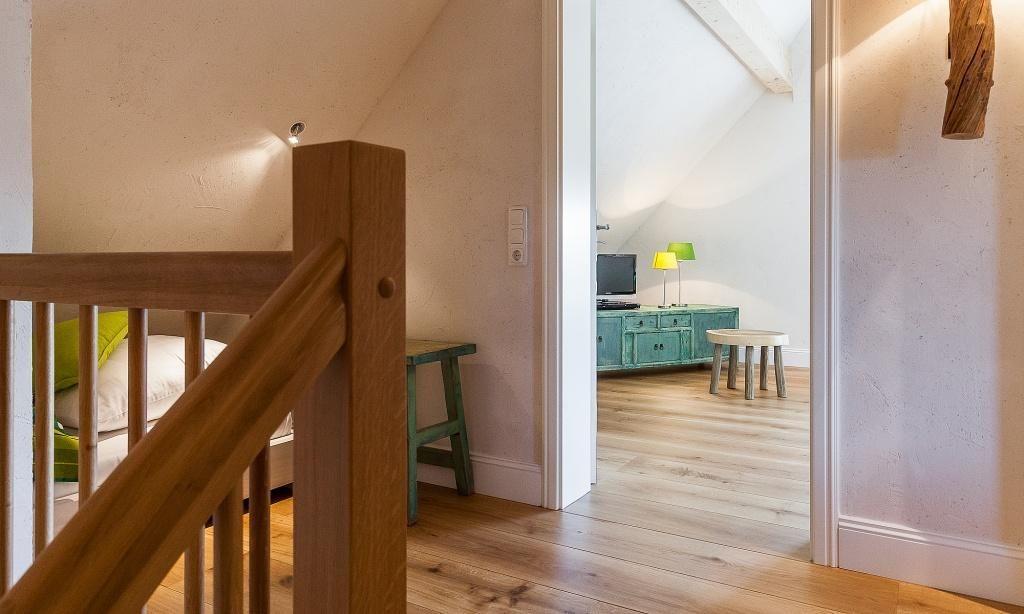 Über den kleinen Flur gelangst du in den großzügigen und lichtdurchfluteten Wohnraum mit einer gemütlichen Sitzecke am modernen Kaminofen. Der einladende Essbereich und die hochwertige Einbauküche sind unmittelbar in den Wohnbereich integriert. Das Schlafzimmer ist mit einem Doppelbett ausgestattet. Das edle Bad verfügt über Dusche/WC. Das Obergeschoss beherbergt ein zweites Schlafzimmer mit einem Doppelbett sowie ein exklusives Badezimmer mit Wanne, Dusche und WC. In einer kleinen Nische ist eine gemütliche Kuschelecke untergebracht.