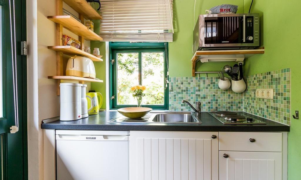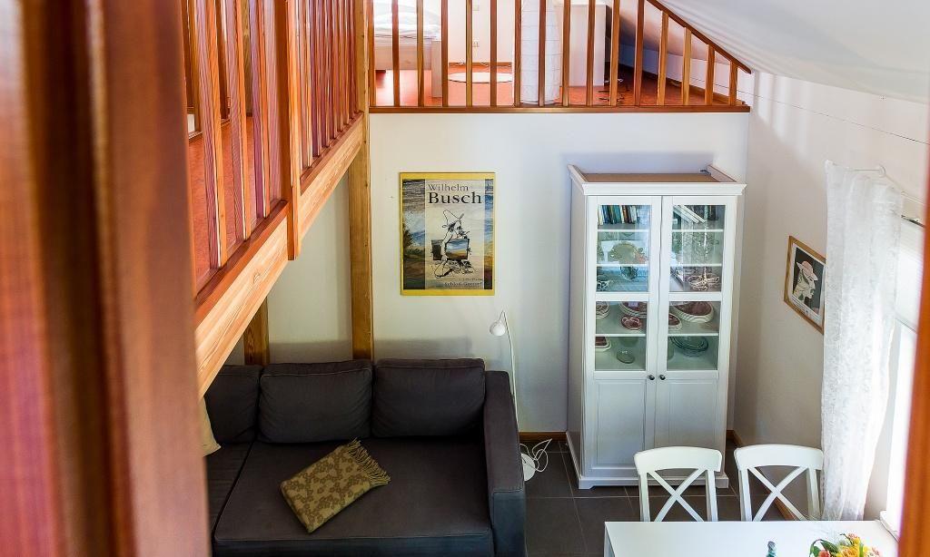 Das hübsche Ferienhaus erstreckt sich über zwei Etagen und ist im liebevollen Landhaus-Stil eingerichtet. Im Erdgeschoss befindet sich ein offener Wohnraum mit Galeriecharakter. Die gemütliche Sitzecke, ein Essbereich sowie eine Mini-Küchenzeile (mit 2-Platten-Kochfeld) sind unmittelbar integriert. Das Bad verfügt über mit Dusche/WC. Im Dachgeschoss befindet sich eine offene Schlafgalerie mit einem Doppelbett. Eine zusätzliche Aufbettung ist auf dem Sofa im Wohnbereich möglich.