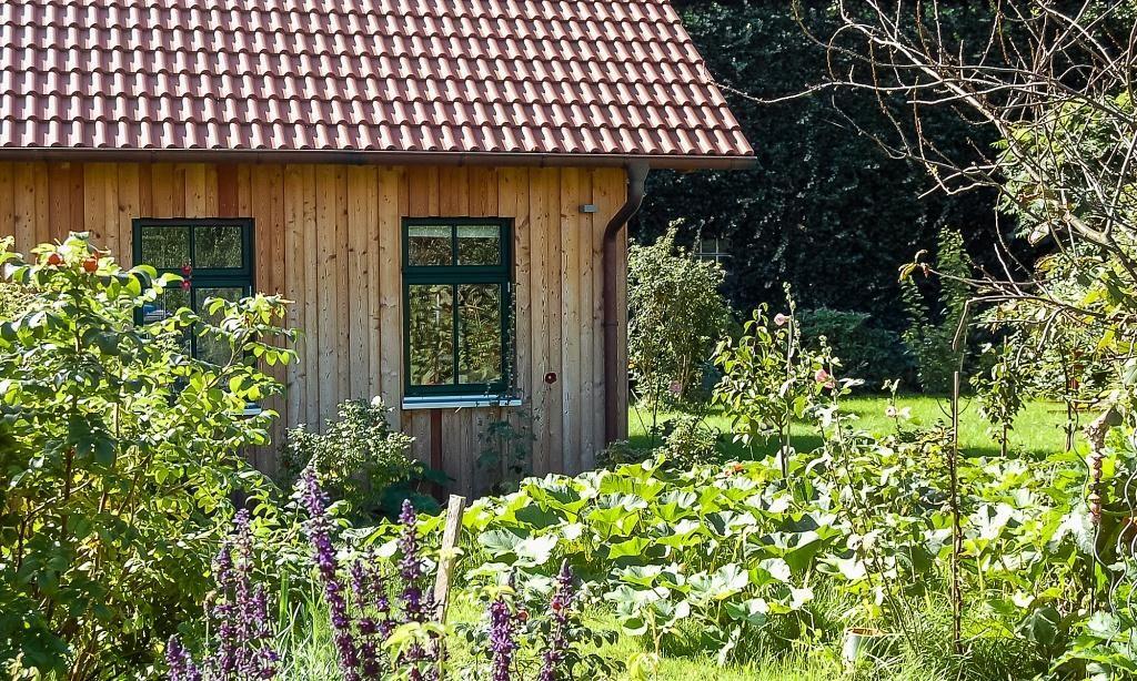 Zum Ferienhaus gehört eine Terrasse in Süd-Ausrichtung. Hier kannst du die Sonne genießen, leckere Grillabende veranstalten oder den Urlaubstag entspannt ausklingen lassen. Ein kleiner Teil des angrenzenden Naturgartens kann gern gemeinschaftlich genutzt werden. Ein PKW-Stellplatz steht dir ebenfalls zur Verfügung.