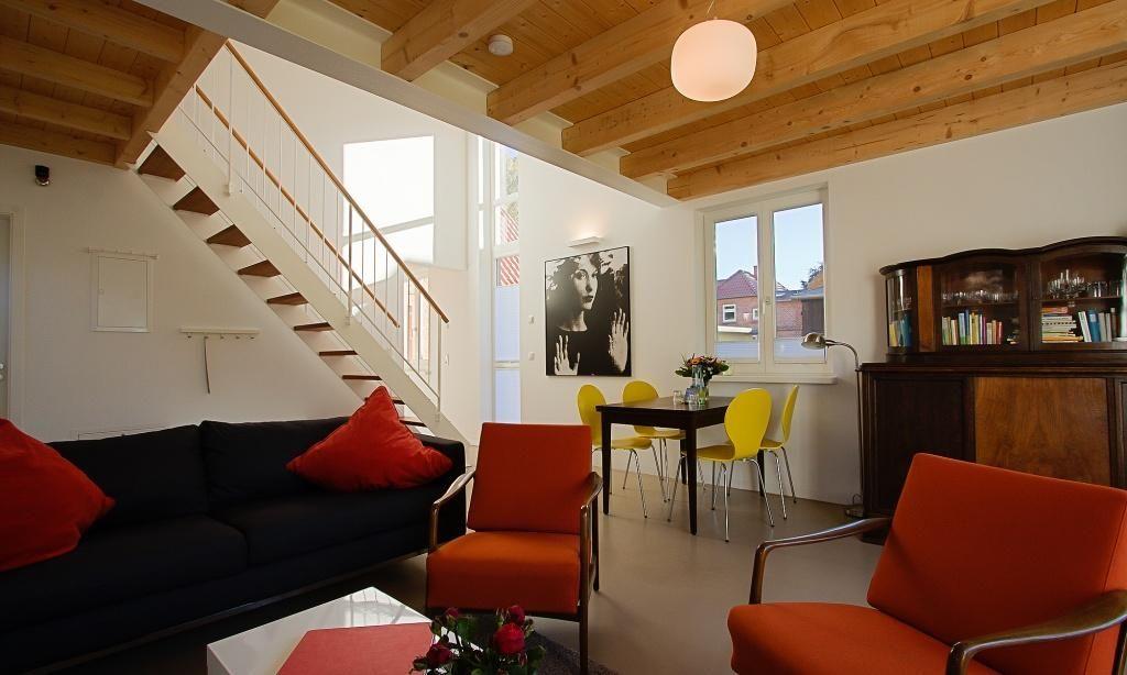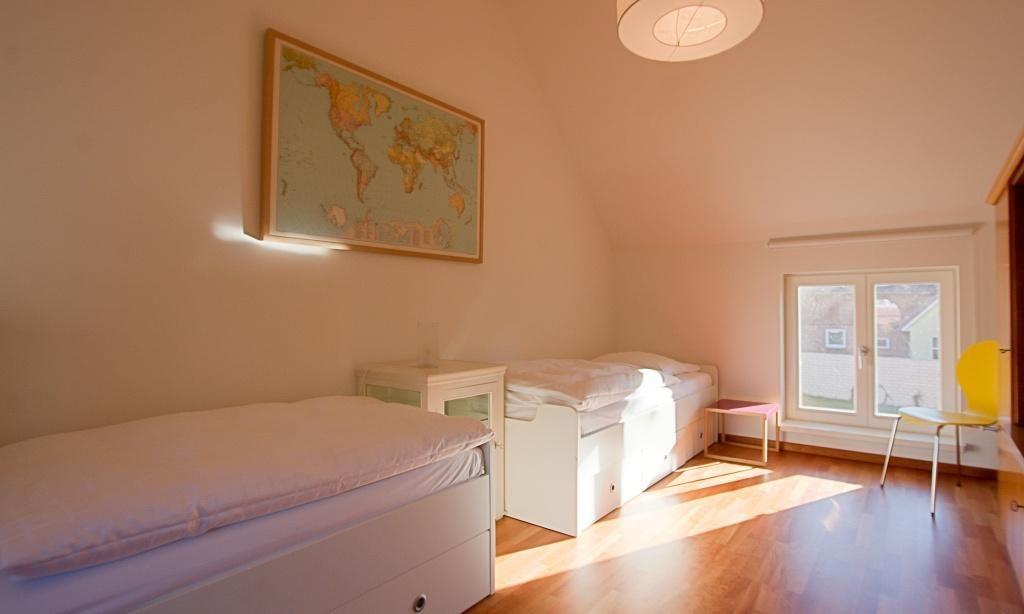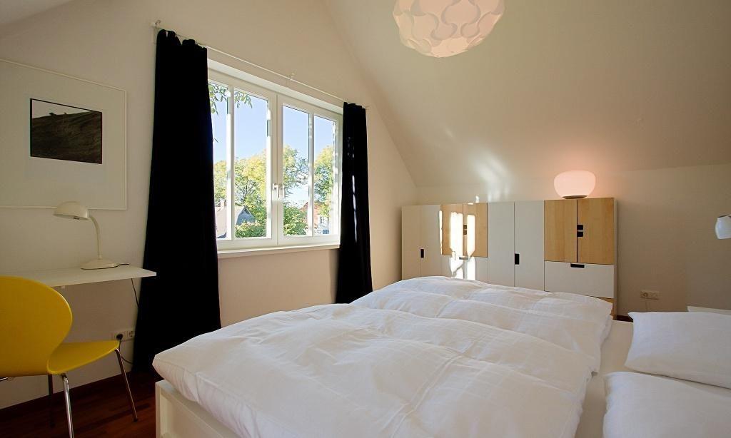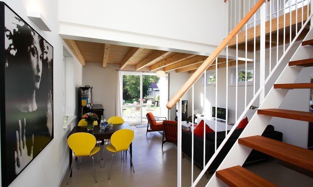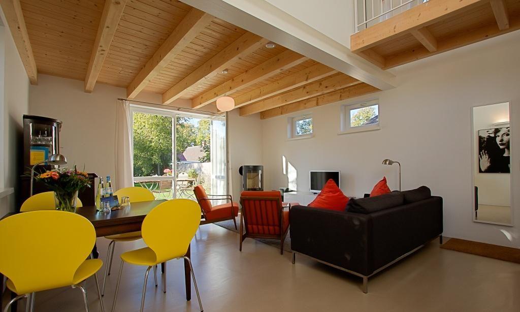 Das alte historische Backsteinhaus wurde um einen modernen Holzanbau erweitert. Dieser Anbau erstreckt sich über zwei Etagen und verfügt über einen Galeriecharakter. Die moderne Einrichtung im Retro-Stil gepaart mit den eingezogenen Holzdeckenbalken schafft ein ganz besonderes Wohnambiente. Im Erdgeschoss befinden sich der Wohnbereich mit einer gemütlichen Sitzecke am Kaminofen, der Essbereich, eine separate und hochwertig ausgestattete Küche sowie das Badezimmer mit Dusche/WC. Das Dachgeschoss beherbergt ein Schlafzimmer mit Doppelbett sowie ein zweites Schlafzimmer mit zwei Einzelbetten.