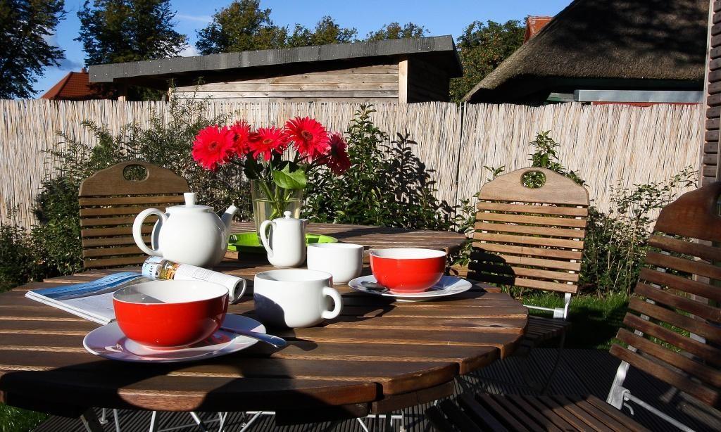 Der großzügige und liebevoll gestaltete Garten mit Sitzbank unterm Baum kann von allen drei Einheiten des Ferienhauses genutzt werden. Ebenso steht der Gemeinschaft eine Tischtennisplatte, ein Basketballkorb, Fußballtore und ein Bollerwagen zur Verfügung.