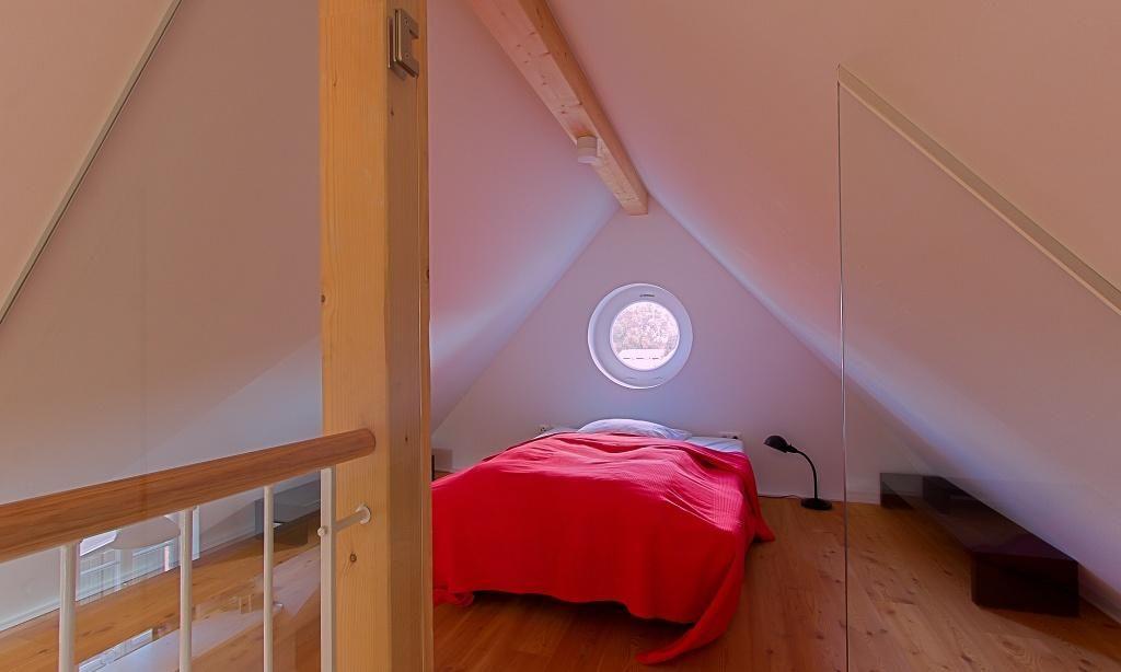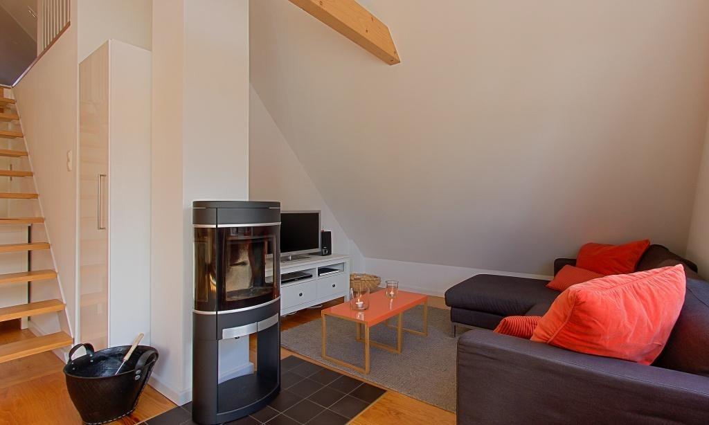 Die große Dachterrasse ist zeitgleich auch der Eingang zur Wohnung. In der Obergeschosswohnung erwartet dich der lichtdurchflutete Wohnbereich mit gemütlicher Sitzecke am Kaminofen sowie die offene Küche mit angrenzendem Essbereich. Weiterhin gibt es zwei Schlafzimmer, eines ist mit einem Doppelbett, das andere mit zwei Einzelbetten ausgestattet. Das angrenzende Bad verfügt über eine Badewanne mit Duschvorrichtung und WC. Das Dachgeschoss beherbergt eine offene Schlafgalerie mit einem weiteren Doppelbett und kann als zusätzliche Aufbettung für ein bis zwei Personen genutzt werden. Die gesamte Wohnung ist mit hochwertigen Holzmöbeln ausgestattet, die perfekt mit den hellen, freundlichen Räumen harmonieren und ein tolles Wohnambiente schaffen.