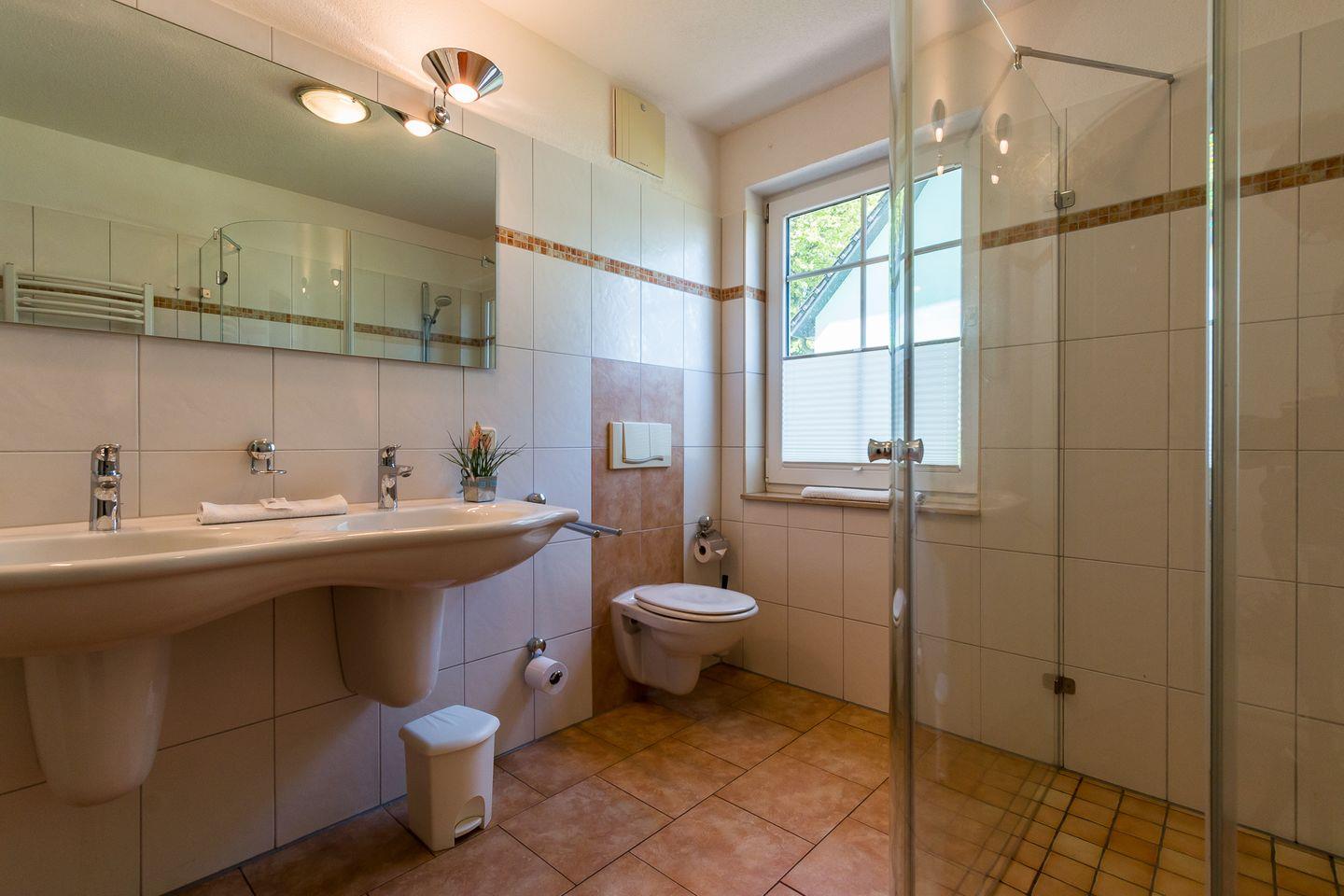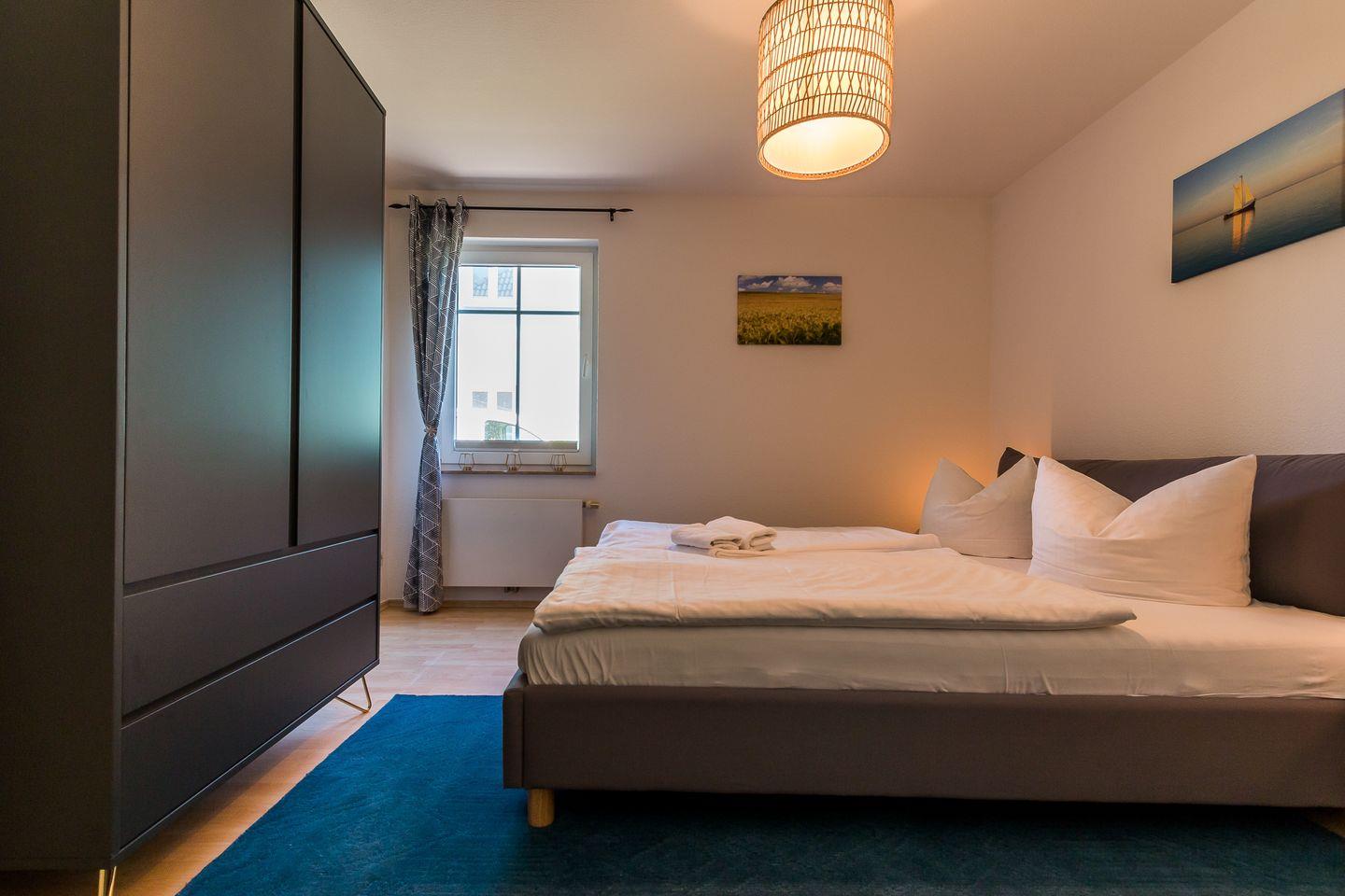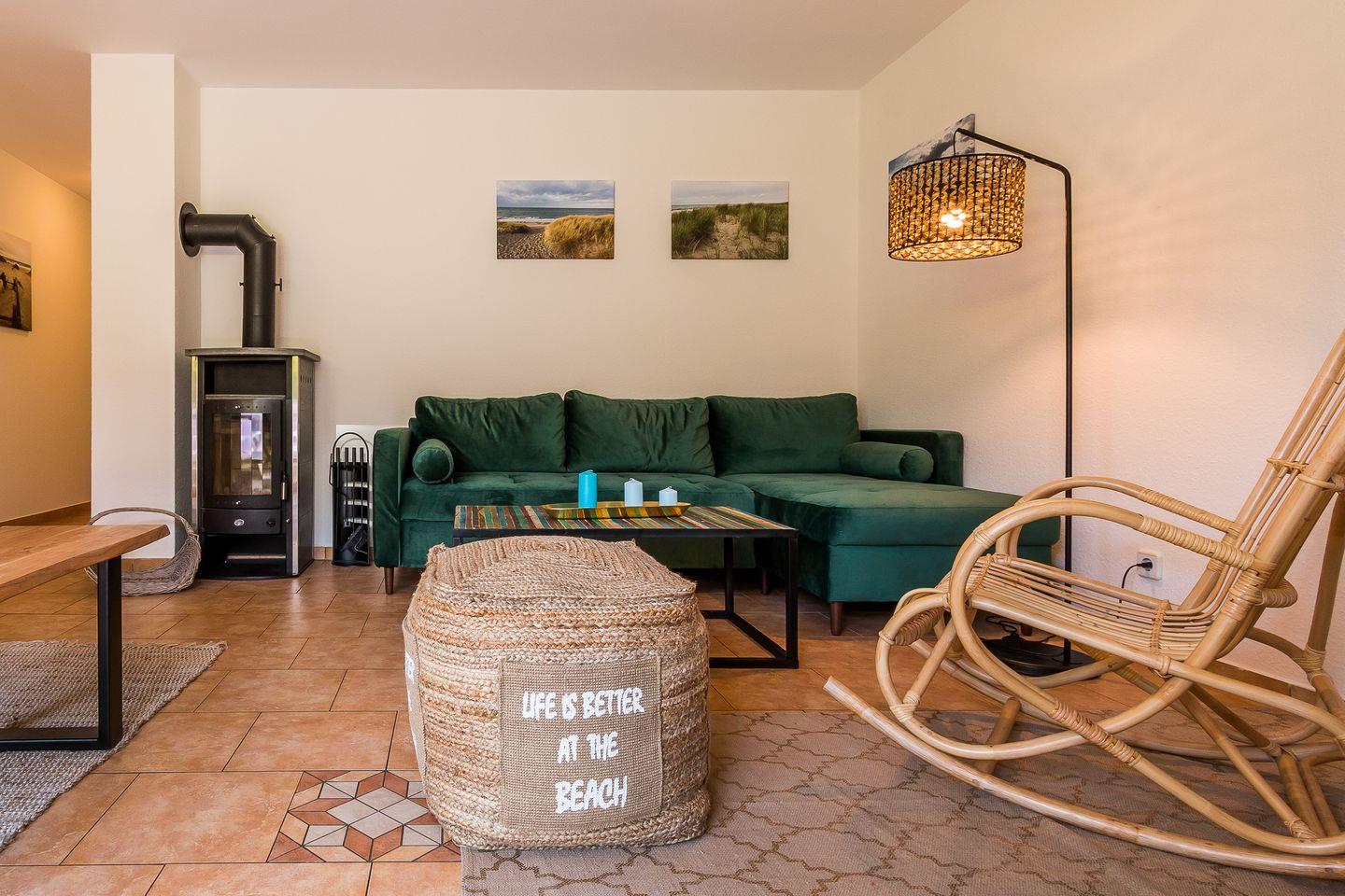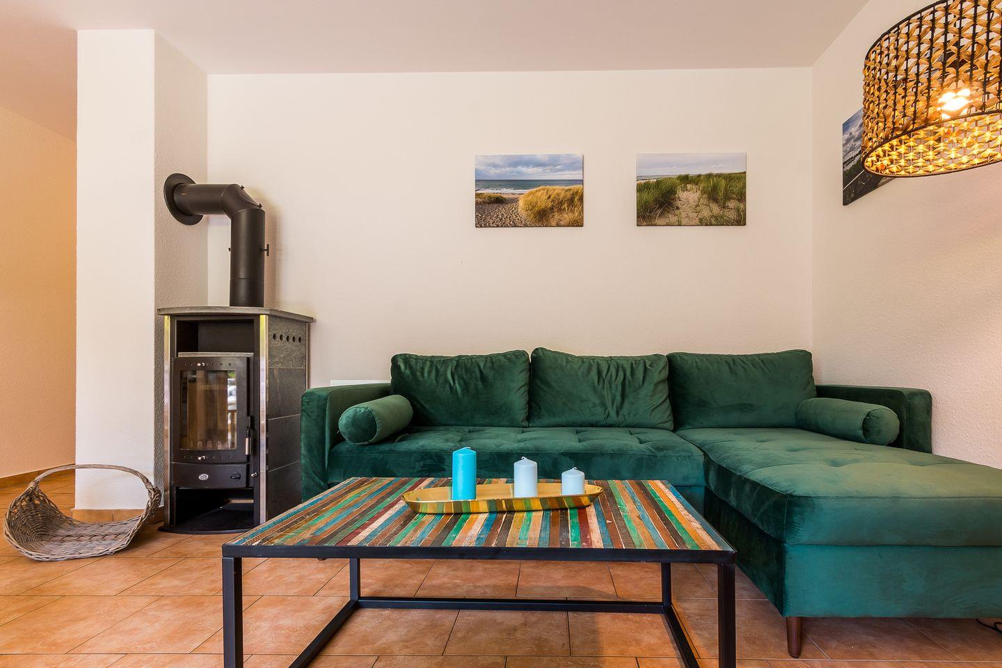In der Erdgeschosswohnung erwartet dich ein großzügiger Wohn- und Küchenbereich. Dank der gemütlichen Sofalandschaft kannst du hier herrlich klönen, während es aus dem Kaminofen knistert. Das Sofa kann als Aufbettung für ein bis zwei Personen genutzt werden. Die Küchenzeile und der Esstisch an bodentiefen Fenstern sind ebenfalls im Wohnraum integriert. Das separate Schlafzimmer ist mit einem Doppelbett ausgestattet und verspricht entspannte Nächte für einen erholsamen Urlaub. Abgerundet wird die Ferienwohnung mit dem Tageslichtbad, ausgestattet mit Dusche und WC.