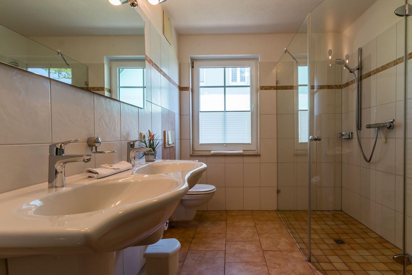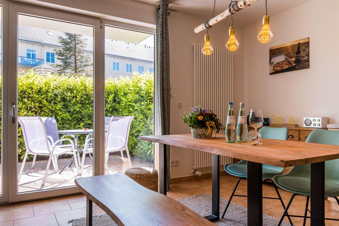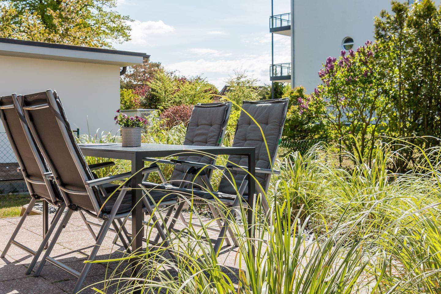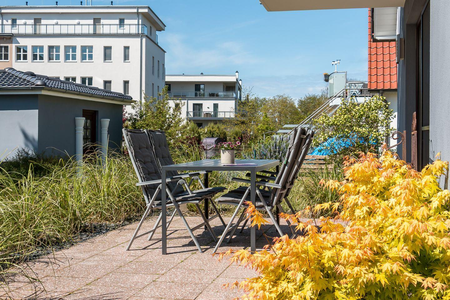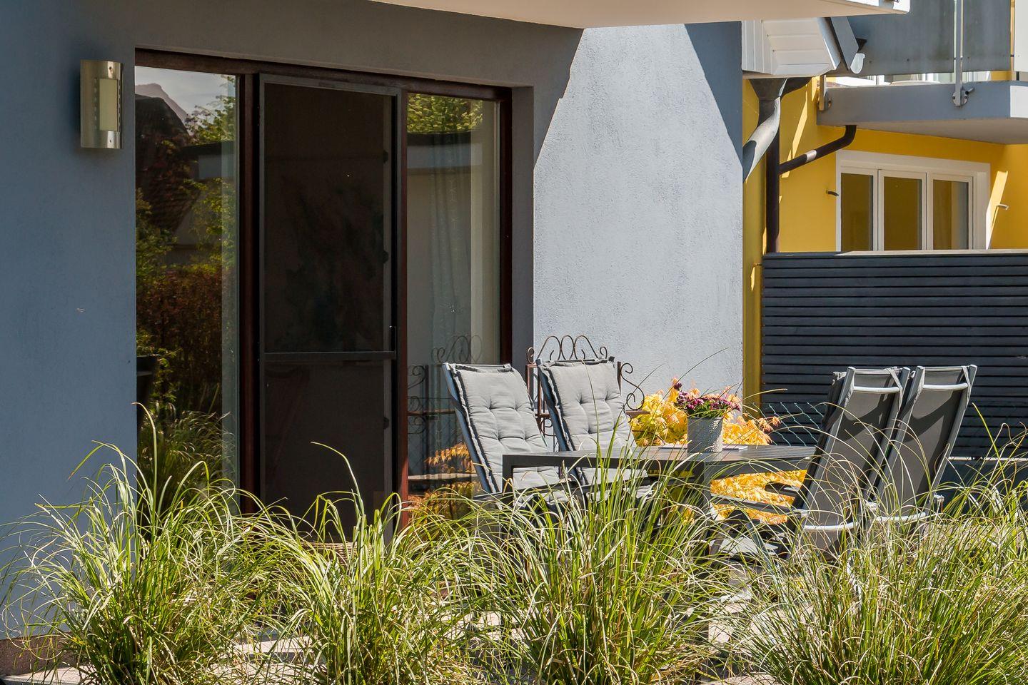 Eine kleine Terrasse gehört ebenfalls zur Ferienunterkunft und kann vom Wohnbereich betreten werden. Hier kannst du deinen Urlaubstag bei einem sonnigen Frühstück starten oder am Abend ausklingen lassen. Auf dem 650 Quadratmeter großen Grundstück mit kleiner Rasenfläche befindet sich eine Sitzbank. In dem Nebengebäude steht ein Grill für alle Feriengäste des Hauses zur Verfügung. Ein Pkw-Stellplatz je Wohnung steht zur Verfügung.