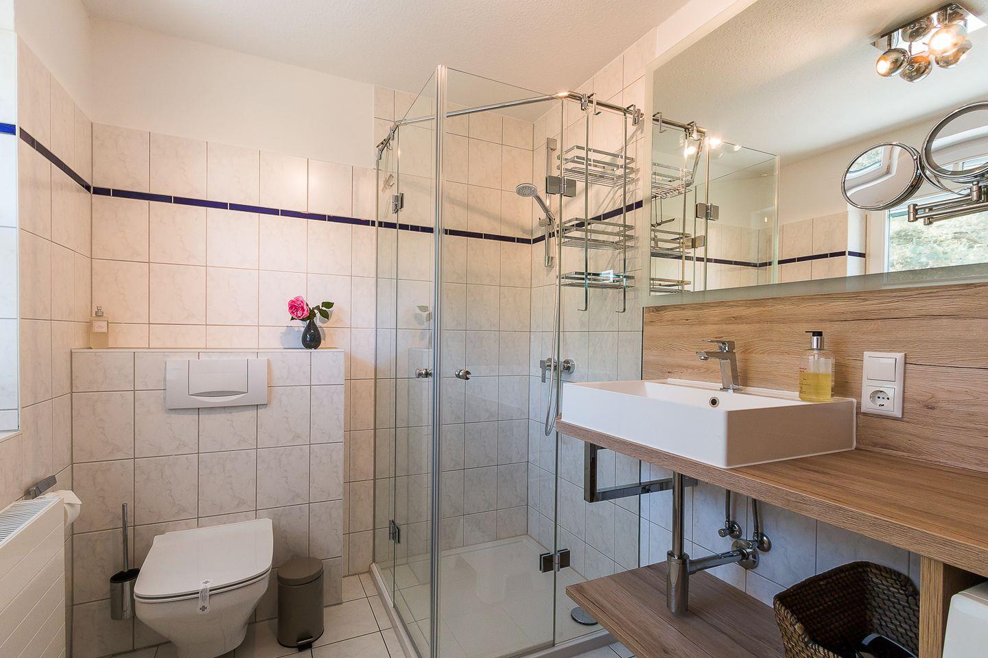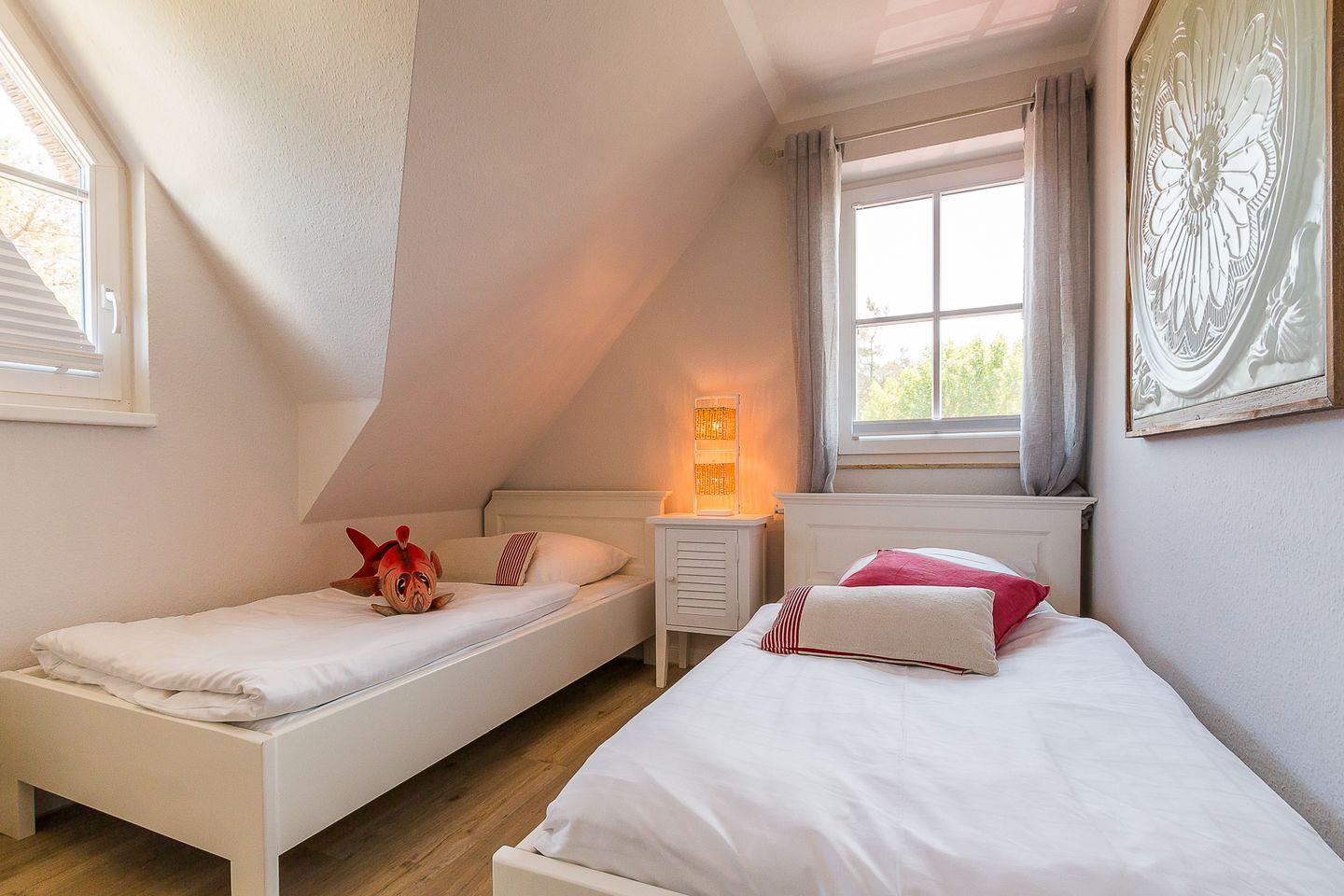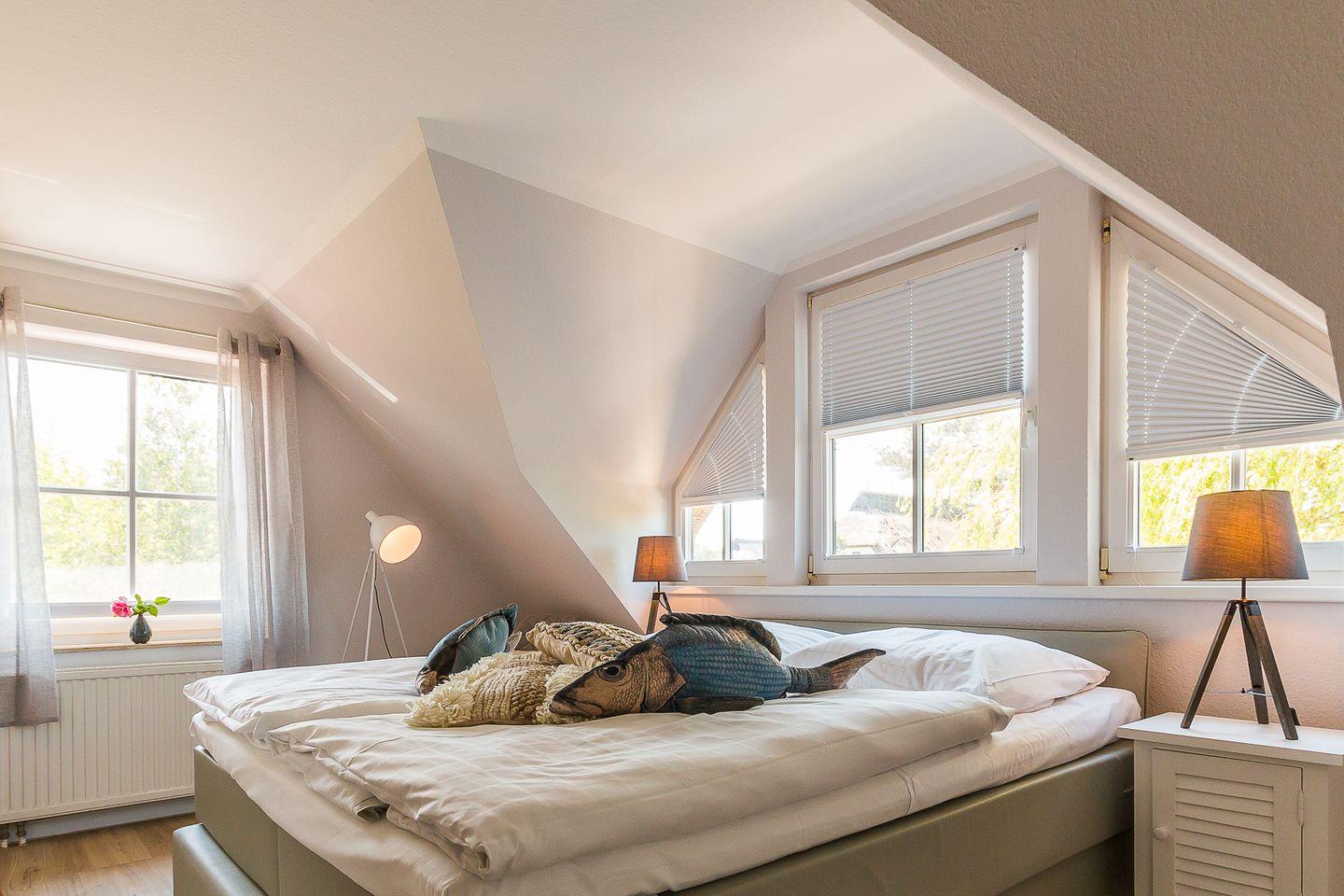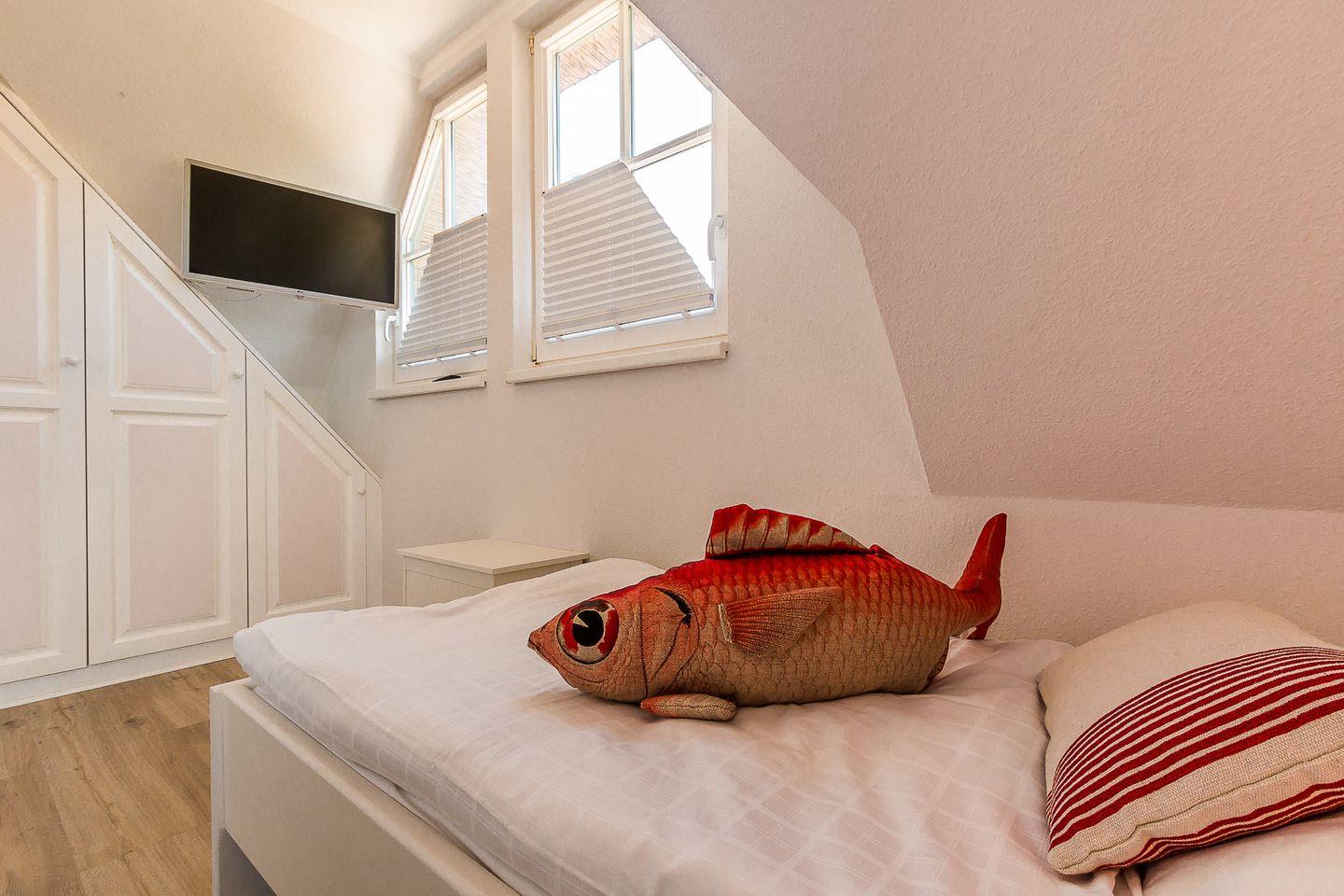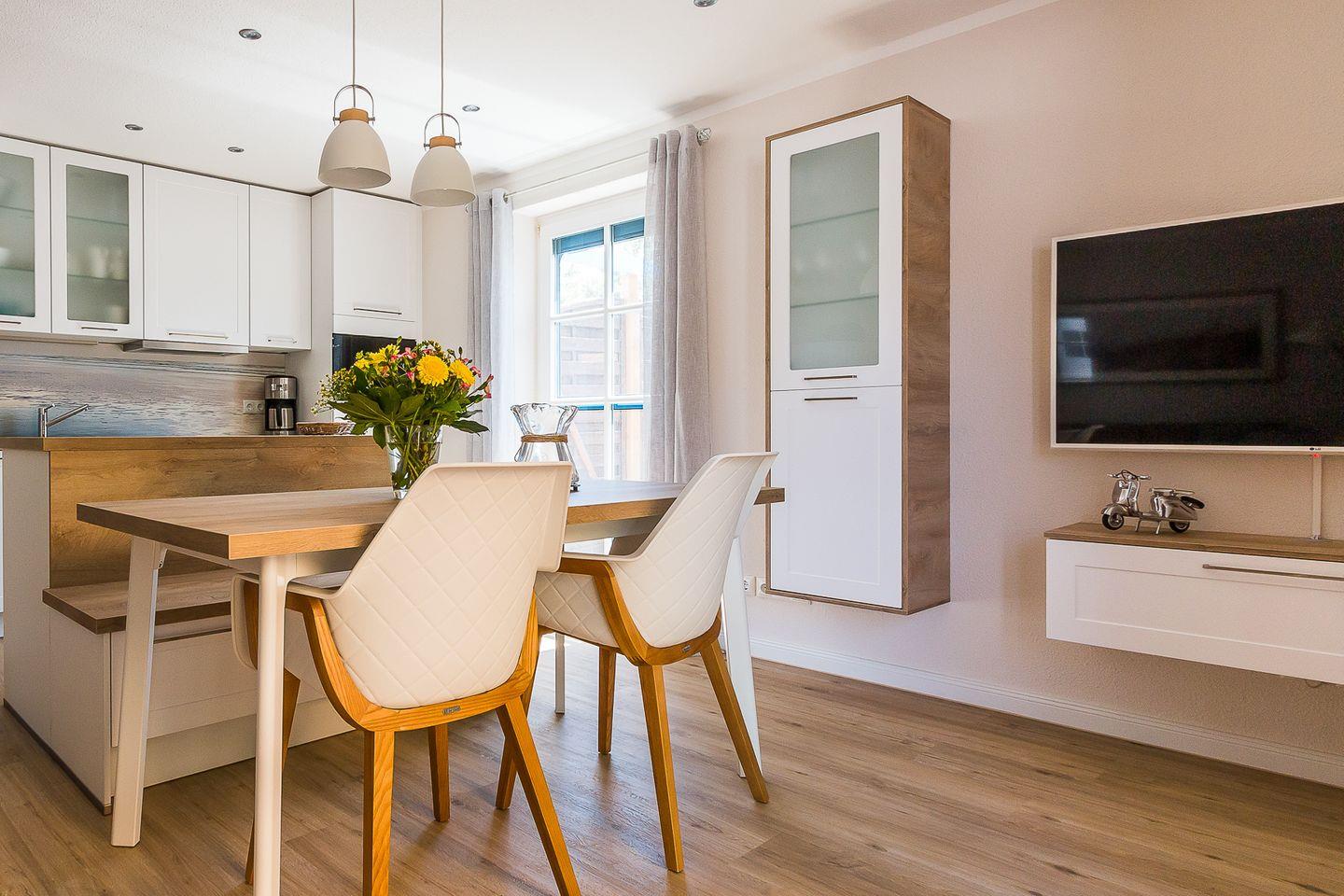 Im Erdgeschoss befindet sich der Wohnbereich und Mittelpunkt des kleinen und sehr gemütlichen Ferienhauses. Lichtdurchflutet dank bodentiefer Fernster kannst du es dir hier auf dem Sofa mit Kaminecke gemütlich machen. Die moderne Küchenzeile mit Tresen und Essbereich fügt sich harmonisch in den Wohnraum ein. Hier kannst du relaxen, kochen, klönen – ob zu zweit oder mit der Familie. Auch das Tageslichtbad mit Dusche/ WC befindet sich auf der unteren Etage. Über die Treppe gelangst du ins Obergeschoss. Hier befinden sich die zwei Schlafzimmer – eins mit Doppelbett und eins mit zwei Einzelbetten und zusätzlichem TV ausgestattet. Das gesamte Ferienhaus ist passend zur Umgebung im Seaside-Stil eingerichtet. Helle Farben und Materialien sorgen für ein traumhaftes Urlaubsgefühl.