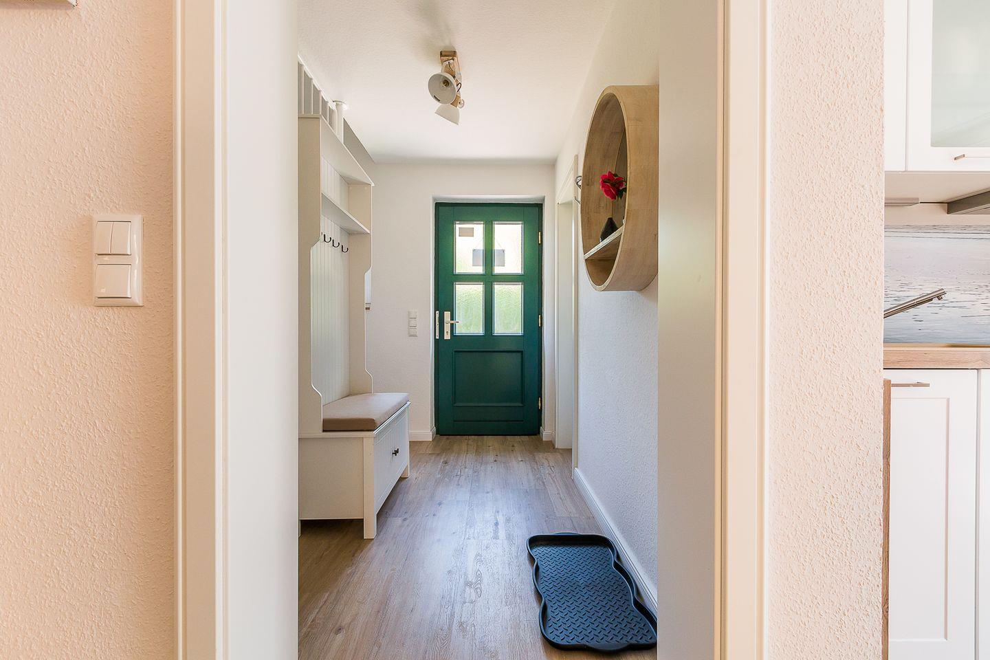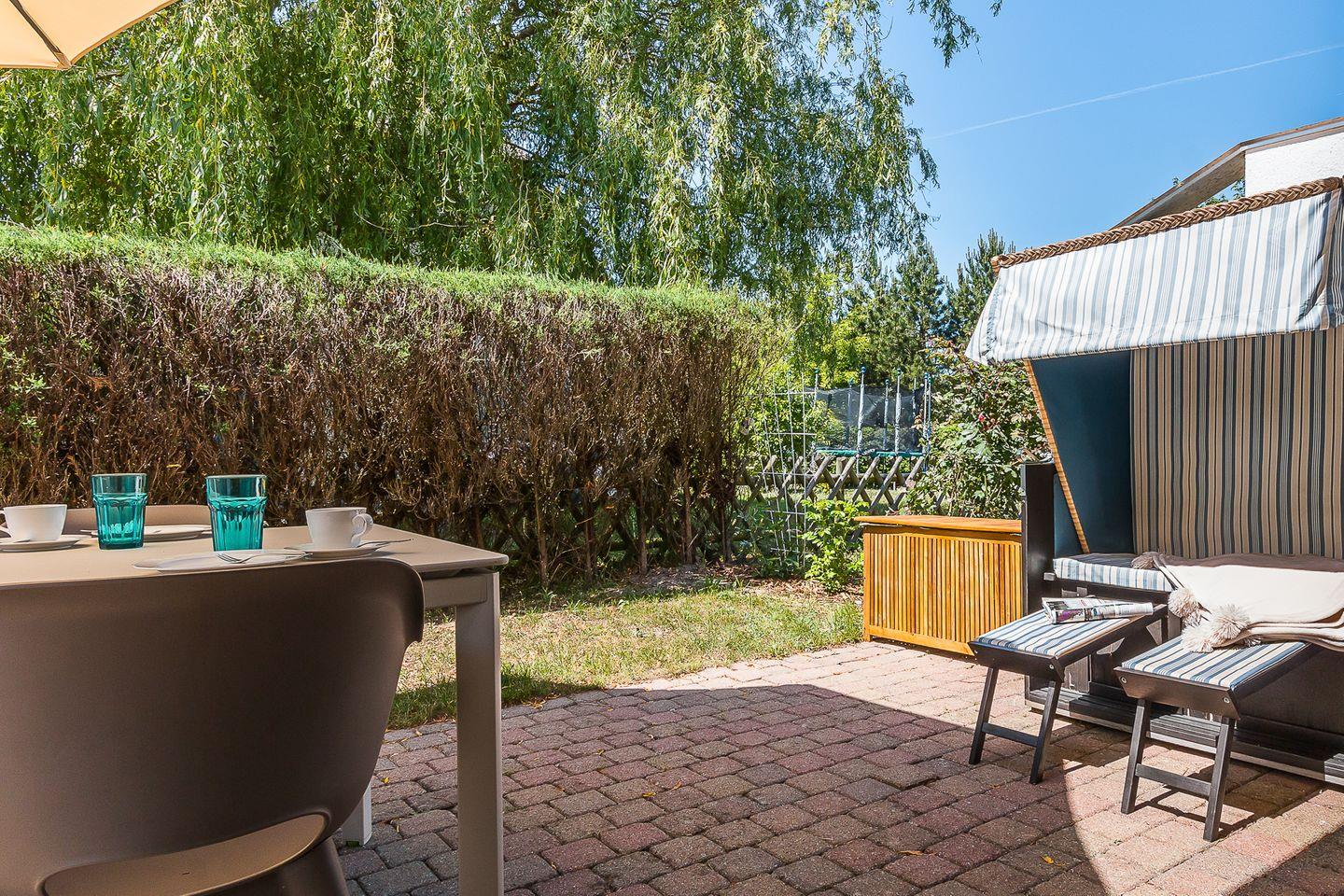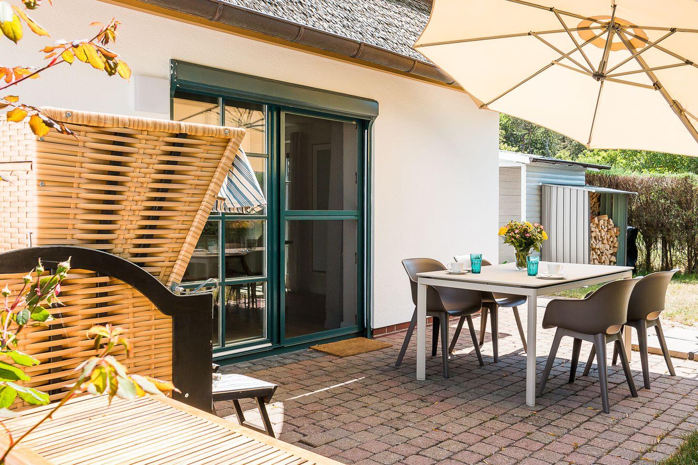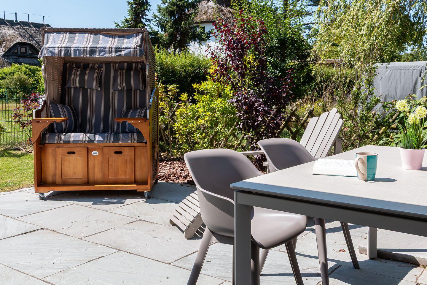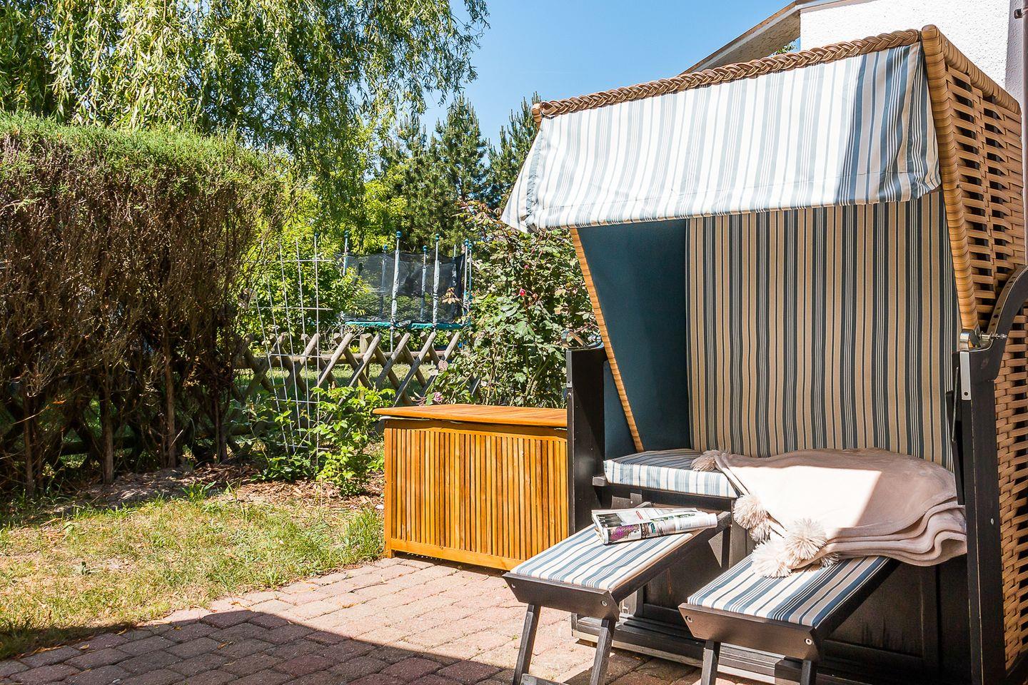 Zum Außenbereich gehört eine Terrasse. Hier kannst du deinen Urlaub mit einem sonnigen Frühstück starten oder am Abend ausklingen lassen. Der hauseigene Strandkorb lädt außerdem zu entspannten Stunden im Garten ein. Zum Ferienhaus gehören zwei PKW-Stellplätze und ein Gartenhaus.