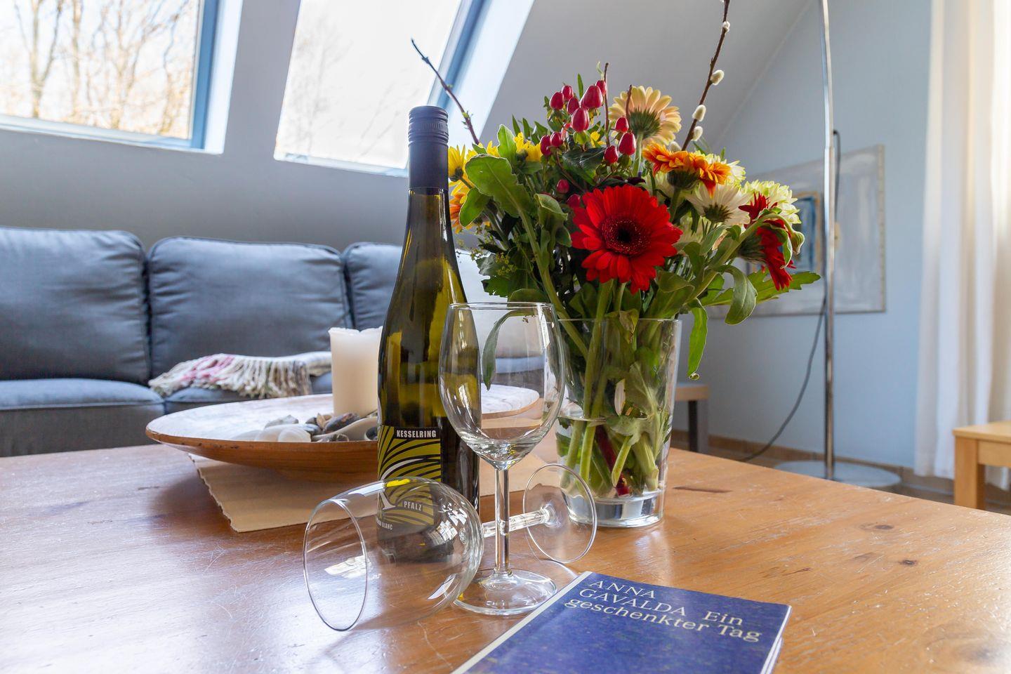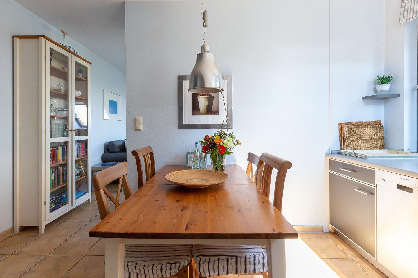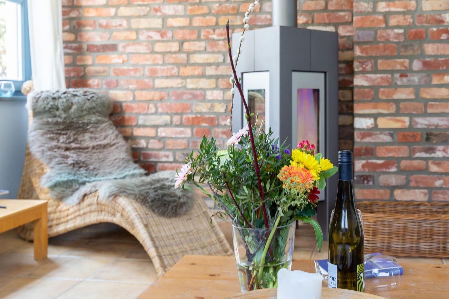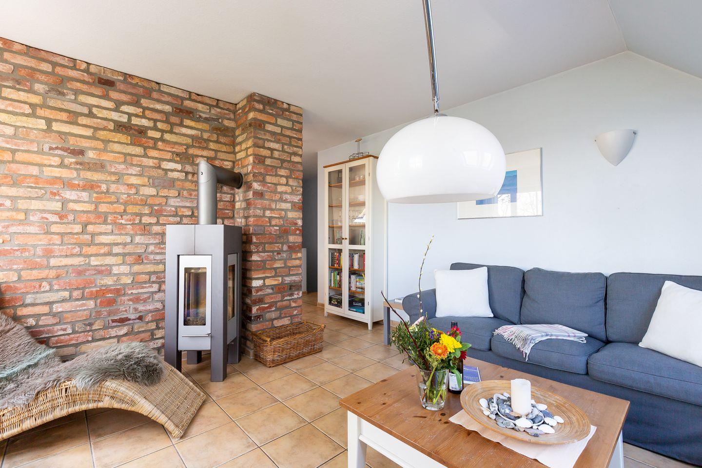 Die großzügige Maisonette-Ferienwohnung wurde liebevoll eingerichtet und strahlt mit ihren hellen Räumen und der maritimen Farbengestaltung passend zum Meer eine herrliche Urlaubsatmosphäre aus. Im Erdgeschoss befinden sich die zwei heimeligen Schlafzimmer der Wohnung. Das Hauptschlafzimmer ist mit einem Doppelbett und Kleiderschrank ausgestattet. Von hieraus hat man auch den Zutritt zur Terrasse. Das zweite Schlafzimmer - ebenso schön und gemütlich - unterscheidet sich nur durch die getrennten Betten. Auch das Tageslichtbad mit Dusche, Fön und Handtuchhalter befindet sich auf der unteren Etage. Über die Treppe gelangst du in den offen gestalteten Wohnbereich. Die vielen Fenster mit wundervollem Blick auf den Deich, der knisternde Kamin, das knuffige Sofa und die kuschelige Relaxliege machen den Wohnbereich zum absoluten Lieblingsplatz. Hier lässt es sich nicht nur ausgezeichnet klönen, sondern auch kochen. Denn die vollausgestattete Küche befindet sich gleich neben an und bietet alles, was du zum Kochen und Genießen im Urlaub brauchst.