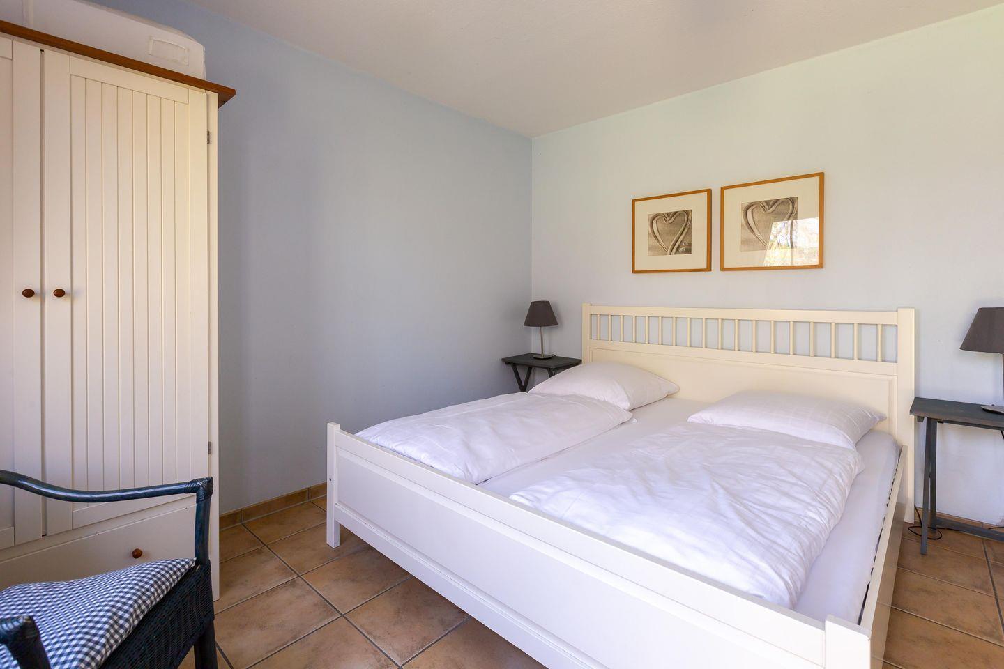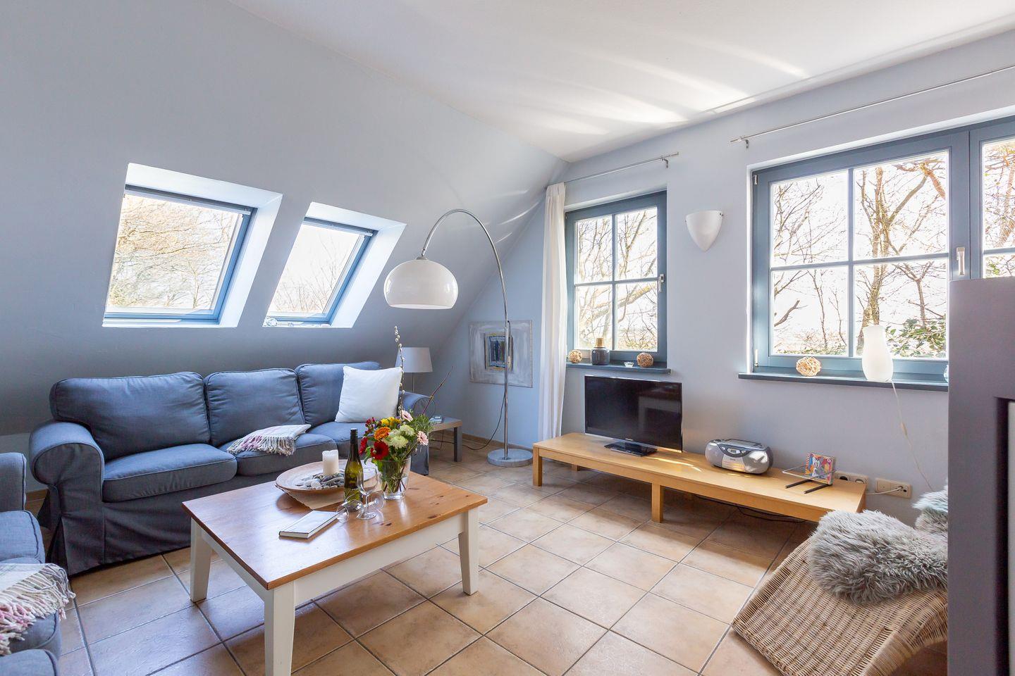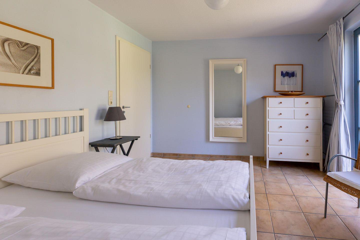 Die großzügige Maisonette-Ferienwohnung wurde liebevoll eingerichtet und strahlt mit ihren hellen Räumen und der maritimen Farbengestaltung passend zum Meer eine herrliche Urlaubsatmosphäre aus. Im Erdgeschoss befinden sich die zwei heimeligen Schlafzimmer der Wohnung. Das Hauptschlafzimmer ist mit einem Doppelbett und Kleiderschrank ausgestattet. Von hieraus hat man auch den Zutritt zur Terrasse. Das zweite Schlafzimmer - ebenso schön und gemütlich - unterscheidet sich nur durch die getrennten Betten. Auch das Tageslichtbad mit Dusche, Fön und Handtuchhalter befindet sich auf der unteren Etage. Über die Treppe gelangst du in den offen gestalteten Wohnbereich. Die vielen Fenster mit wundervollem Blick auf den Deich, der knisternde Kamin, das knuffige Sofa und die kuschelige Relaxliege machen den Wohnbereich zum absoluten Lieblingsplatz. Hier lässt es sich nicht nur ausgezeichnet klönen, sondern auch kochen. Denn die vollausgestattete Küche befindet sich gleich neben an und bietet alles, was du zum Kochen und Genießen im Urlaub brauchst.