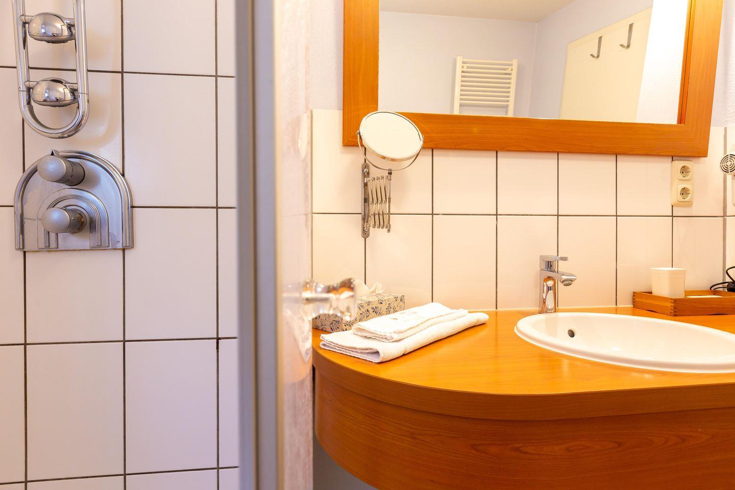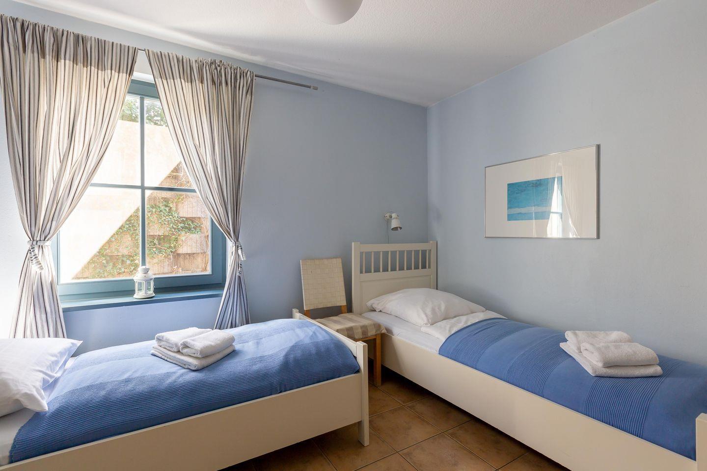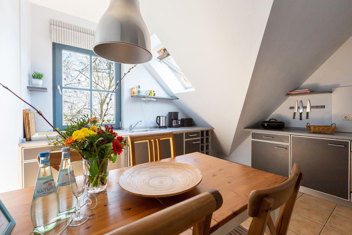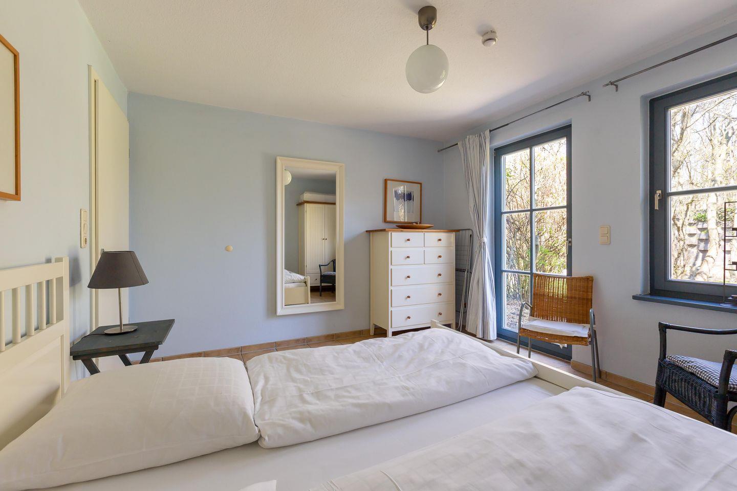 Die großzügige Maisonette-Ferienwohnung wurde liebevoll eingerichtet und strahlt mit ihren hellen Räumen und der maritimen Farbengestaltung passend zum Meer eine herrliche Urlaubsatmosphäre aus. Im Erdgeschoss befinden sich die zwei heimeligen Schlafzimmer der Wohnung. Das Hauptschlafzimmer ist mit einem Doppelbett und Kleiderschrank ausgestattet. Von hieraus hat man auch den Zutritt zur Terrasse. Das zweite Schlafzimmer - ebenso schön und gemütlich - unterscheidet sich nur durch die getrennten Betten. Auch das Tageslichtbad mit Dusche, Fön und Handtuchhalter befindet sich auf der unteren Etage. Über die Treppe gelangst du in den offen gestalteten Wohnbereich. Die vielen Fenster mit wundervollem Blick auf den Deich, der knisternde Kamin, das knuffige Sofa und die kuschelige Relaxliege machen den Wohnbereich zum absoluten Lieblingsplatz. Hier lässt es sich nicht nur ausgezeichnet klönen, sondern auch kochen. Denn die vollausgestattete Küche befindet sich gleich neben an und bietet alles, was du zum Kochen und Genießen im Urlaub brauchst.
