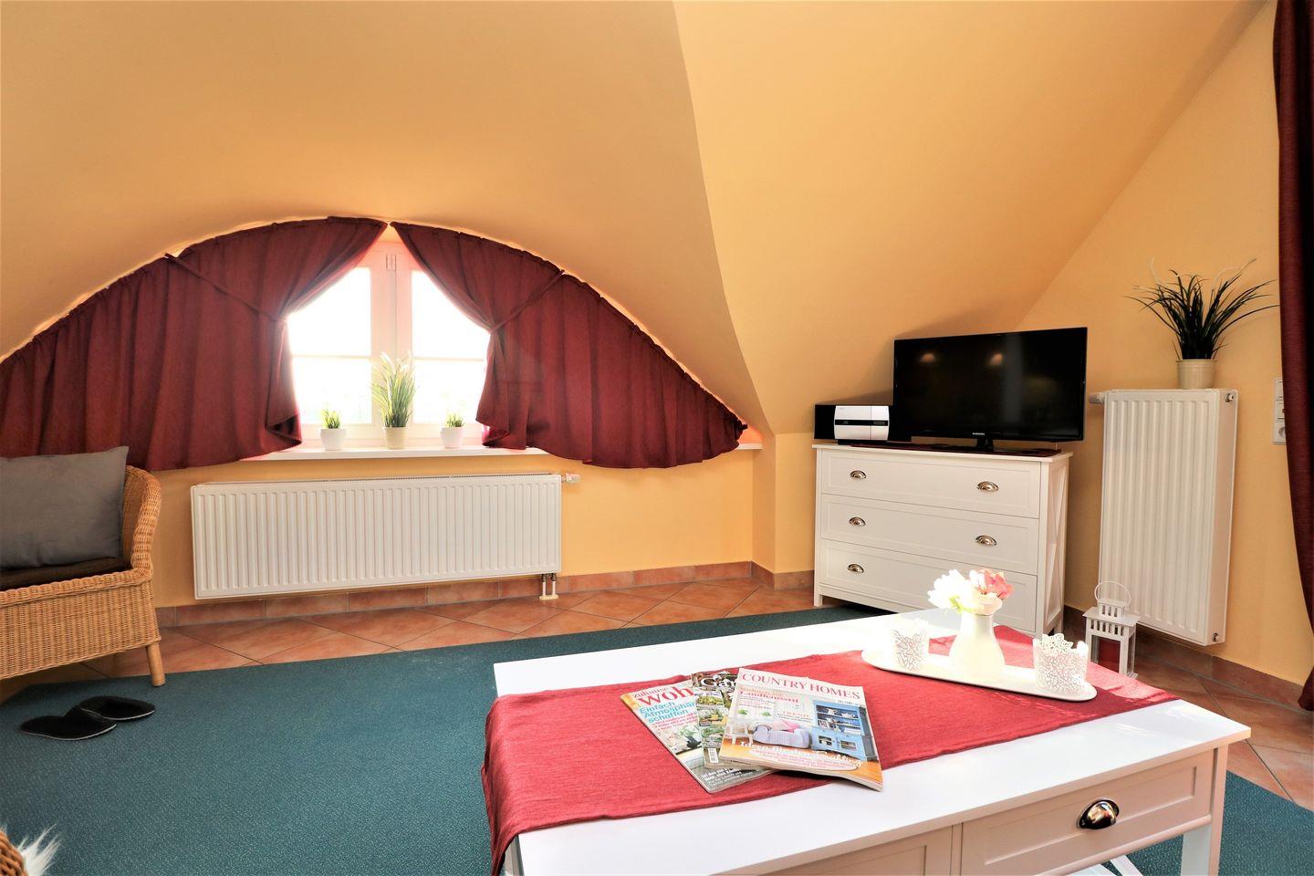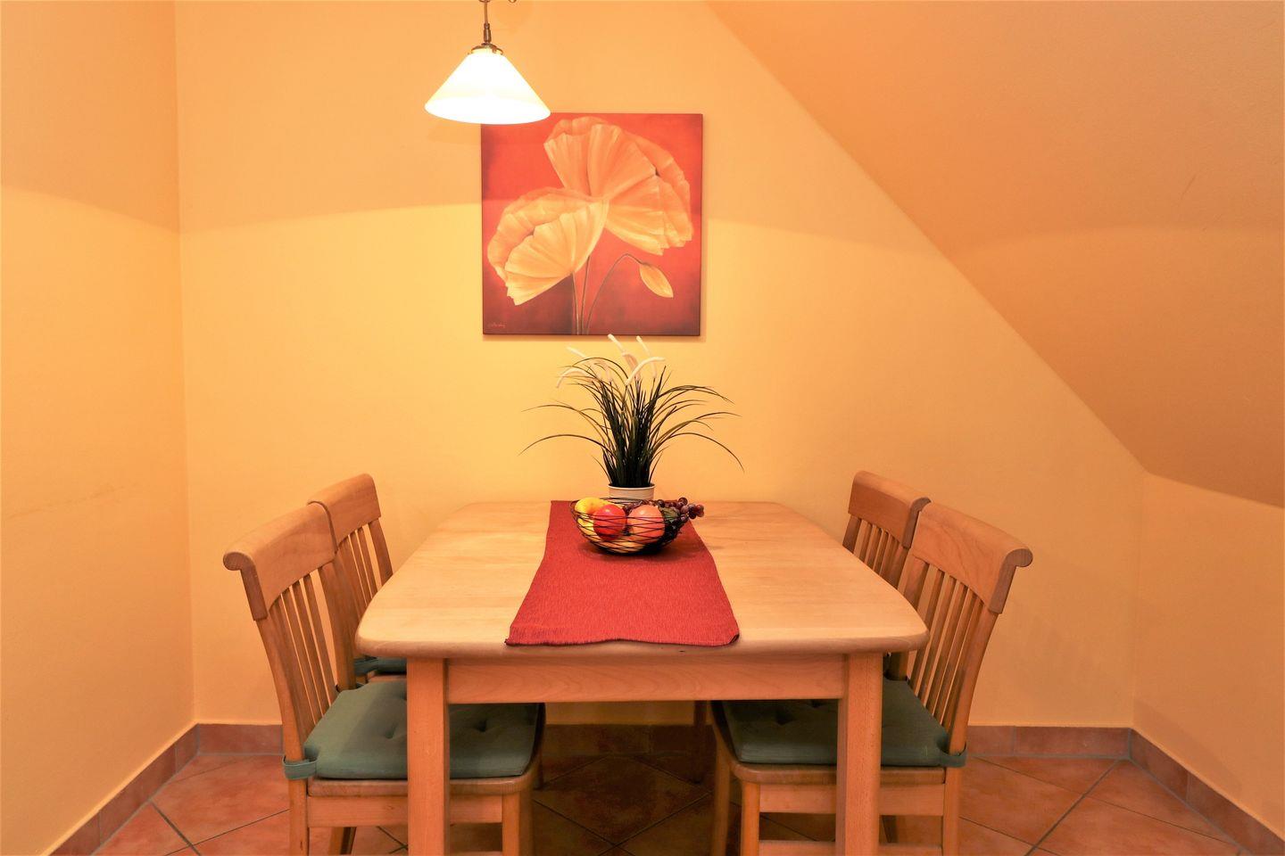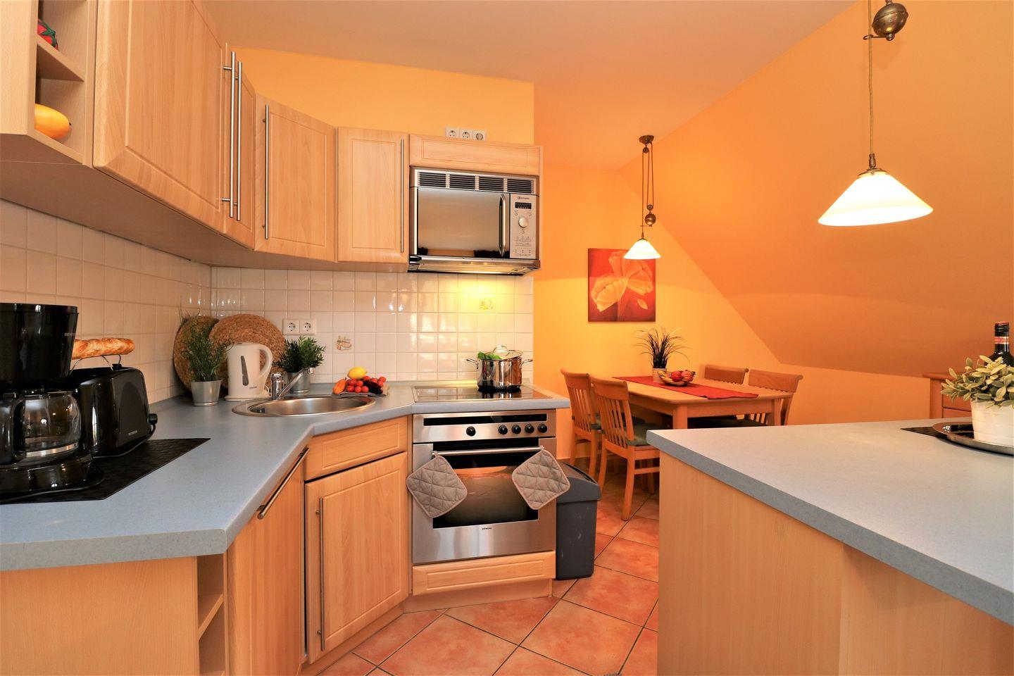 Die Ferienwohnung besteht aus einem komfortablen Schlafzimmer und einem gemütlichen Wohnzimmer, das zum Entspannen nach einem erlebnisreichen Tag einlädt. Die offene Küche, ausgestattet mit modernen Annehmlichkeiten wie einer Spülmaschine, einem Backofen und einem Kühlschrank mit Gefrierfach, bietet Ihnen die Möglichkeit, Ihre Lieblingsgerichte zu zaubern. Genießen Sie Ihre Mahlzeiten im Essbereich oder lassen Sie den Abend auf der gemütlichen Sofaecke ausklingen, während Sie einen Film auf dem Flachbildfernseher schauen oder ein spannendes Buch lesen.