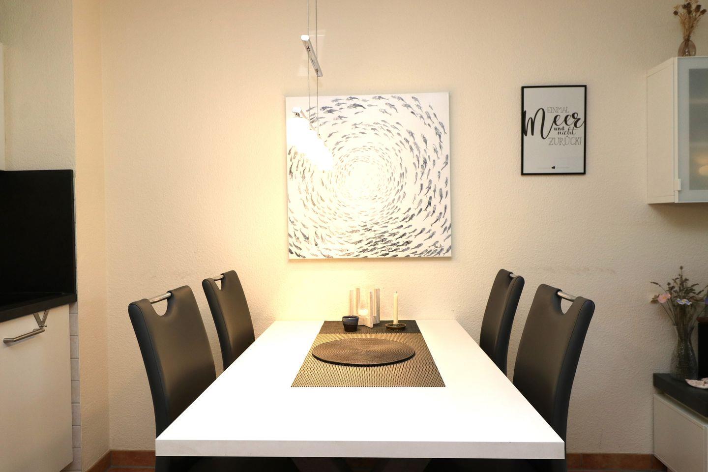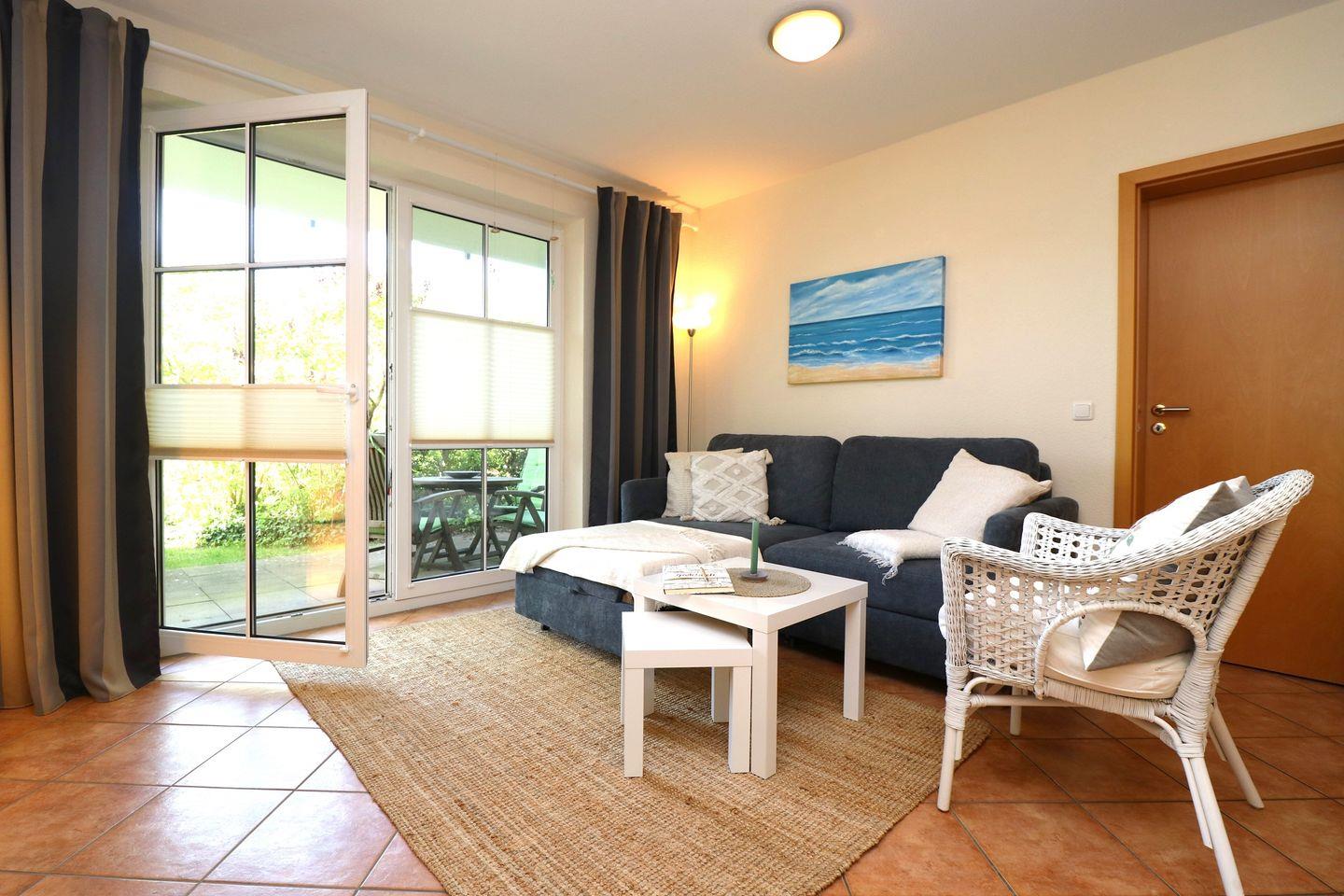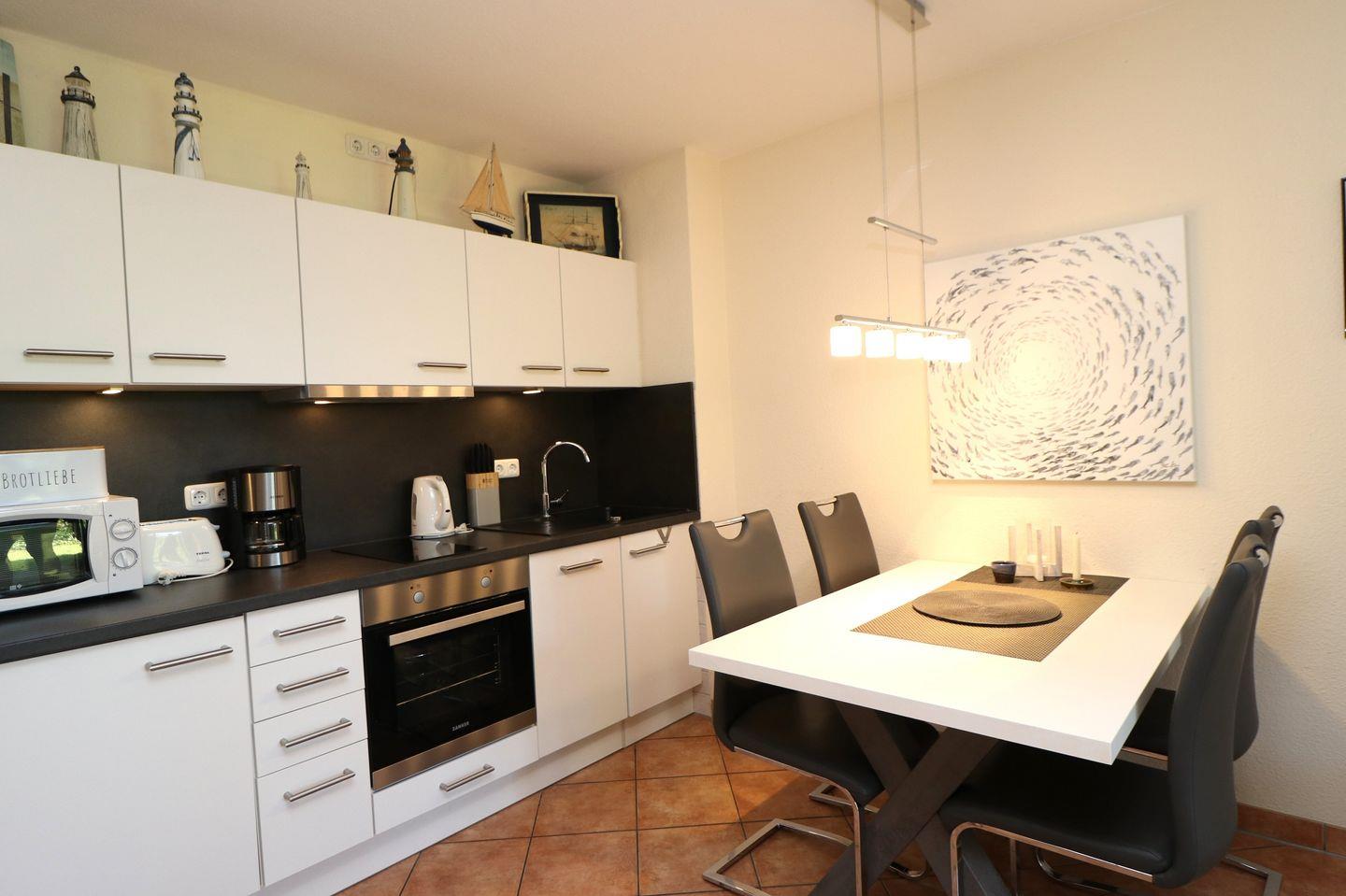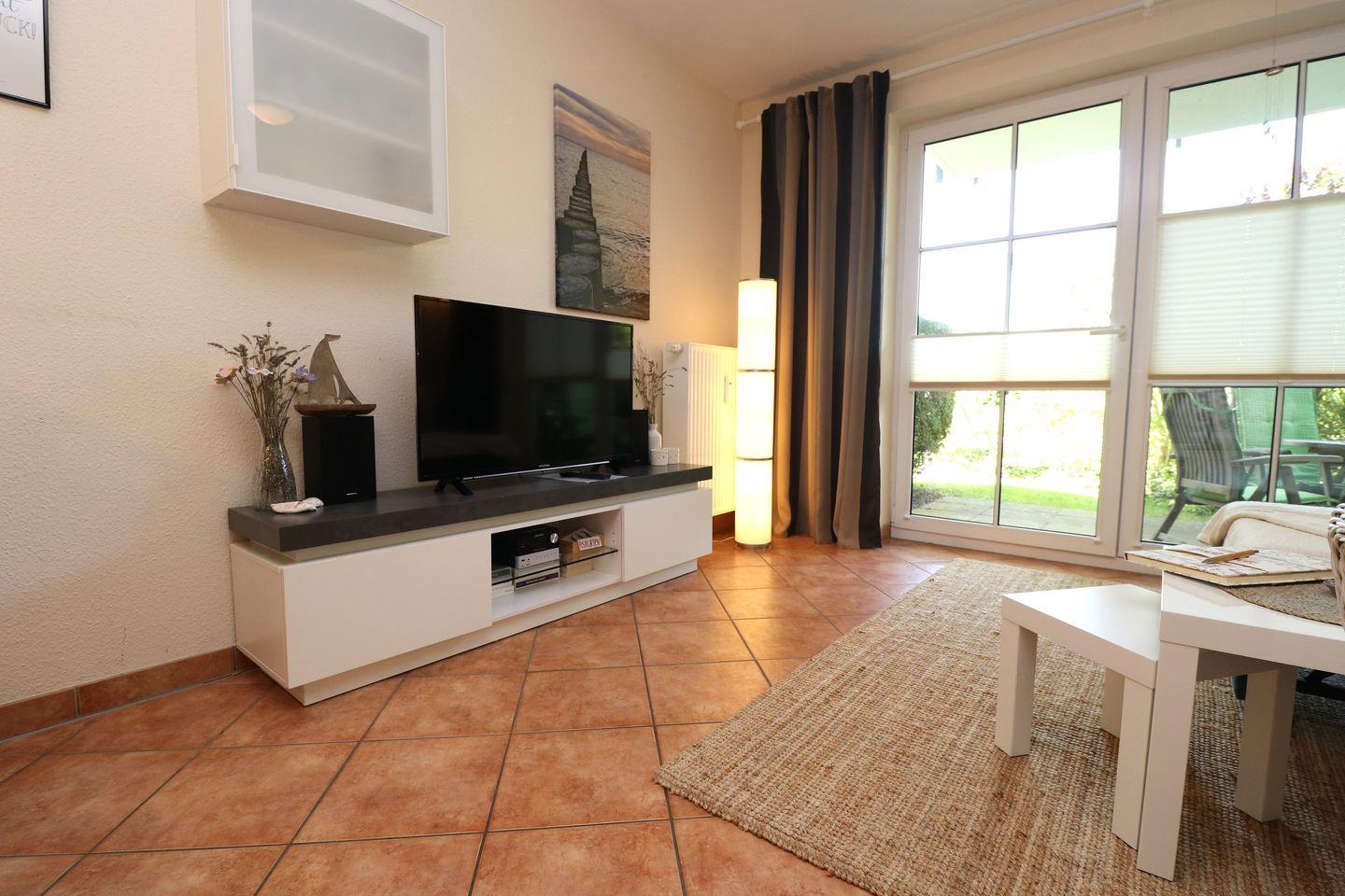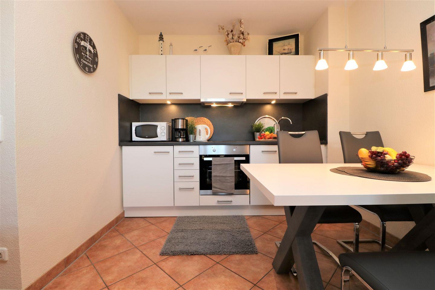 Die Wohnung ist im Erdgeschoss gelegen und verfügt über ein gemütliches Schlafzimmer mit einem stilvollen Fliesenboden, das Ihnen einen erholsamen Schlaf garantiert. Ein zusätzliches Schlafsofa im Wohnzimmer bietet Platz für weitere Gäste. Das offene Wohnkonzept verbindet den Wohnbereich mit der modernen, voll ausgestatteten Küche, die keine Wünsche offenlässt. Hier finden Sie alles, was Sie für die Zubereitung Ihrer Lieblingsgerichte benötigen, einschließlich einer Spülmaschine, einer Mikrowelle, einem Backofen und einem Kühlschrank mit Gefrierfach. Genießen Sie Ihre Mahlzeiten am Esstisch oder entspannen Sie in der Sofaecke, während Sie die beiden Fernseher mit Satellitenanschluss nutzen.