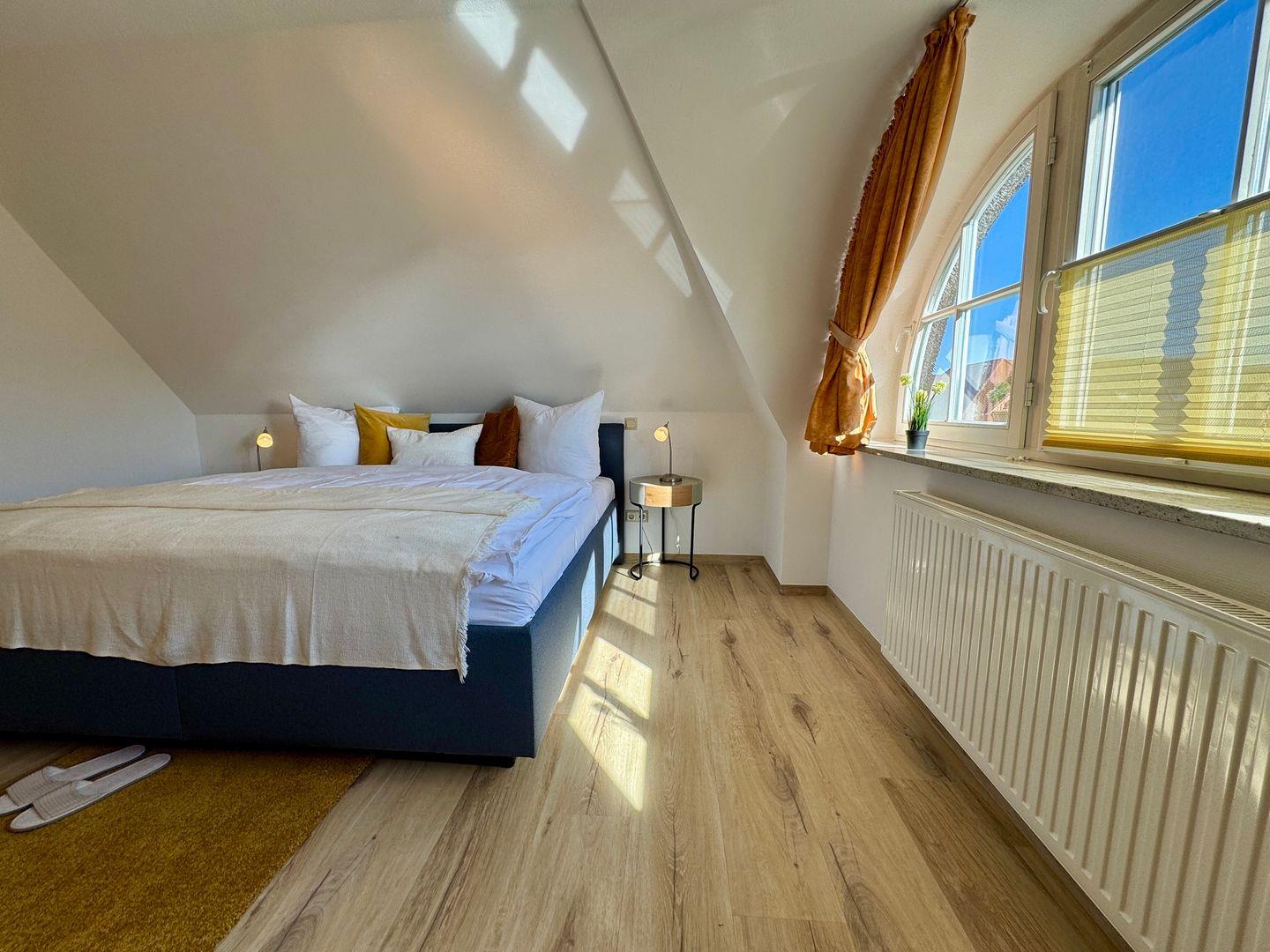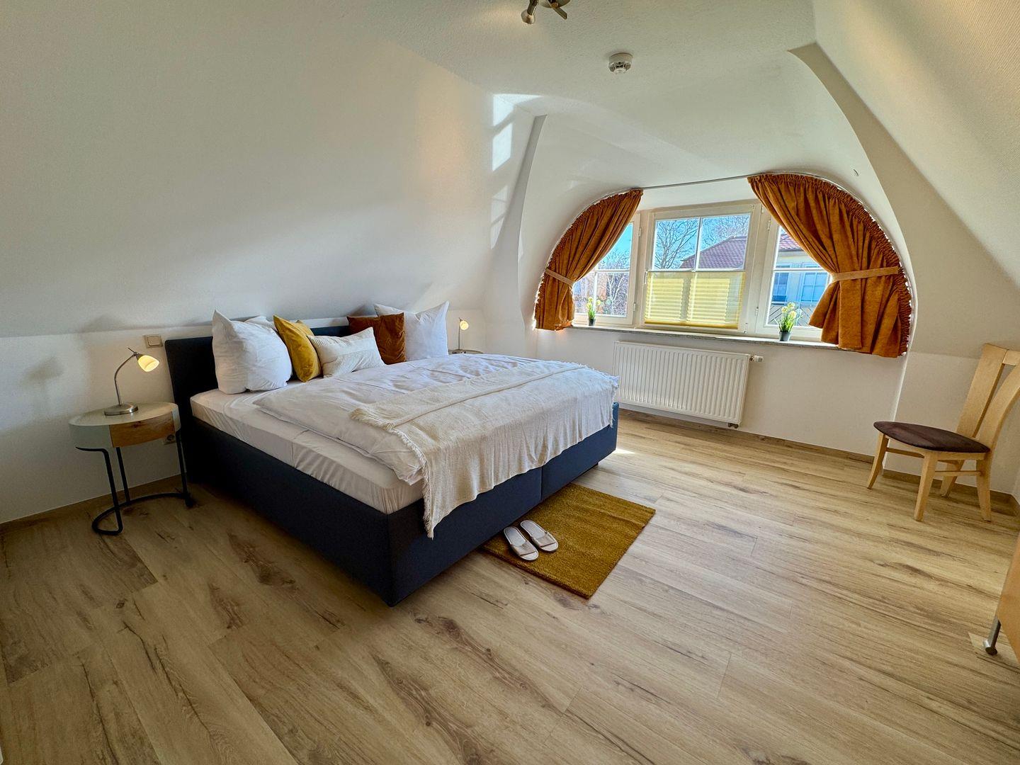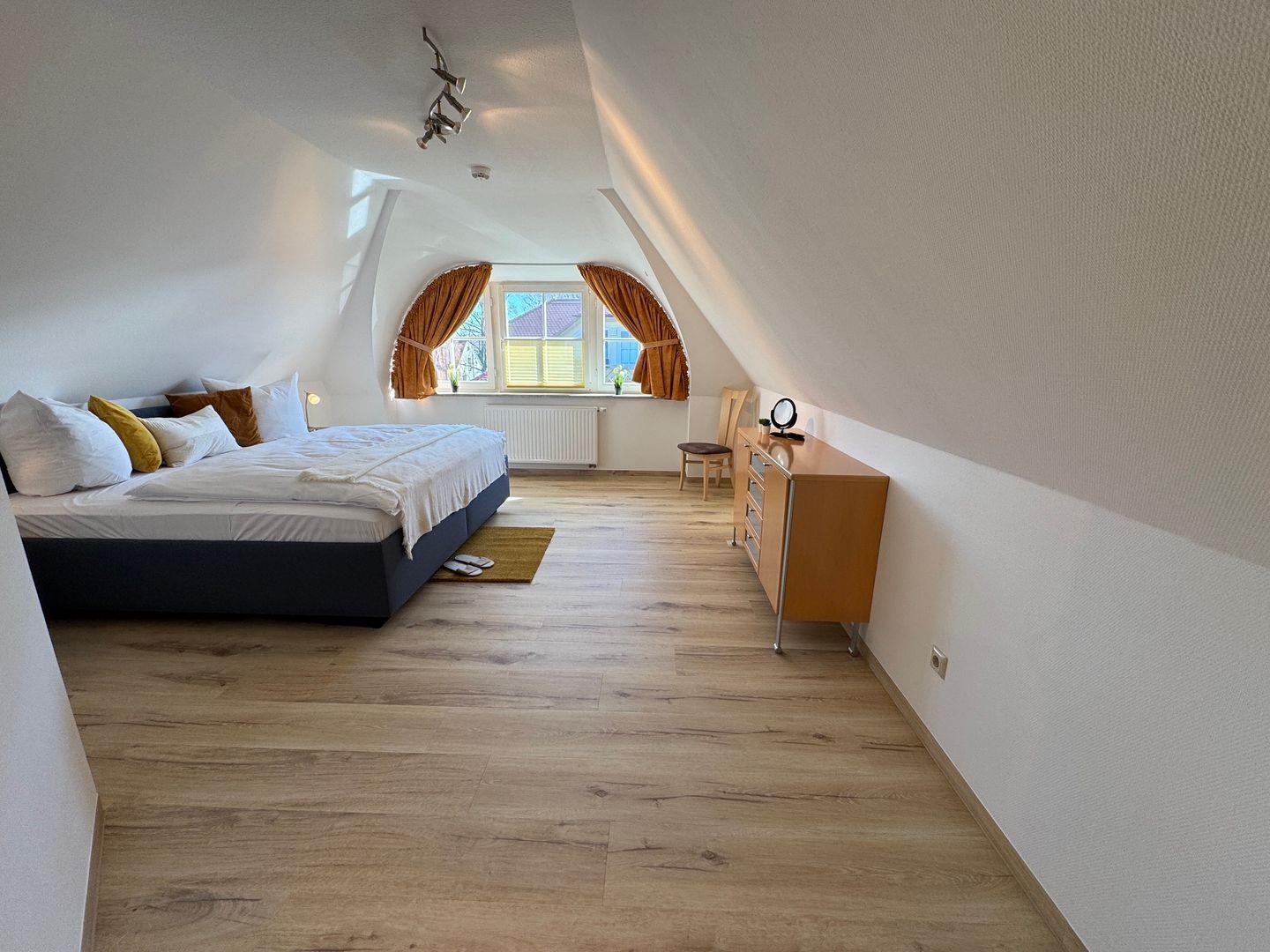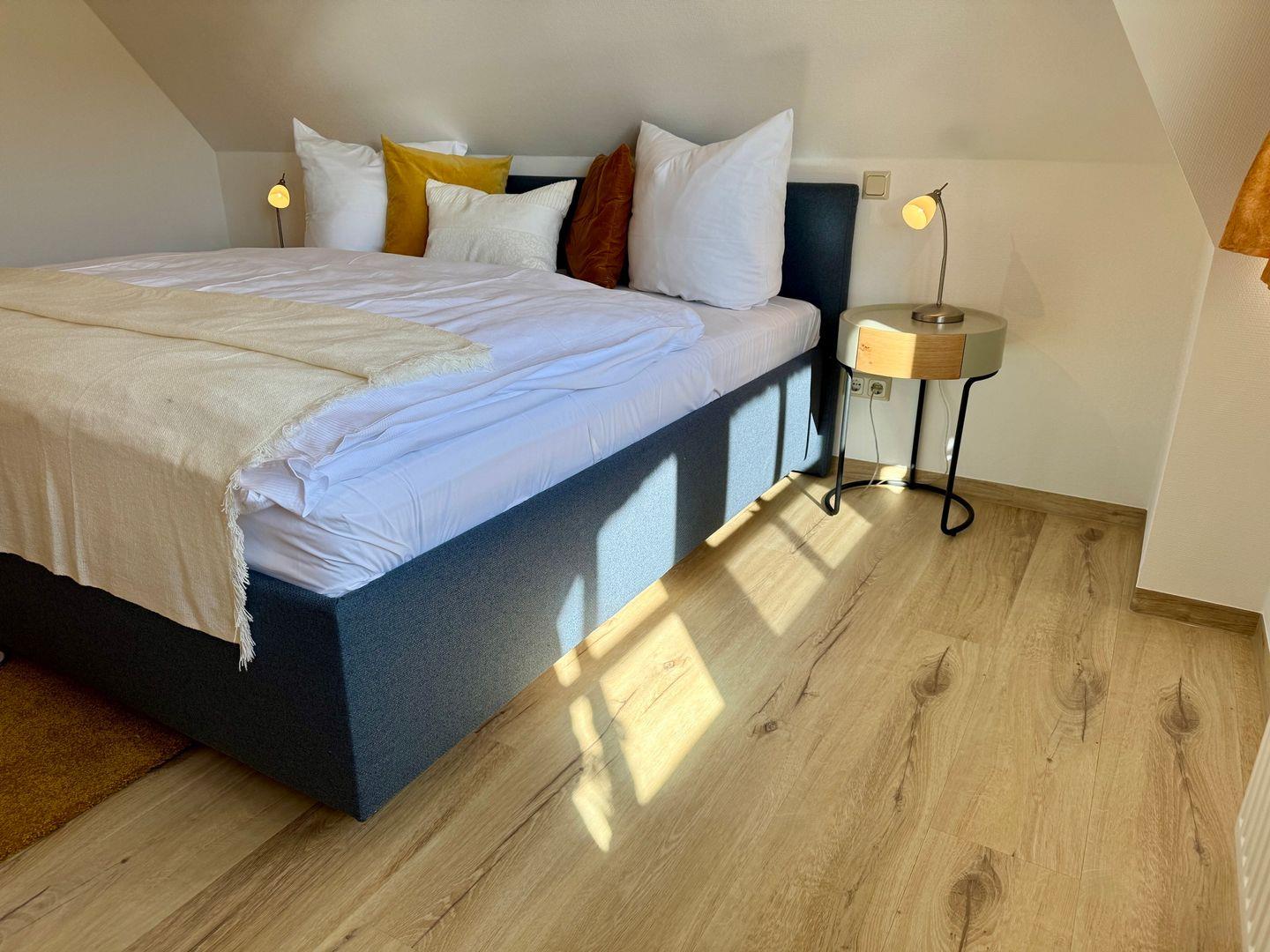 Das Schlafzimmer ist ein einladender Rückzugsort und lädt mit seinem bequemen Boxspringbett zu erholsamen Nächten ein. Ein zusätzliches Gäste-WC sowie ein Badezimmer mit bodengleich eingehender Dusche und Badewanne runden die Räumlichkeiten ab. Zudem stehen Ihnen eine Waschmaschine und ein Trockner zur Eigennutzung zur Verfügung, was besonders für längere Aufenthalte von Vorteil ist.