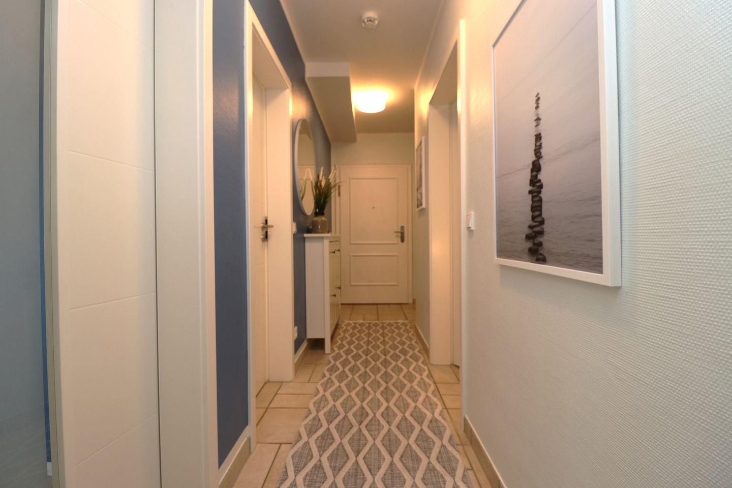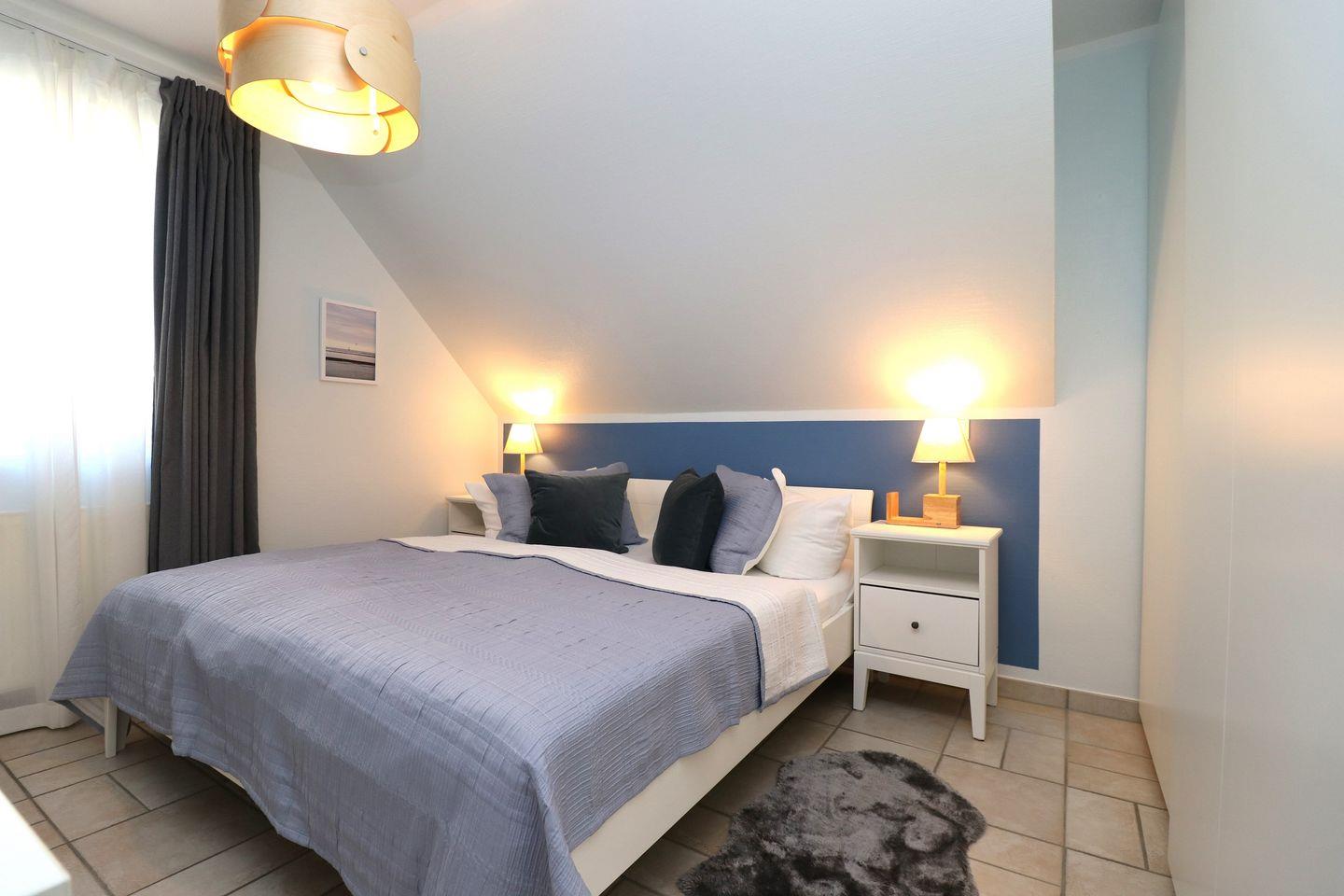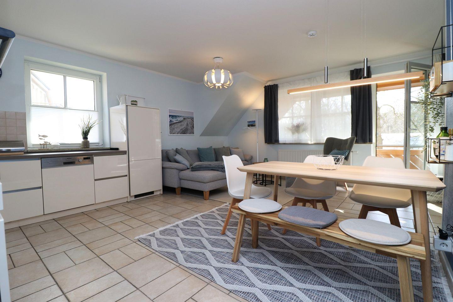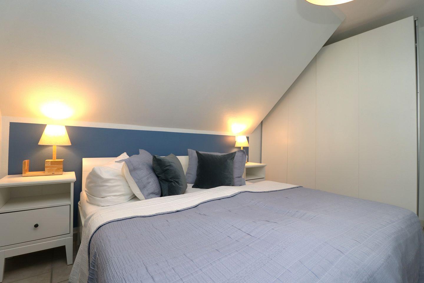 Ein geräumiges Appartement im Obergeschoss für maximal 5 Personen mit zwei Balkonen – einer nach Süden und der andere nach Osten ausgerichtet. Das Appartement bietet ein Wohnzimmer mit integrierter Küchenzeile, ein Schlafzimmer mit einem Doppelbett und ein weiteres Schlafzimmer mit einem Etagenbett für 3 Personen. Der Mietpreis gilt für 2 Personen, für jede weitere wird ein Aufpreis von 15€ berechnet. Das Badezimmer ist mit Dusche, WC und einer Waschmaschine ausgestattet. Hunde sind erlaubt, das Rauchen jedoch nicht. WLAN steht zur Verfügung, um Ihnen einen bequemen Internetzugang zu ermöglichen. Diesem Appartement wird der Tiefgaragenstellplatz Nr. 20 zugeordnet.