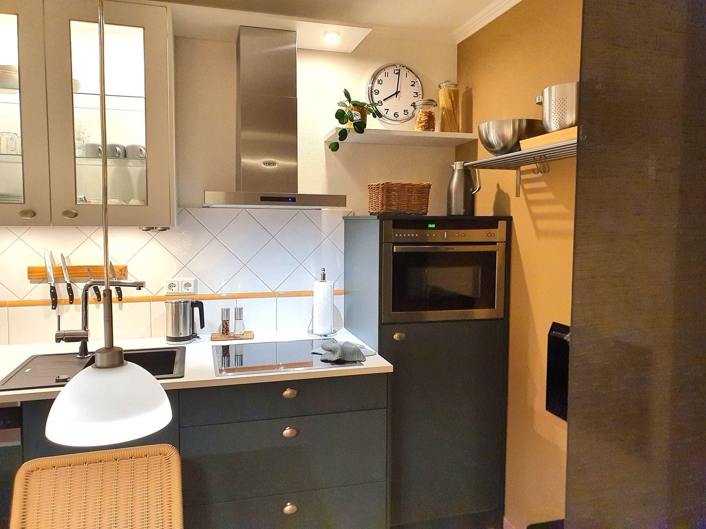 Im Wohnzimmer befinden sich bequeme Polstermöbel, u.a. ein komfortabler Fernsehsessel. Das Sofa kann mit nur wenigen Handgriffen in einen vollwertigen Schlafplatz umgewandelt werden. Ein Fernseher, Radio, Wlan usw. sind obligatorisch. Der Essplatz sowie die Einbauküche sind im Wohnbereich integriert. In der neuen Küche fehlt es an nichts. Es ist alles vorhanden, was eine Küche bieten muss. Küche, Essplatz und Wohnzimmer bilden eine harmonische, sehr wohnliche Einheit.