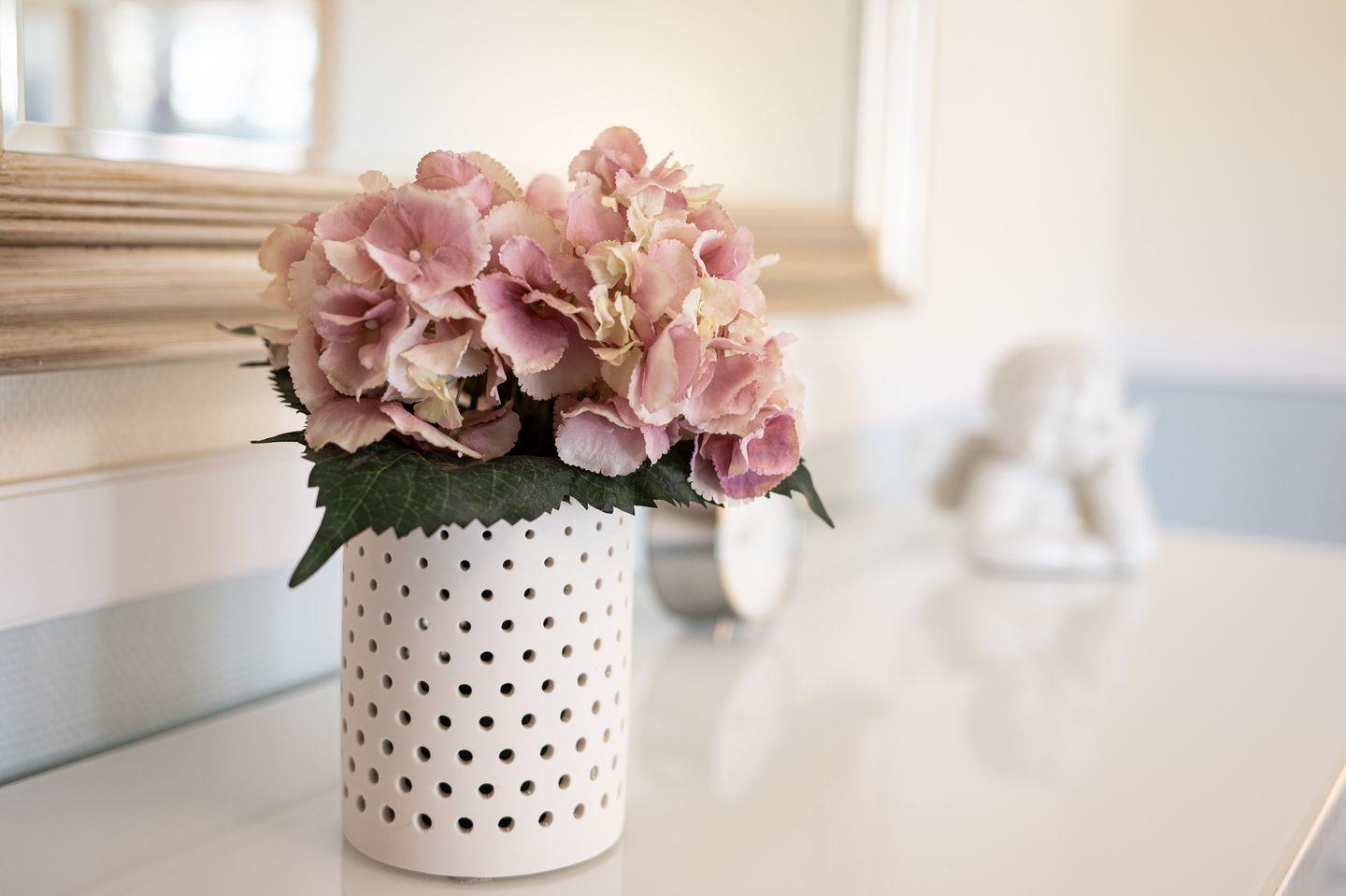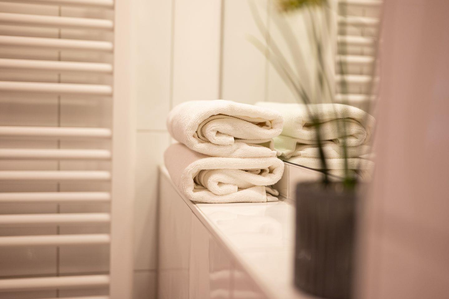 Das Badezimmer bietet ausreichend Platz. Die Dusche ist groß und ebenerdig.
