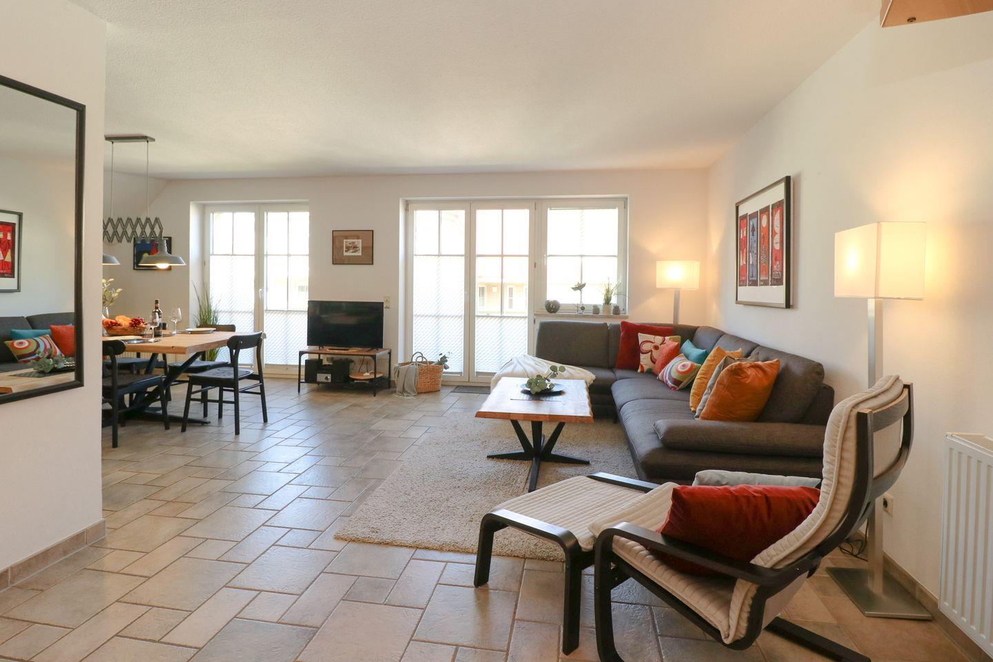 Ein großzügiges Maisonettappartement im Obergeschoss für maximal 4 Personen mit einem Balkon Richtung Westen. Das Appartement verfügt über ein Wohnzimmer mit integrierter Küchenzeile und zwei Schlafzimmer mit jeweils einem gemütlichem Doppelbett, für einen erholsamen Schlaf. Das Badezimmer verfügt über eine Dusche und WC. Haustiere und Rauchen sind nicht gestattet, jedoch gibt es WLAN für einen bequemen Internetzugang während des Aufenthalts. Diesem Appartement wird der Tiefgaragenstellplatz Nr. 72 zugeordnet.