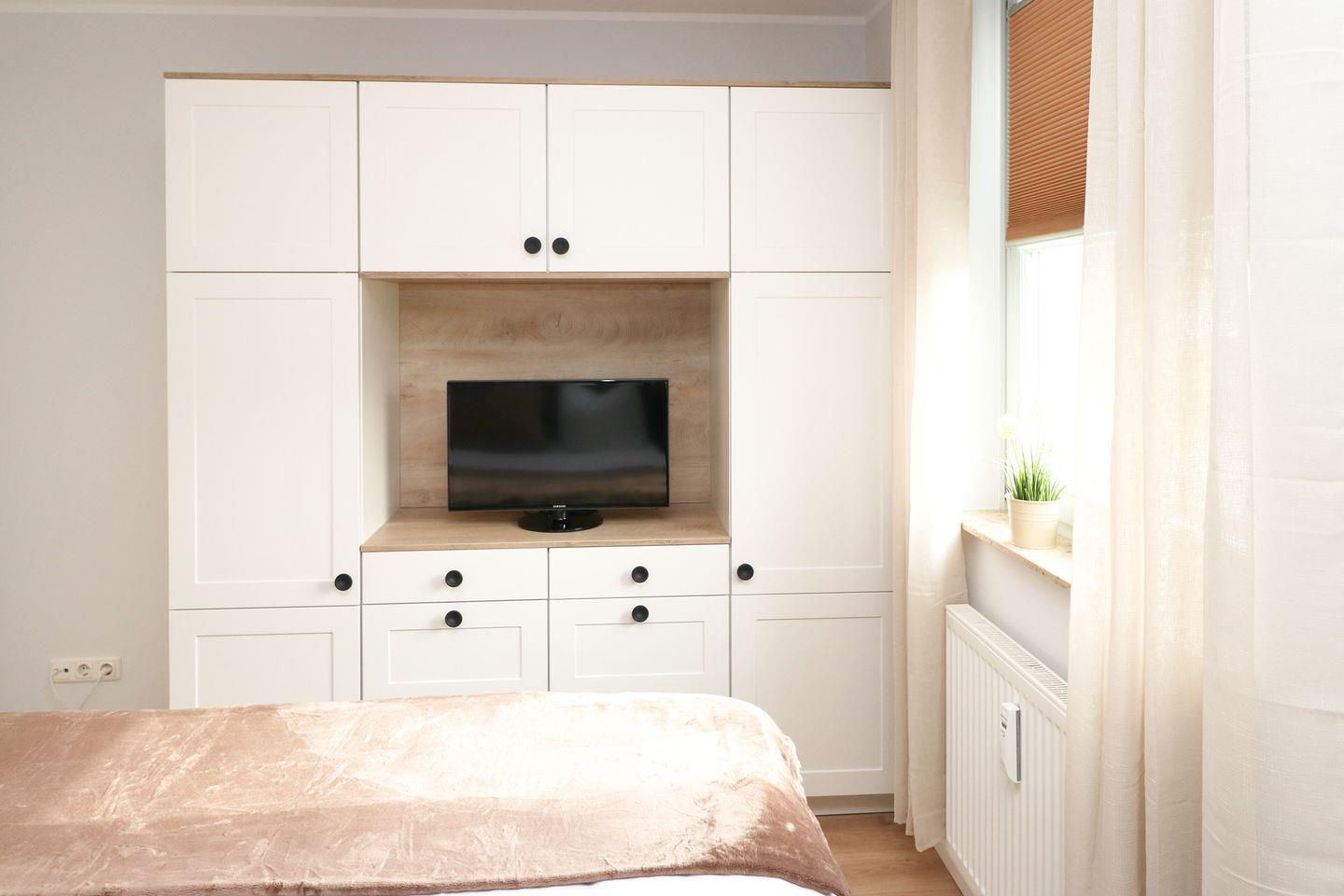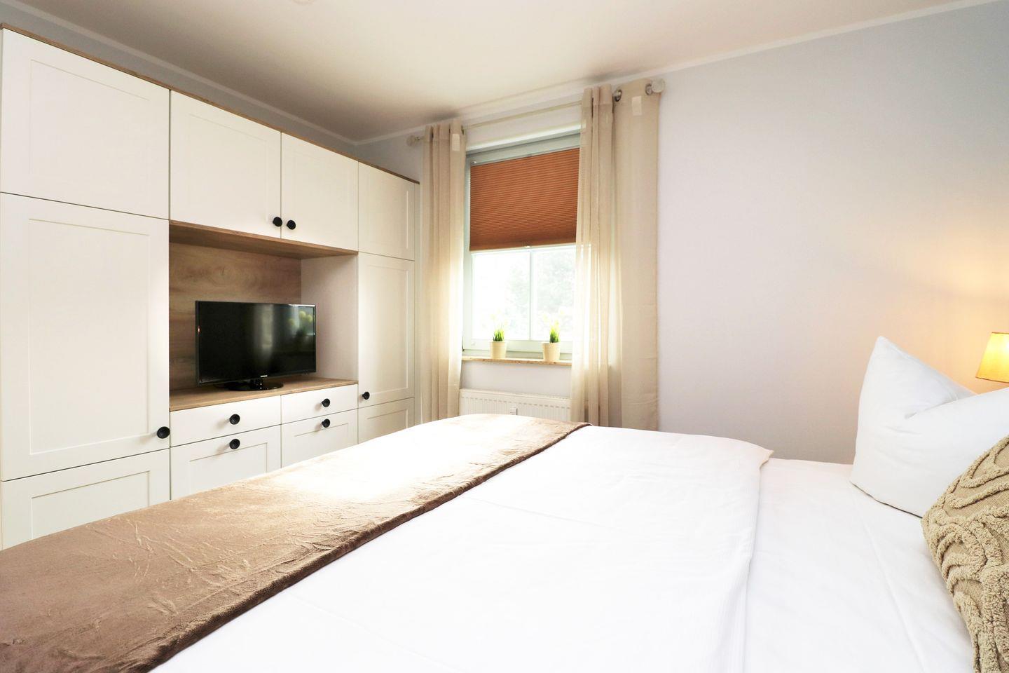 Die Wohnung umfasst ein gemütliches Schlafzimmer, ein helles Wohnzimmer mit einer Sofaecke und einem digitalen TV-Anschluss für entspannte Abende. Die offene Küche ist komplett ausgestattet mit modernen Annehmlichkeiten wie einem Cerankochfeld, Backofen, Kühlschrank mit Gefrierfach, Spülmaschine und einer Kaffeemaschine. Hier können Sie Ihre Lieblingsgerichte zubereiten und im Essbereich mit der gesamten Familie genießen.