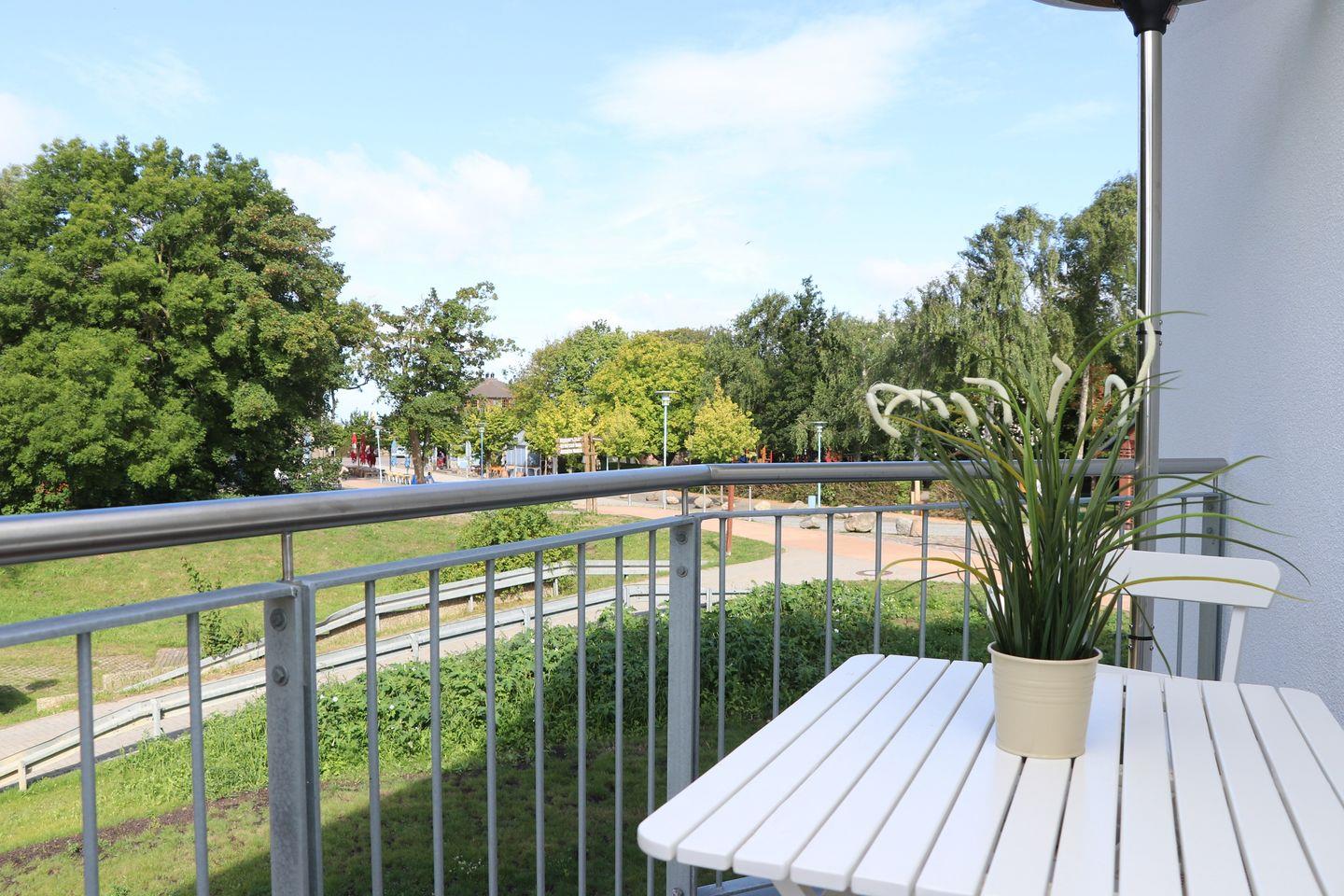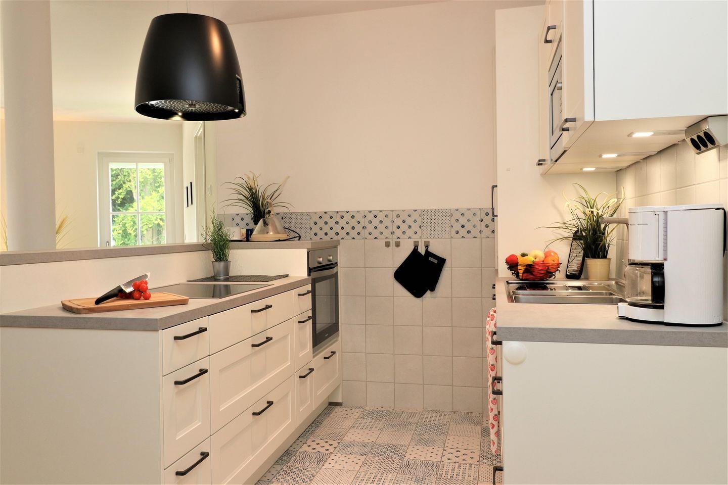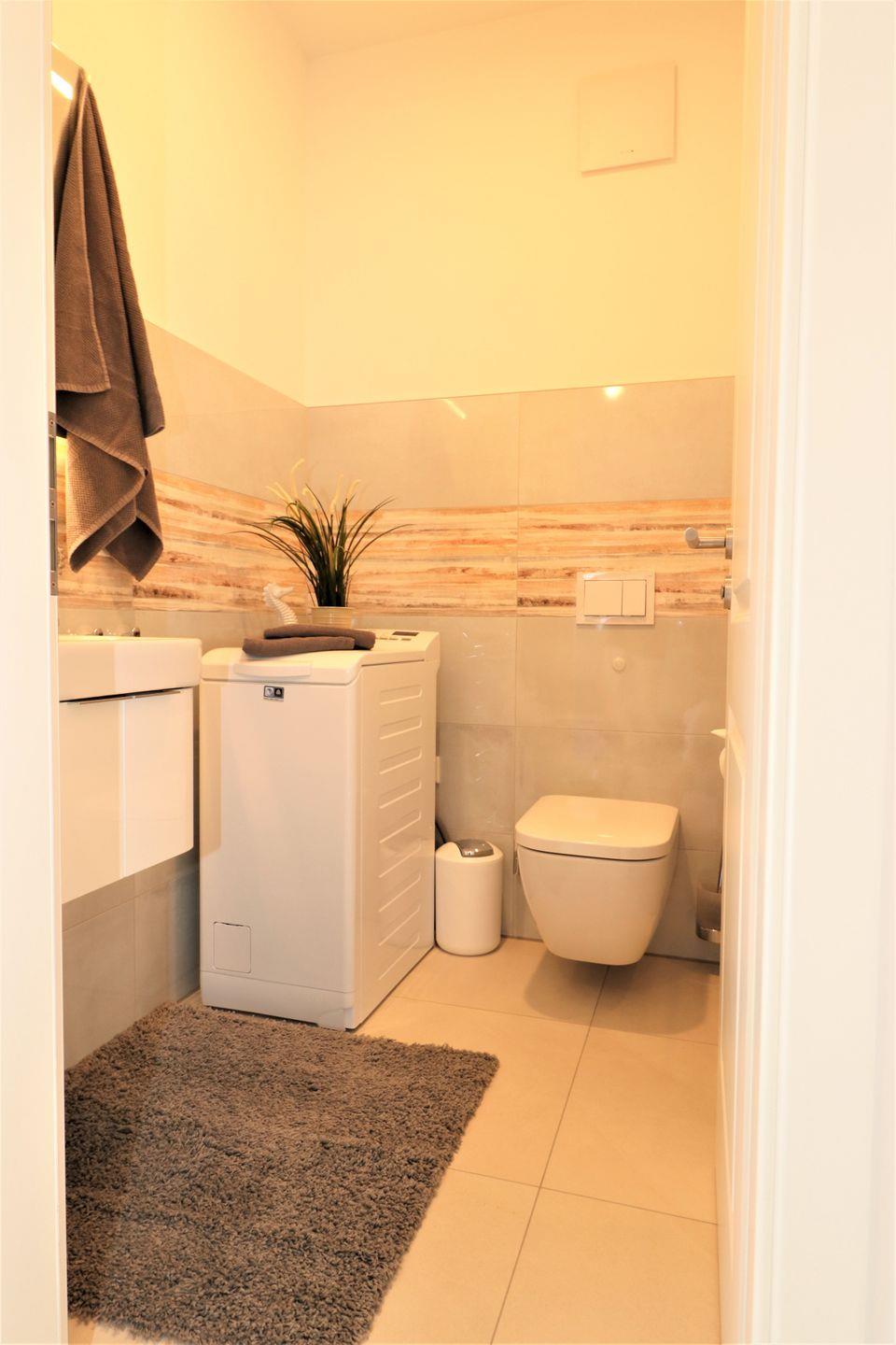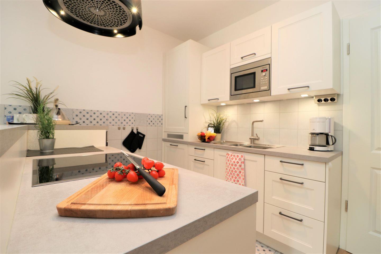 Die lichtdurchfluteten Räume der Wohnung sind liebevoll eingerichtet und schaffen eine einladende Atmosphäre. Über den Aufzug gelangen Sie bequem in die erste Etage, wo sich die hochwertigen Wohnbereiche befinden. Das offene Wohnkonzept verbindet den gemütlichen Wohnbereich mit der modernen Küche, die mit sämtlichen Annehmlichkeiten ausgestattet ist, darunter ein Geschirrspüler, ein Ceran-Herd, ein Backofen und eine Mikrowelle. Gemeinsame Essen am Esstisch werden hier zum Erlebnis – genießen Sie die gesunde Ostseeluft und die Nähe zur Natur!