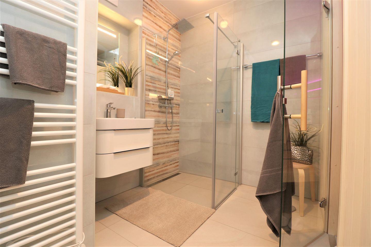 Zwei stilvolle Schlafzimmer mit Vinylböden laden zum Entspannen ein. Eines der Schlafzimmer verfügt über ein komfortables Doppelbett, während das zweite Schlafzimmer mit einem flexiblen Schlafarrangement ausgestattet ist, das ideal für Kinder oder Freunde ist. Das Badezimmer mit bodengleich Dusche bietet sowohl Komfort als auch Funktionalität, während ein zusätzliches Gäste-WC im Haus für Ihre Bedürfnisse sorgt.