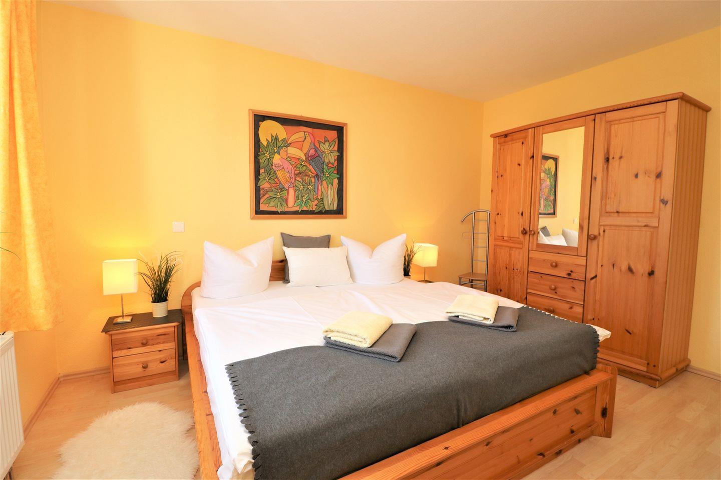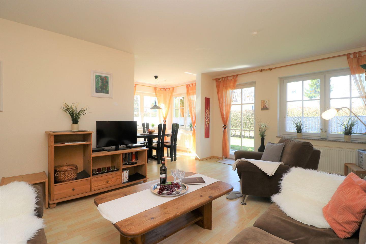 Das Appartement für maximal 4 Personen bietet eine großzügige und gut ausgestattete Unterkunft, die für einen komfortablen Aufenthalt sorgt. Es verfügt über ein großzügiges Wohnzimmer mit offener Küche, die perfekt für gemeinsame Mahlzeiten und gemütliche Abende geeignet ist. Das Appartement bietet zwei Schlafzimmer: ein Schlafzimmer mit Doppelbett für 2 Personen und ein weiteres Schlafzimmer mit 2 Einzelbetten, das ebenfalls Platz für 2 Personen bietet. Das Badezimmer ist mit einer Dusche und einem WC ausgestattet, zusätzlich befindet sich eine Waschmaschine im Appartement, die den Aufenthalt besonders praktisch macht. Die Terrasse mit Süd-West-Ausrichtung lädt dazu ein, die Sonne zu genießen und den Tag in ruhiger Atmosphäre ausklingen zu lassen. Ein Pkw-Stellplatz befindet sich direkt auf dem Grundstück, sodass Sie Ihr Fahrzeug bequem abstellen können. Das Appartement liegt zudem zentral, nur etwa 800 Meter vom Strand entfernt, was es zu einer idealen Wahl für Gäste macht, die sowohl die Nähe zum Strand als auch die Vorzüge einer guten Erreichbarkeit von Restaurants und Geschäften schätzen. Dieses Appartement ist die perfekte Wahl für Familien oder kleine Gruppen, die eine gut ausgestattete, zentrale Unterkunft in Strandnähe suchen.