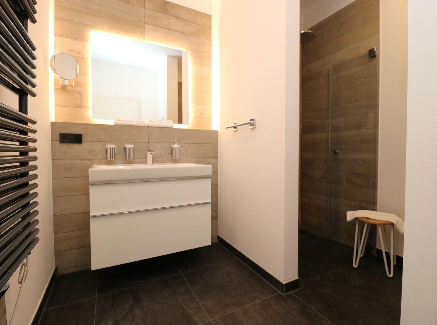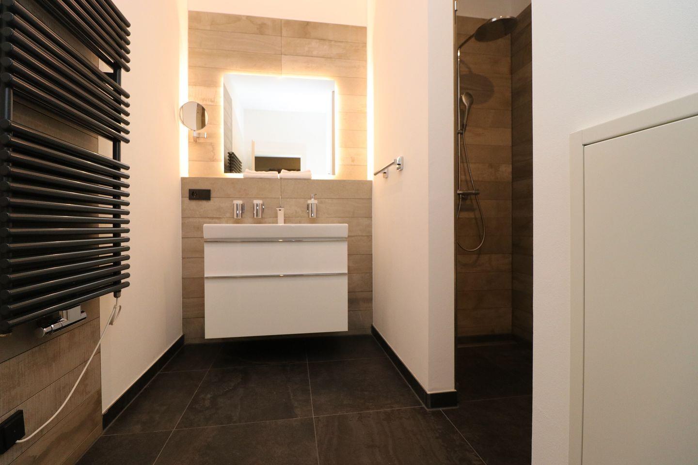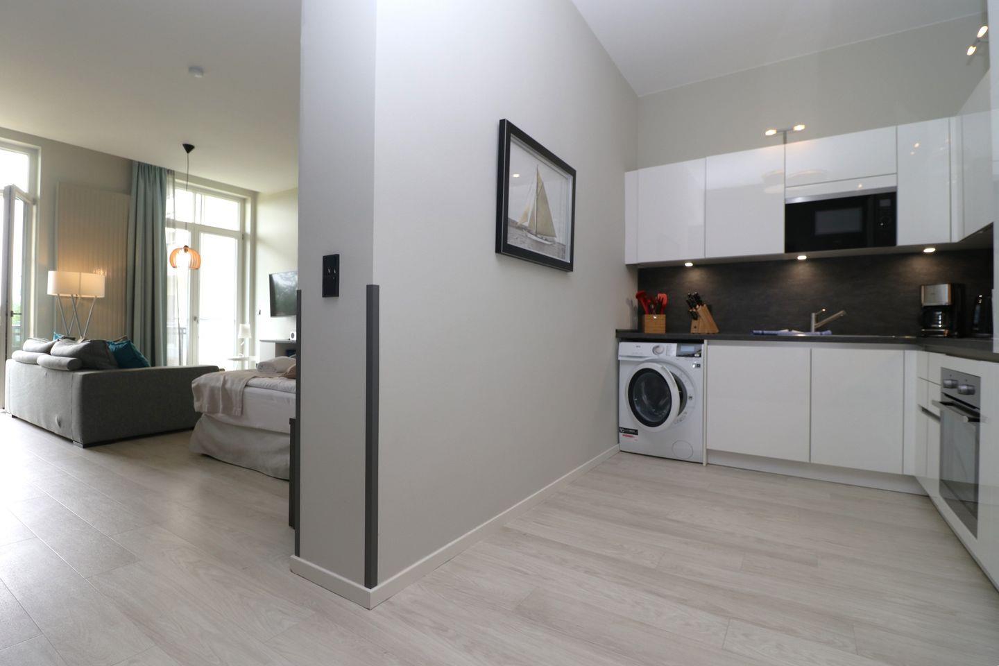 In der offenen Küche mit modernen Küchenutensilien können Sie Ihre Lieblingsgerichte zubereiten. Sie ist ausgestattet mit einem Induktionsherd, einem Backofen, einer Spülmaschine, einem Kühlschrank mit Gefrierfach sowie weiteren nützlichen Geräten wie einer Mikrowelle, einem Wasserkocher und einer Kaffeemaschine. Geschirr und Besteck sind selbstverständlich vorhanden, sodass Sie das Kulinarische ganz nach Ihren Wünschen genießen können. Das Badezimmer ist mit einer bodengleichen Dusche, einem Waschbecken, einem WC und einem Kosmetikspiegel ausgestattet. Der Waschtrockner im Appartement bietet zusätzliche Annehmlichkeiten, um Ihre Wäsche bequem in Eigenregie zu erledigen. All dies wird ergänzt durch eine Fußbodenheizung, die für eine angenehme Wärme sorgt.
