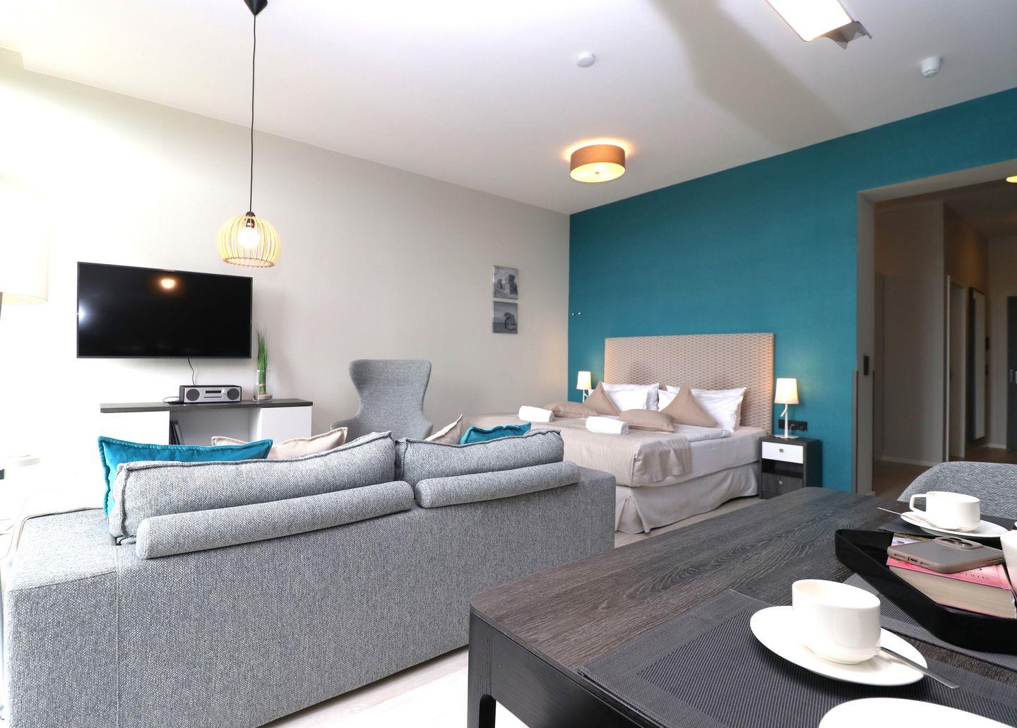 Das "Kranichnest" ist ideal für Paare oder kleine Familien und bietet Platz für bis zu zwei Gäste. Die Unterkunft verfügt über ein geschmackvoll eingerichtetes Wohnzimmer mit einer Sofaecke, einem Esstisch und hochwertiger Unterhaltung in Form eines 44 bis 55 Zoll großen TVs mit digitalem Anschluss. Des Weiteren gibt es eine HiFi-Anlage und WLAN, sodass Sie während Ihres Aufenthalts in Verbindung bleiben können.