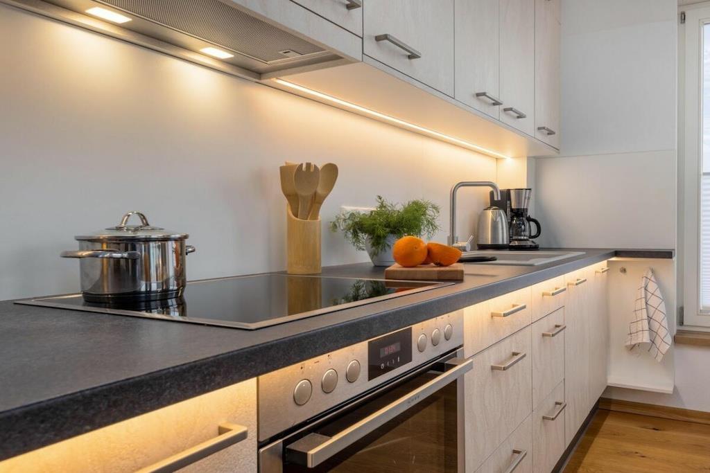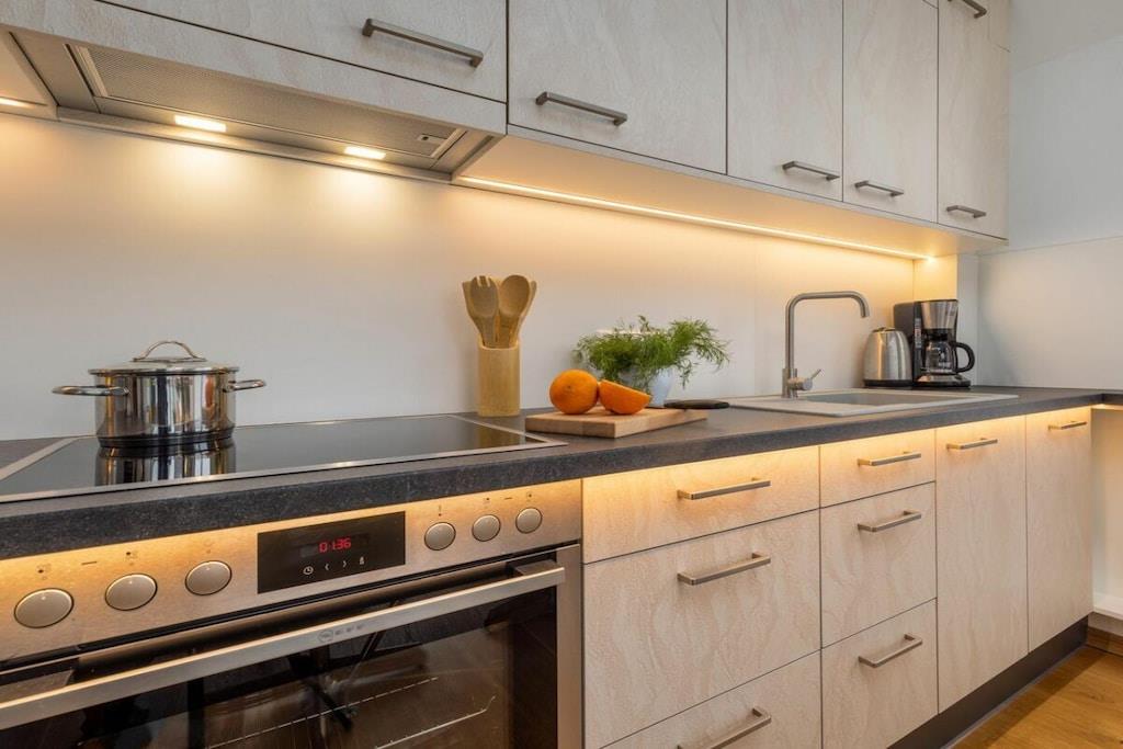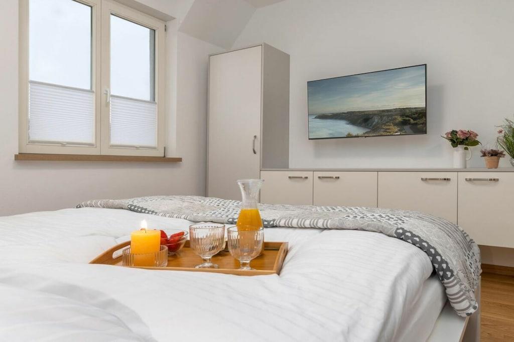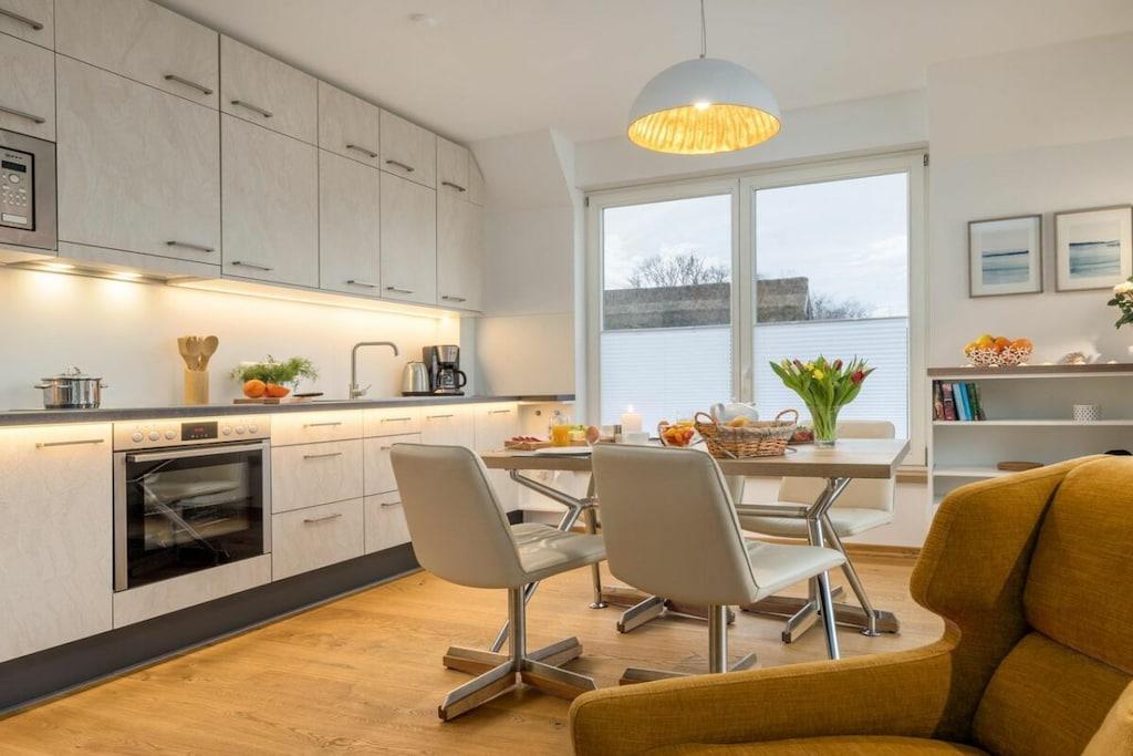 Ny, moderne og smagfuldt møbleret lejlighed på første sal. Store balkondøre fra gulv til loft bringer masser af lys ind i stuen med egetræsparketgulv. En sovesofa med en ekstra seng (160x200 cm) egnet til to personer, et fuldt udstyret køkken, en pejs til kolde dage og havemøbler på balkonen, to LCD-tv'er, et soveværelse med en dobbeltseng og et badeværelse med god opbevaringsplads. Bryggerset indeholder en møntvaskemaskine og tørretumbler. Der er cykelopbevaring.