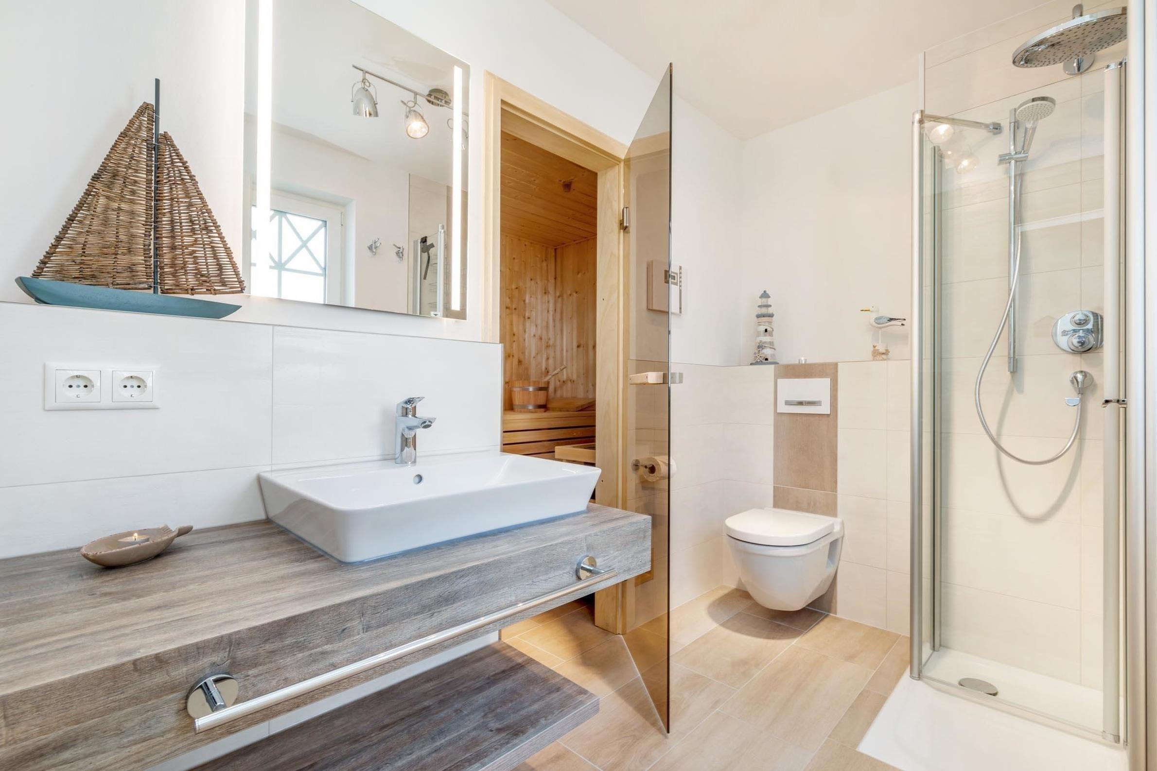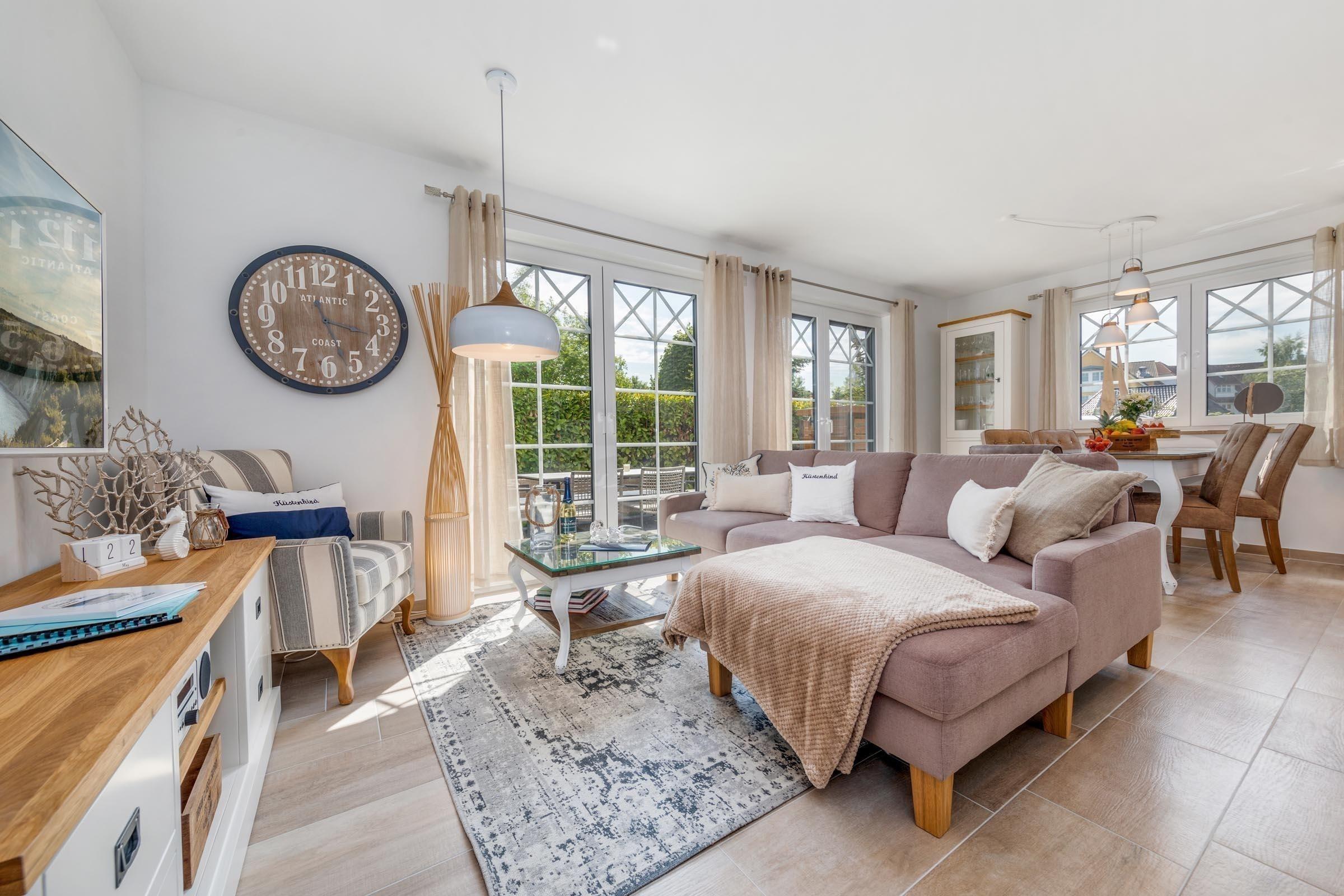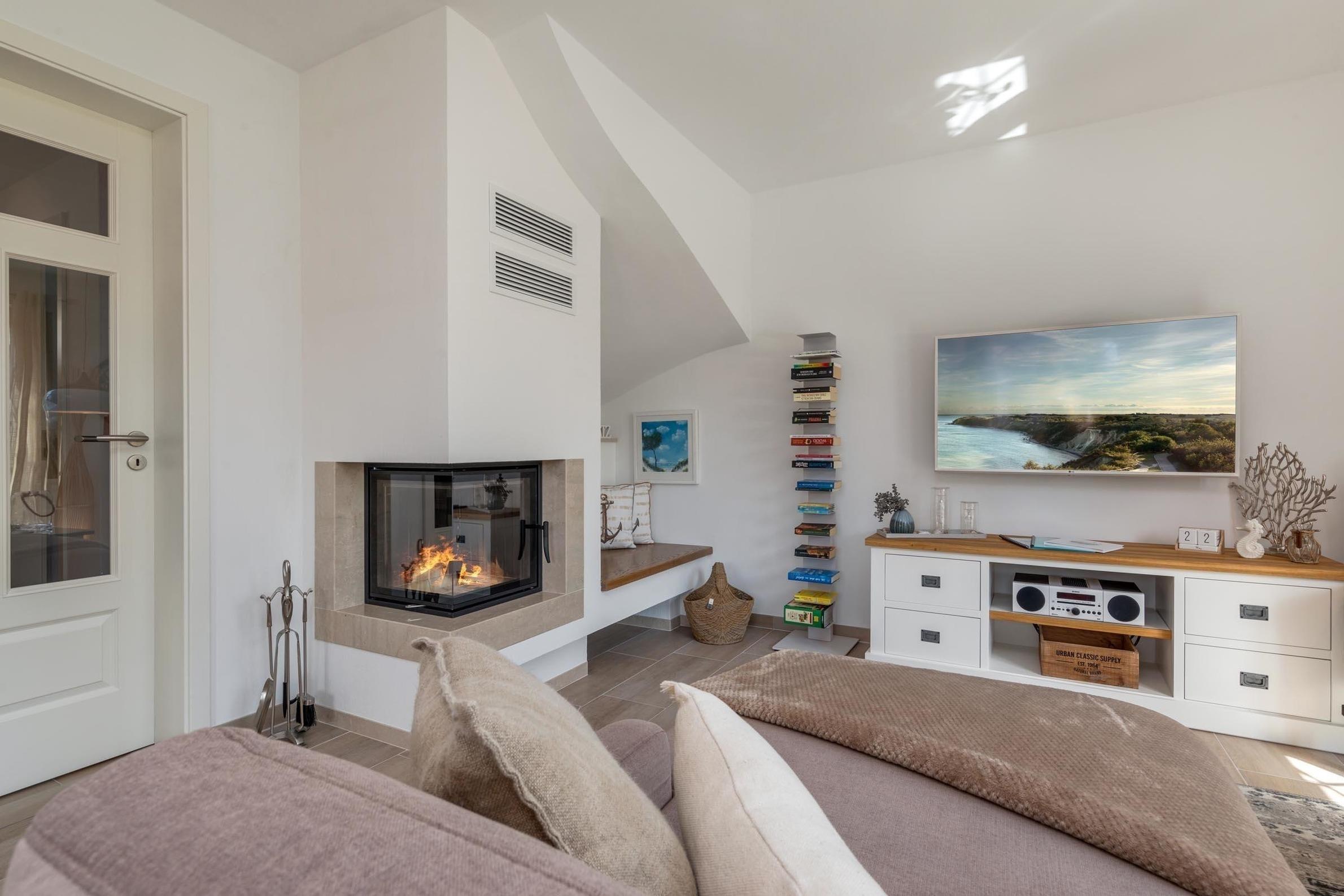 Im Ferienhaus Küstenkind erwartet Gäste eine lichtdurchflutete Wohlfühloase. Der großzügige Wohnbereich bietet eine offene Küche, die mit einem Elektro-/Gasherd, Backofen, Geschirrspüler und Kaffeemaschine ausgestattet ist. Der Esstisch für bis zu 8 Personen und die gemütliche Couch mit Fußbodenheizung schaffen eine einladende Atmosphäre. Ein Kamin sorgt für Wärme und Gemütlichkeit.