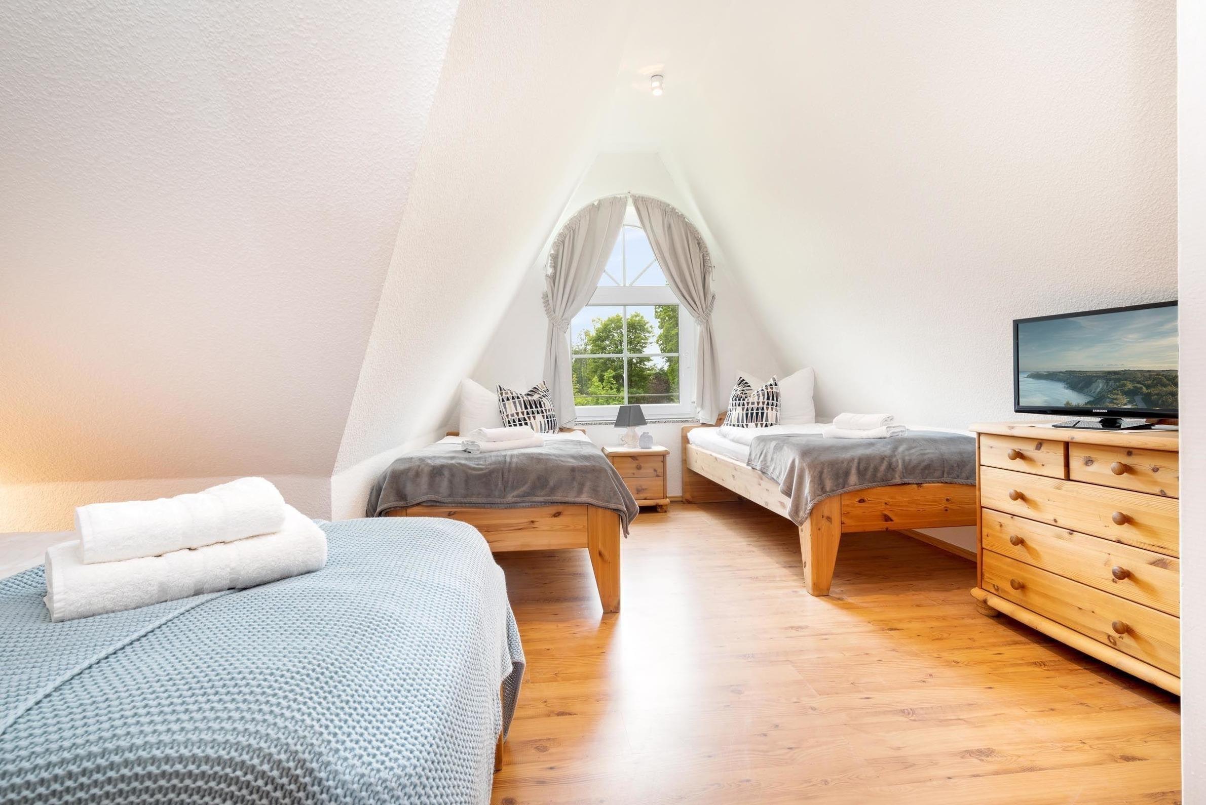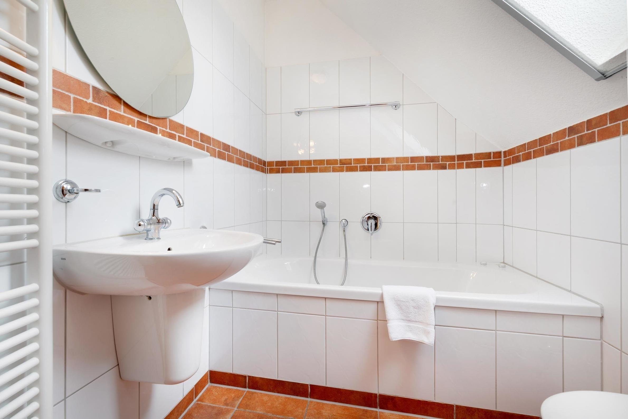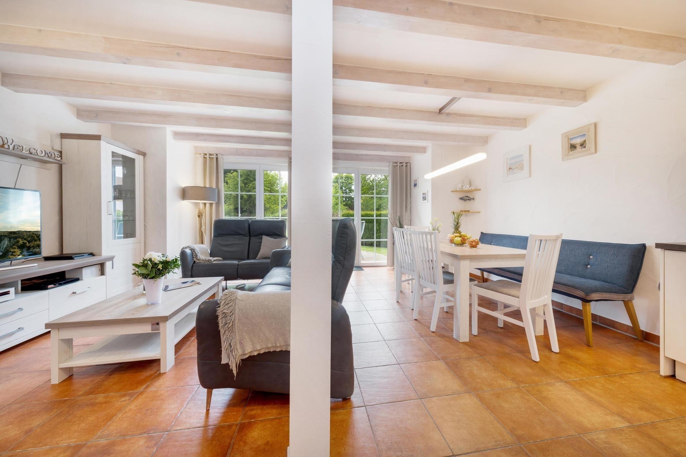 Die Ferienwohnung bietet eine moderne und allergikergeeignete Ausstattung, die optimale Entspannung und Komfort garantiert. In drei Schlafzimmern, ausgestattet mit zwei Doppelbetten und drei Einzelbetten, finden bis zu sieben Personen Platz. Drei Badezimmer, darunter ein Duschbad mit bodengleicher Dusche und eine Badewanne, sorgen für zusätzlichen Komfort. Die offene Küche ist ein echter Blickfang und verfügt über einen Elektro-/Gasherd, Backofen, Mikrowelle und Geschirrspüler. Diese ist ideal für gemeinsame Mahlzeiten am Esstisch. Die wohltuende Fußbodenheizung im gesamten Wohnbereich und der Kamin/Kachelofen schaffen eine gemütliche Atmosphäre. Für Unterhaltung sorgen TV, HiFi-Anlage und DVD-/Blu Ray-Player. Die praktische Ausstattung umfasst ebenso einen Parkplatz, Waschmaschine und Wäschetrockner. WLAN und diverse Brettspiele runden das Angebot ab. Fliegengitter und Rauchmelder sorgen für Sicherheit und Komfort.