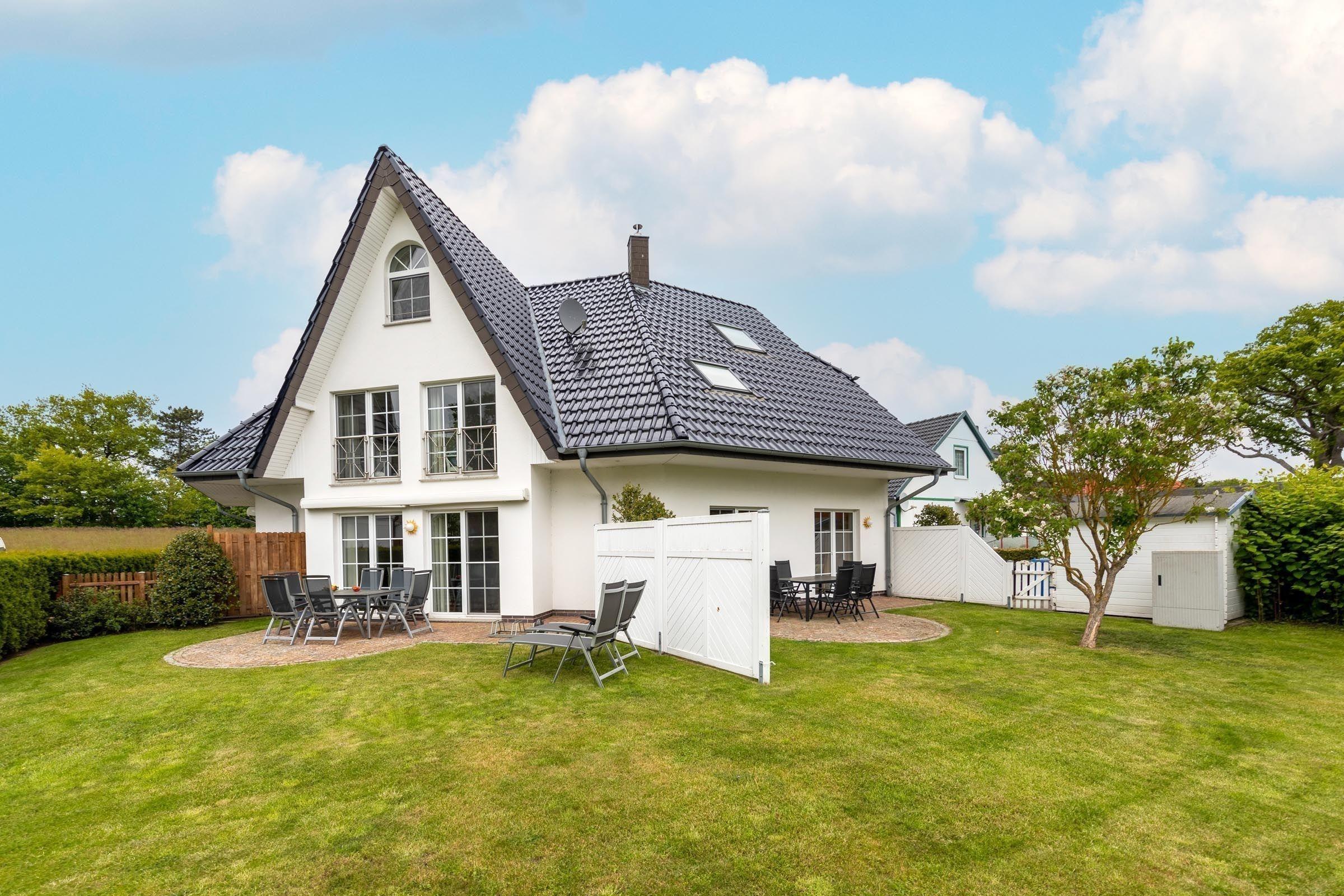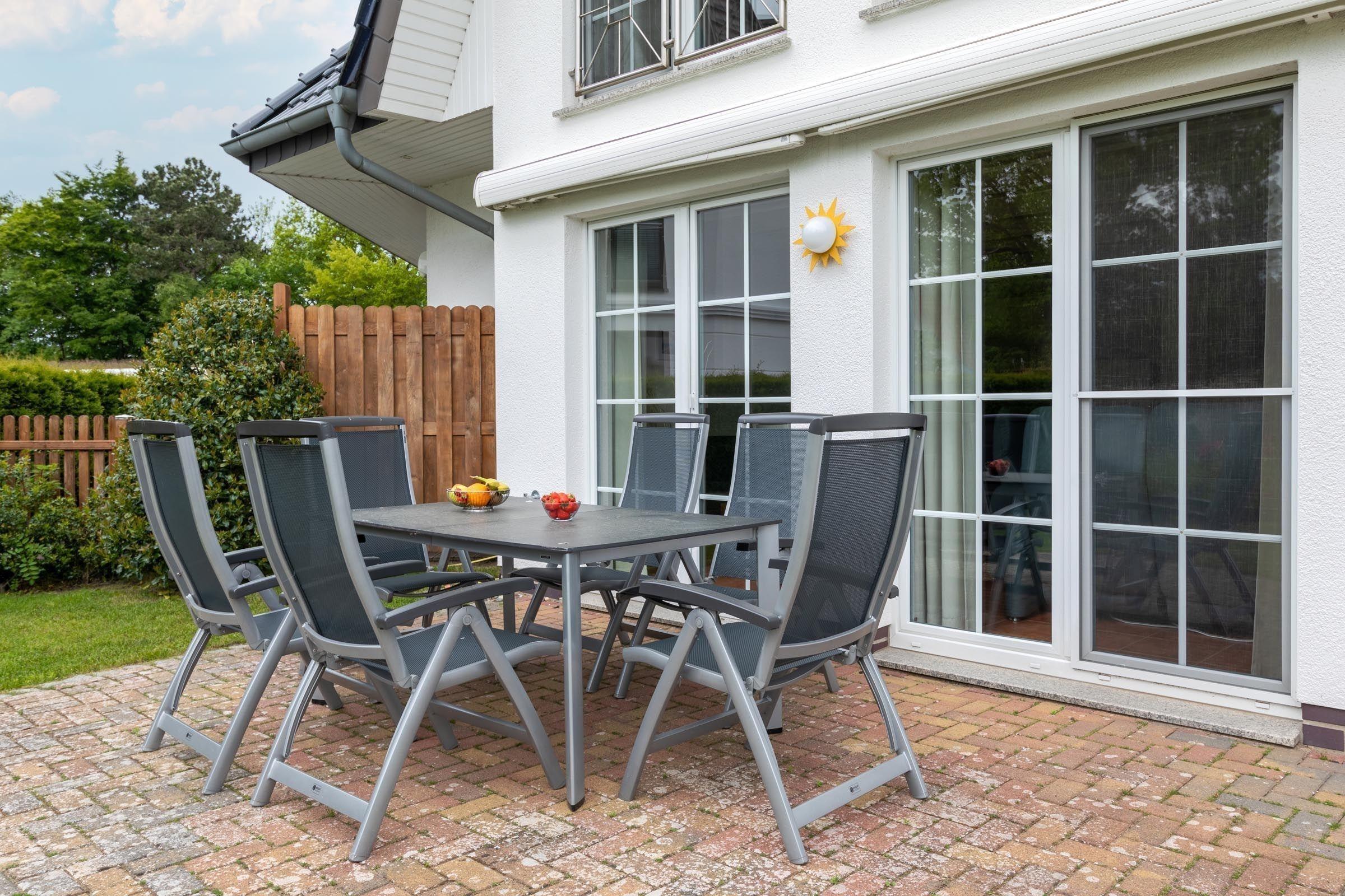 Die Ferienwohnung bietet einen einladenden Außenbereich mit einer gemütlichen Terrasse und einem gepflegten eigenen Garten. Hier können angenehme Stunden auf den Gartenliegen und Liegestühlen verbracht werden. Diese grüne Oase lädt zum Entspannen und Verweilen ein, ideal für unvergessliche Urlaubsmomente in der Natur.