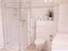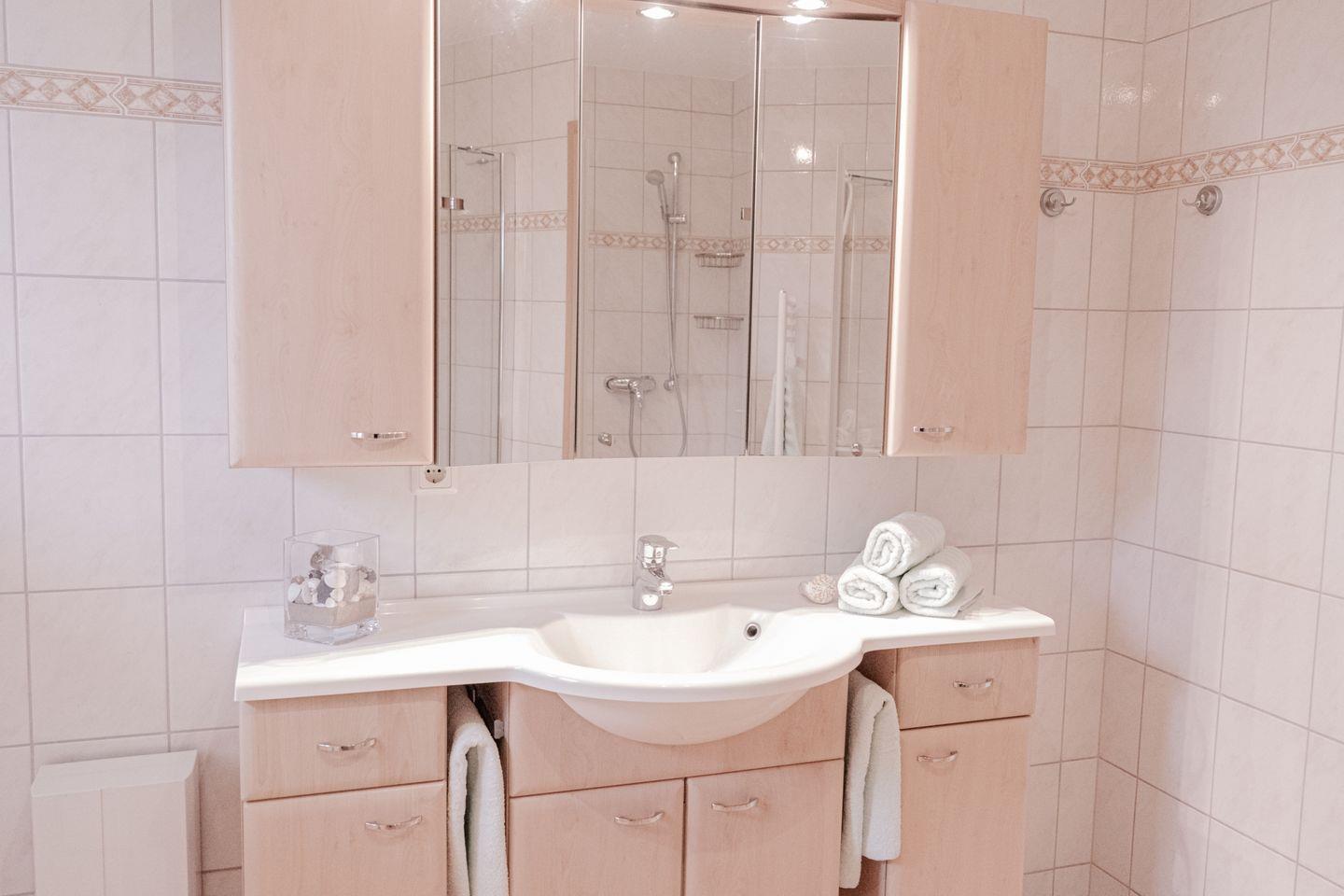 Das Badezimmer verfügt über eine ebenerdige Dusche, die Waschmaschine ist ebenfalls hier zu finden.