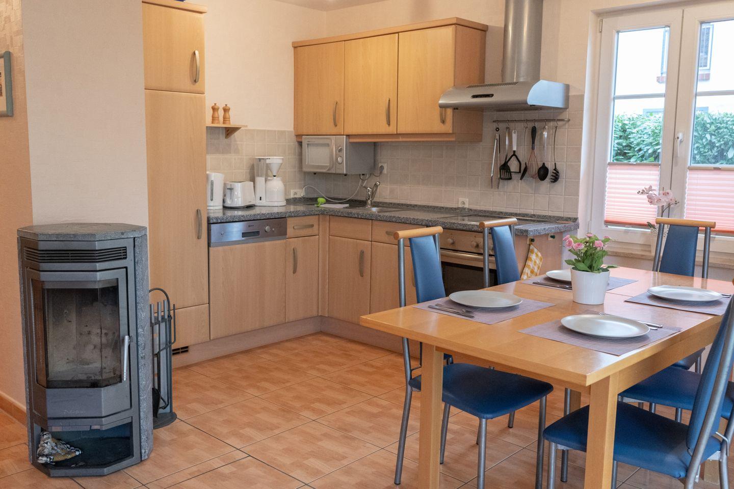 Der geräumige Wohnraum verfügt über einen Kaminofen und geht in die moderne Küche über.