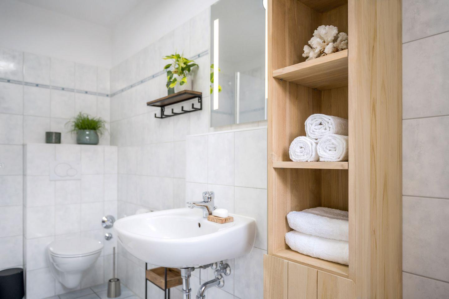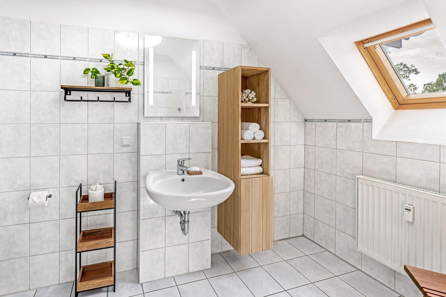 Ein modernes Badezimmer mit ebenerdiger Dusche/WC, Waschbecken komplettiert das Angebot.
