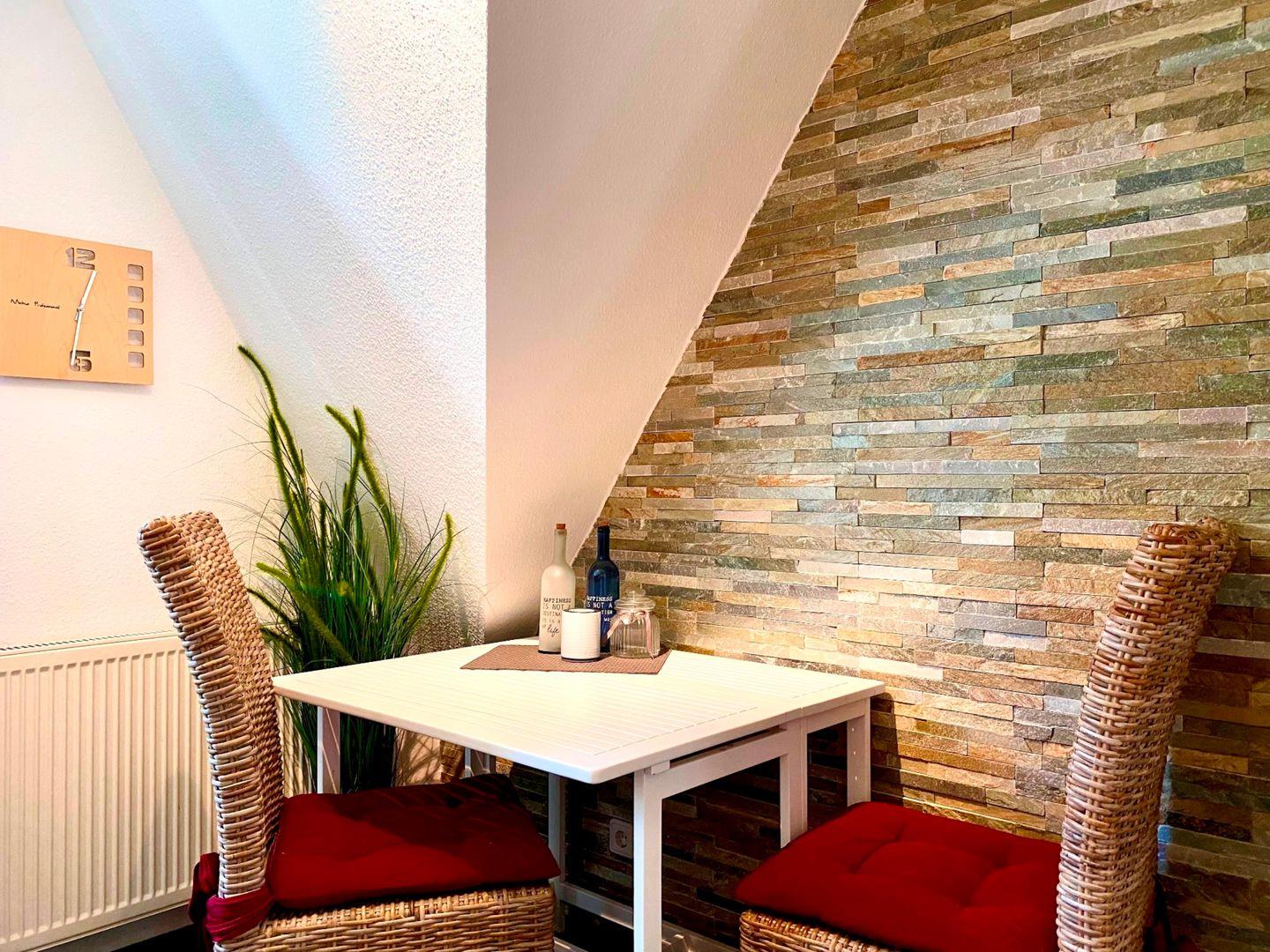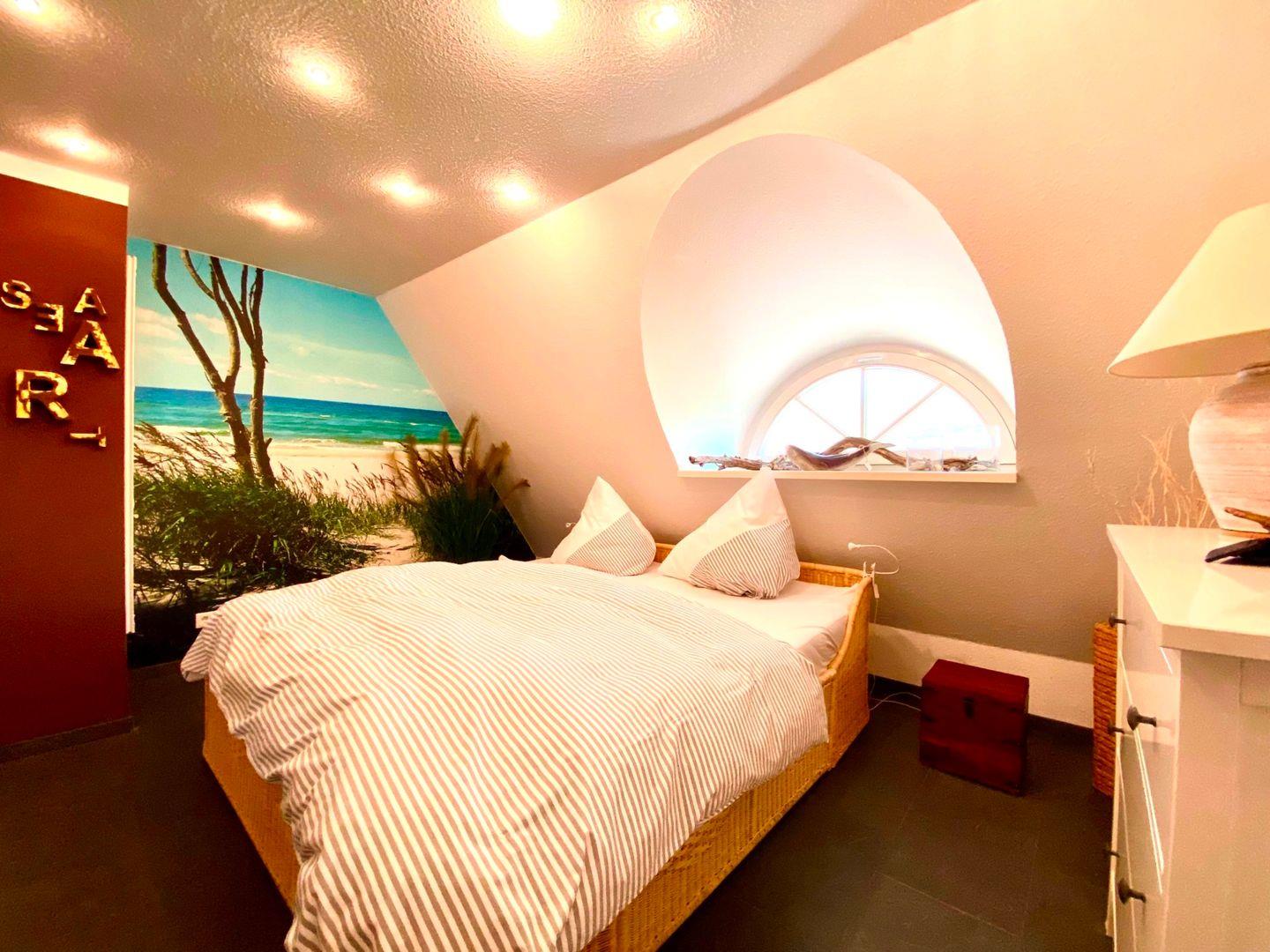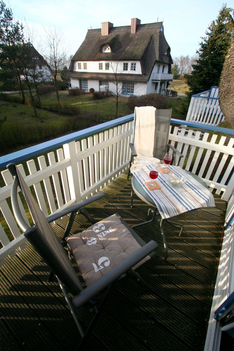 Die reetgedeckte Ferienanlage liegt etwas außerhalb, direkt hinter dem Ostseedeich. Die 65qm große Obergeschosswohnung wird für max. 2 Personen und 1 Baby vermietet. Auf der Wohnebene der Maisonettwohnung befinden sich die integrierte Küche, der Zugang zum Westbalkon und das Bad mit Dusche und WC. Im Obergeschoss befindet sich das Schlafzimmer mit Ehebett, hier befindet sich ein zweites TV-Gerät mit DVD-Player.