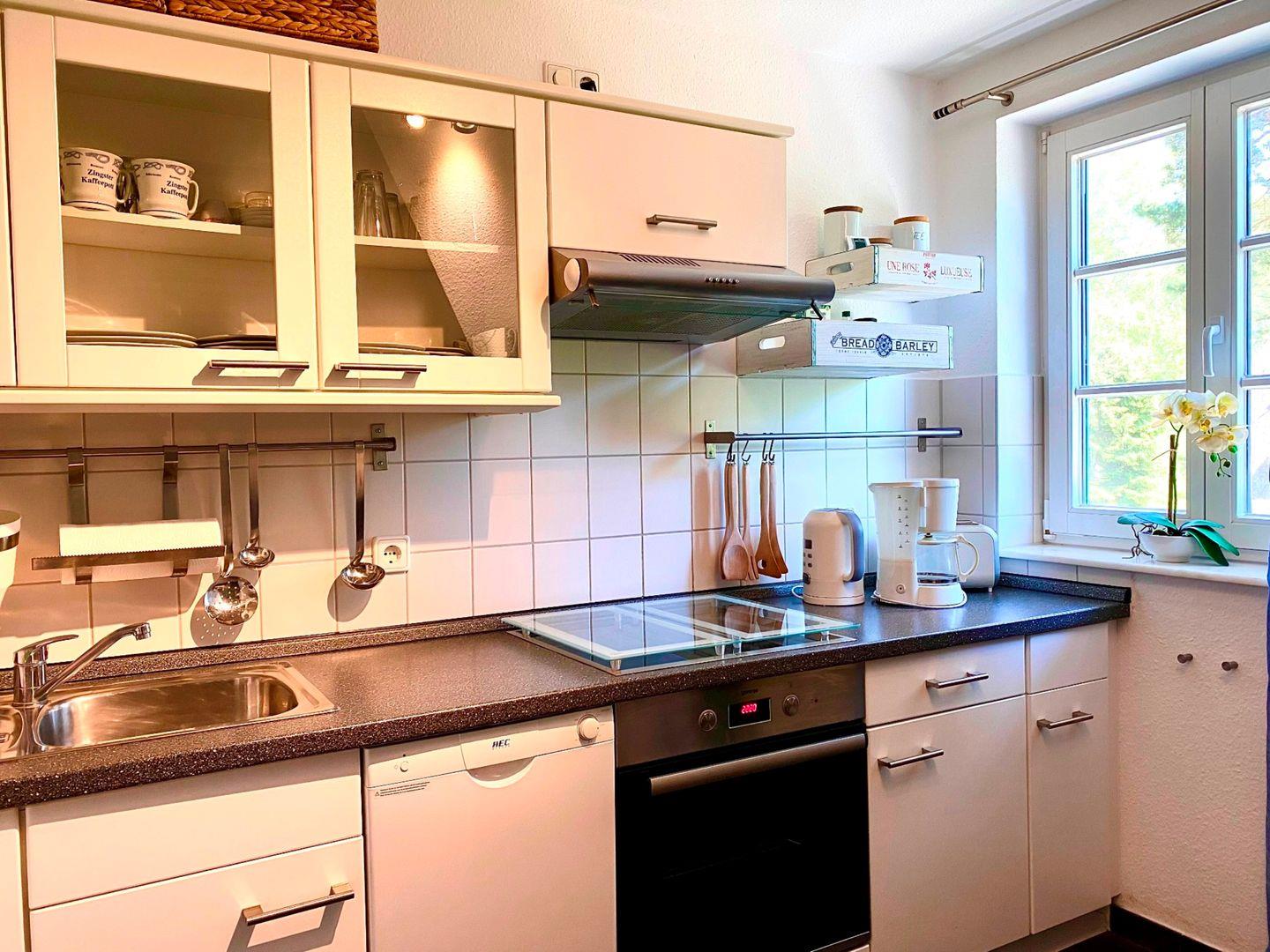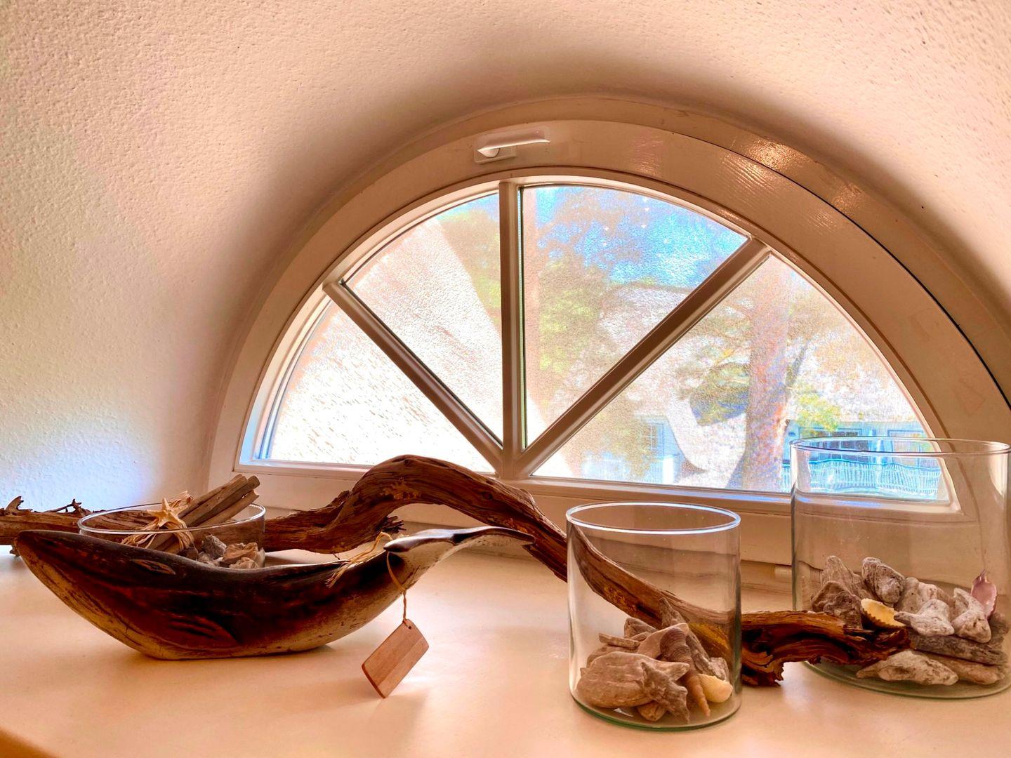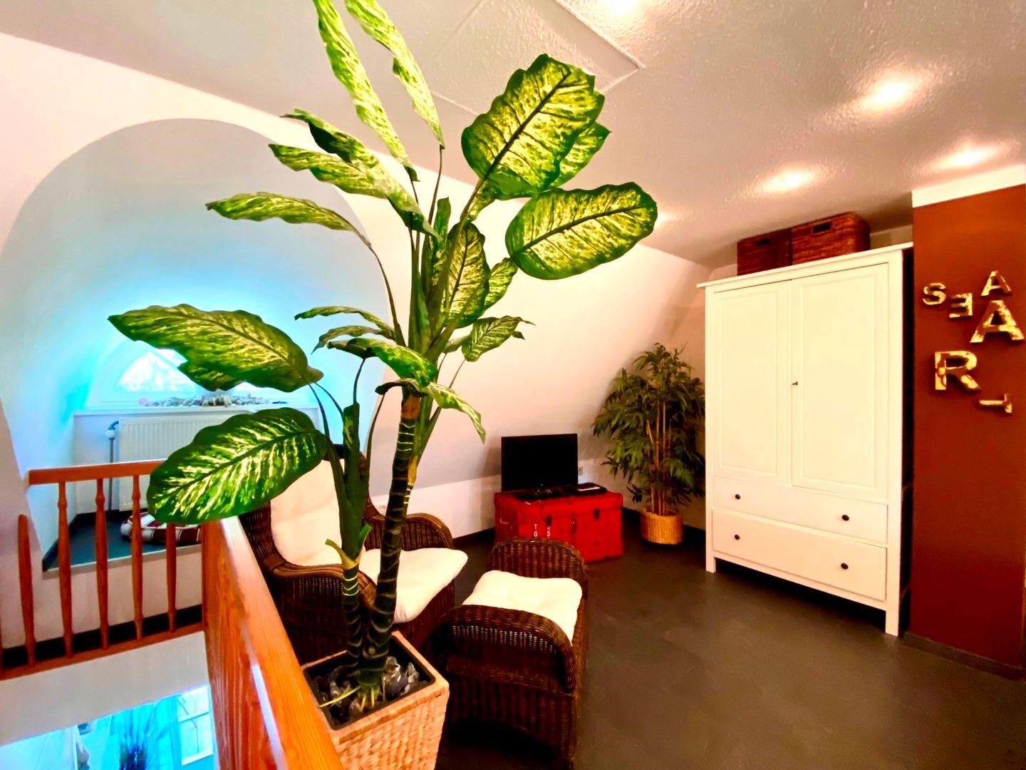 Die reetgedeckte Ferienanlage liegt etwas außerhalb, direkt hinter dem Ostseedeich. Die 65qm große Obergeschosswohnung wird für max. 2 Personen und 1 Baby vermietet. Auf der Wohnebene der Maisonettwohnung befinden sich die integrierte Küche, der Zugang zum Westbalkon und das Bad mit Dusche und WC. Im Obergeschoss befindet sich das Schlafzimmer mit Ehebett, hier befindet sich ein zweites TV-Gerät mit DVD-Player.