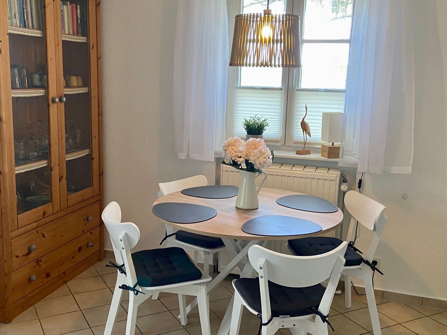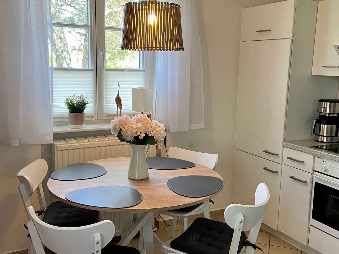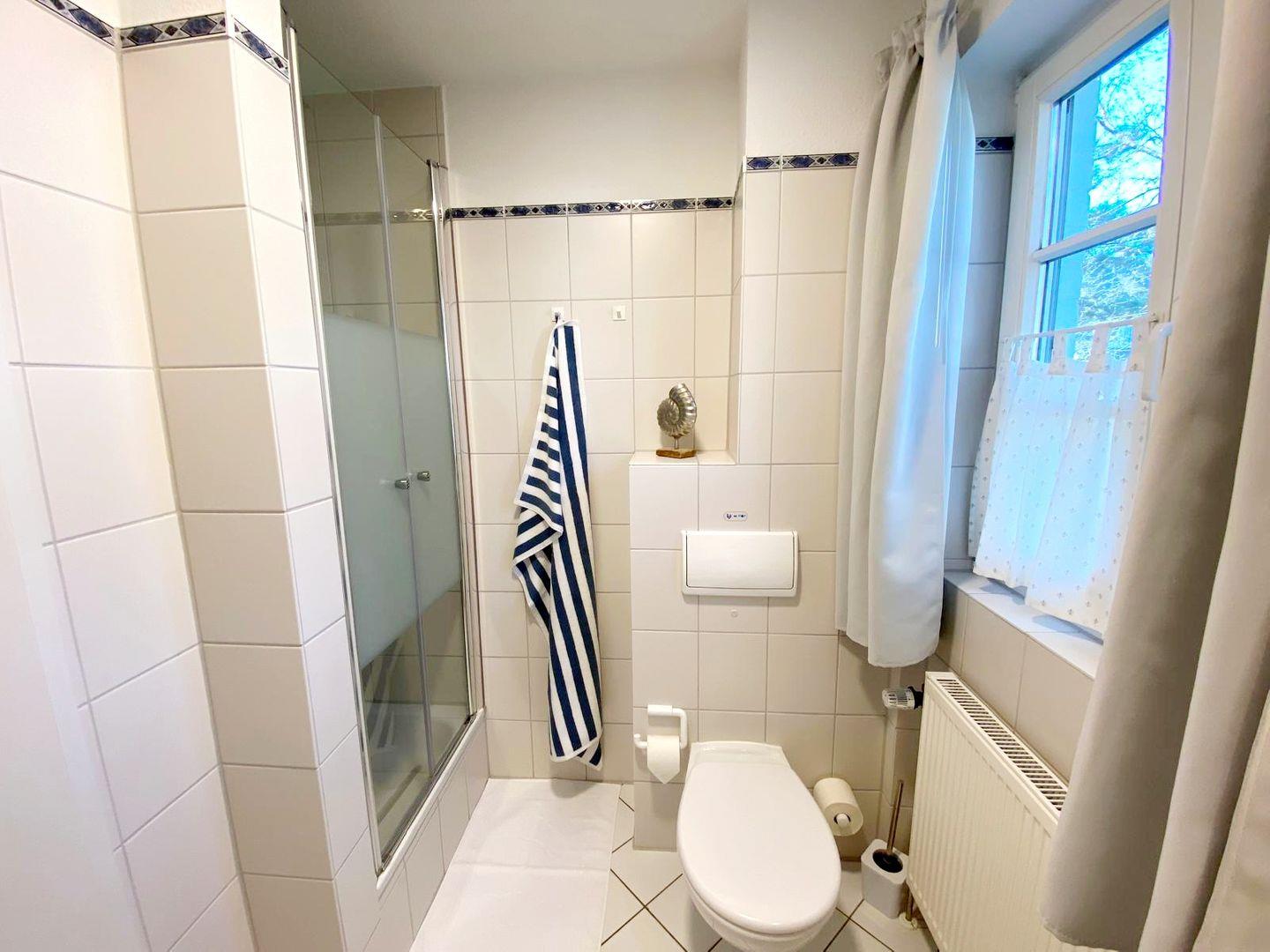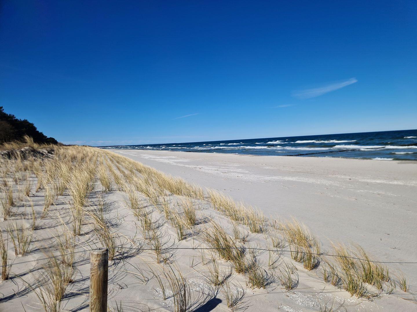 Herzlich willkommen in der stilvollen, reetgedeckten Ferienanlage Achtern Diek am ruhigen Ortsrand von Zingst – direkt hinter dem Ostseedeich, eingebettet in die Natur am Waldrand. Unsere lichtdurchflutete, 41 qm große Eckwohnung im Erdgeschoss bietet Platz für zwei Personen und lädt zum Entspannen und Wohlfühlen ein. Der behagliche Wohnraum mit integrierter Küche und einem ausziehbaren Schlafsofa schafft eine gemütliche Atmosphäre. Davor befindet sich eine nach Westen ausgerichtete Terrasse mit bequemer Sitzgruppe und Sonnenschirm. Das helle Bad ist mit einer Regendusche, WC und einer praktischen Waschmaschine ausgestattet. Im separaten Schlafzimmer erwartet Sie ein hochwertiges Doppelbett mit 1,60 Meter Breite für erholsamen Schlaf. Ebenso lädt die ruhige Lage mitten in der Natur zu ungestörter Entspannung ein und ist ideal für Spaziergänge oder Radtouren durch den Darß. Der feinsandige Ostseestrand ist nur wenige Minuten entfernt und bequem zu Fuß erreichbar. Die Wohnung kombiniert modernen Komfort mit naturnaher Erholung in idyllischer Umgebung. Wir freuen uns, Sie bald bei uns begrüßen zu dürfen!
