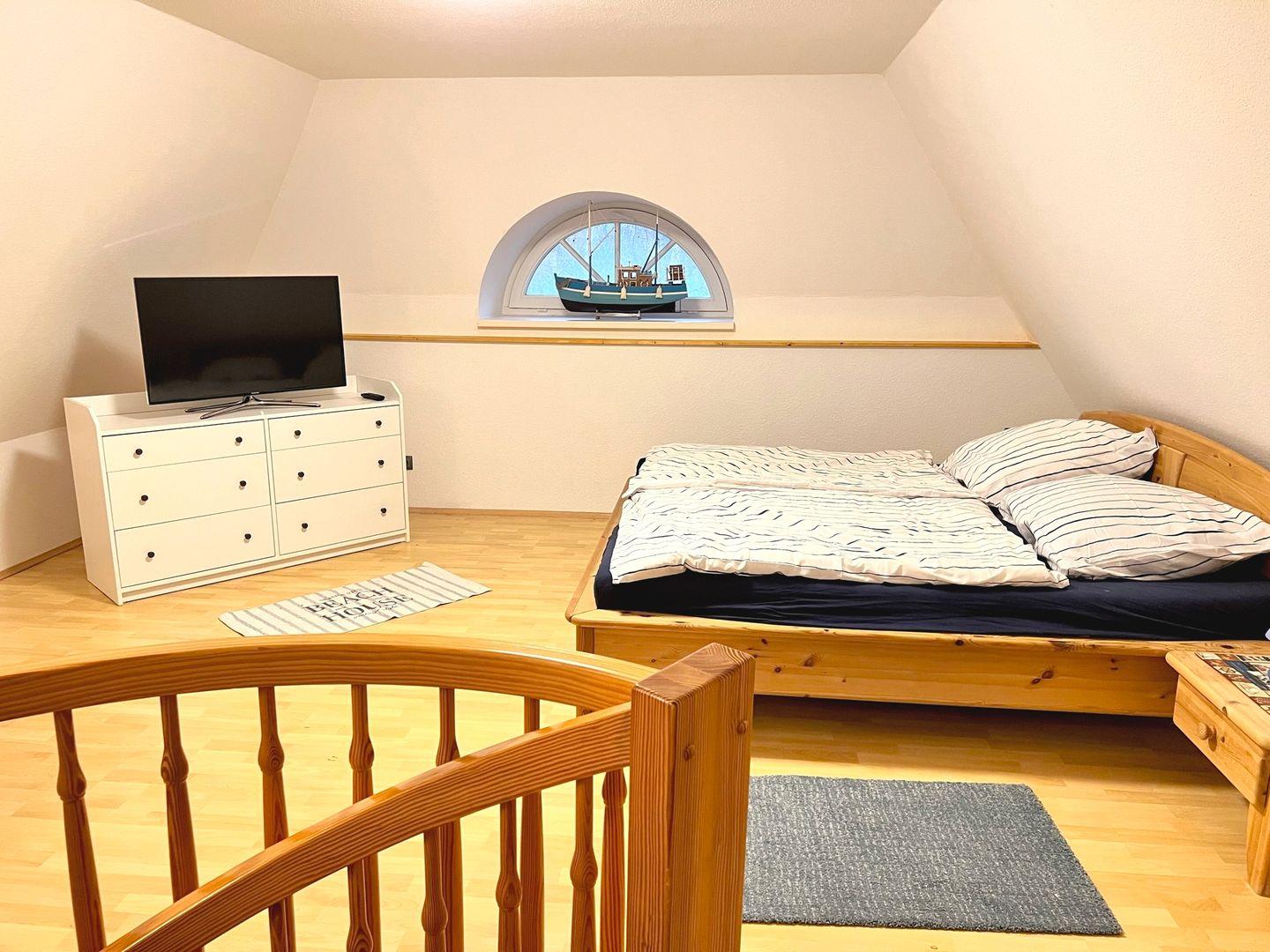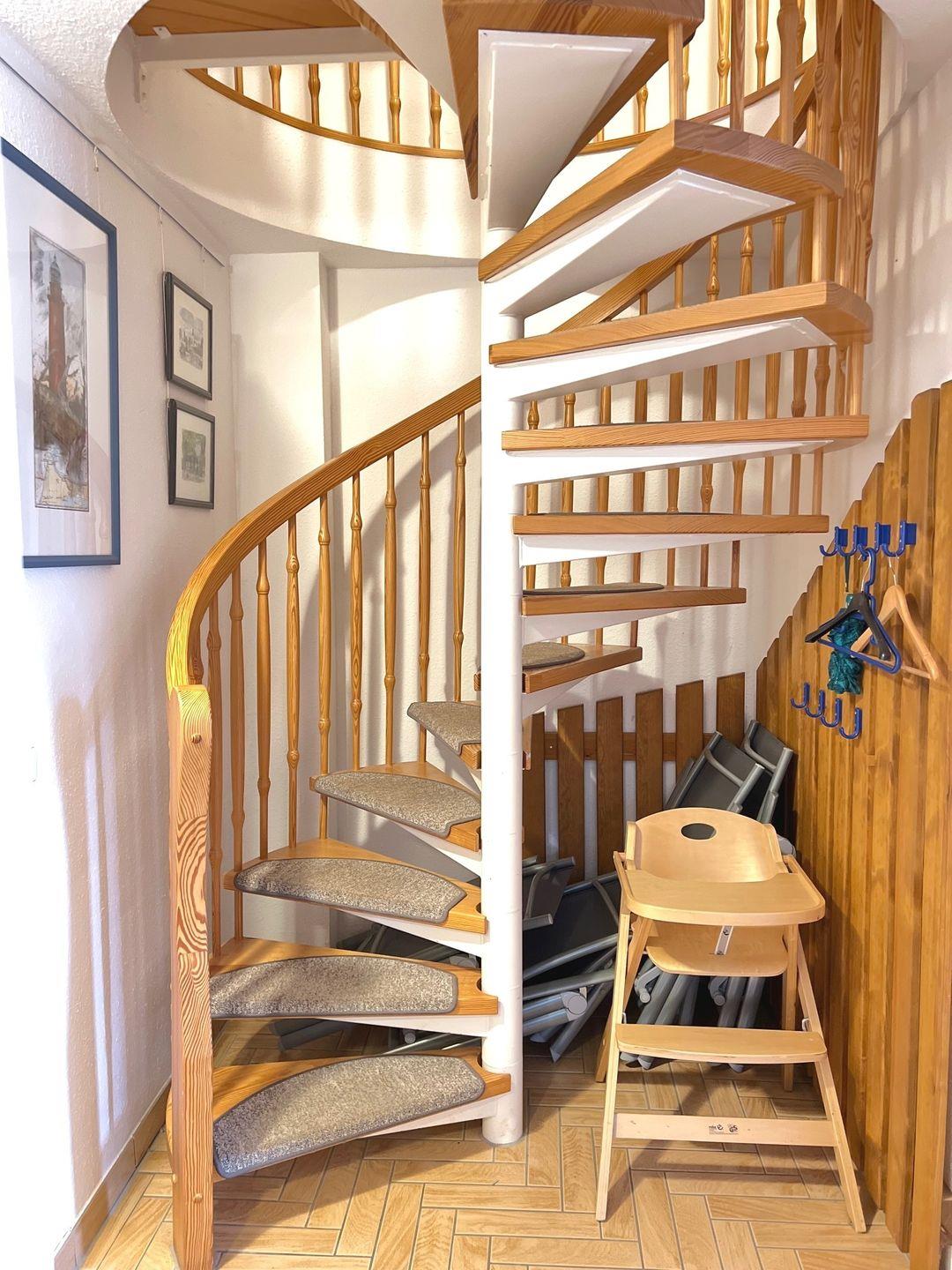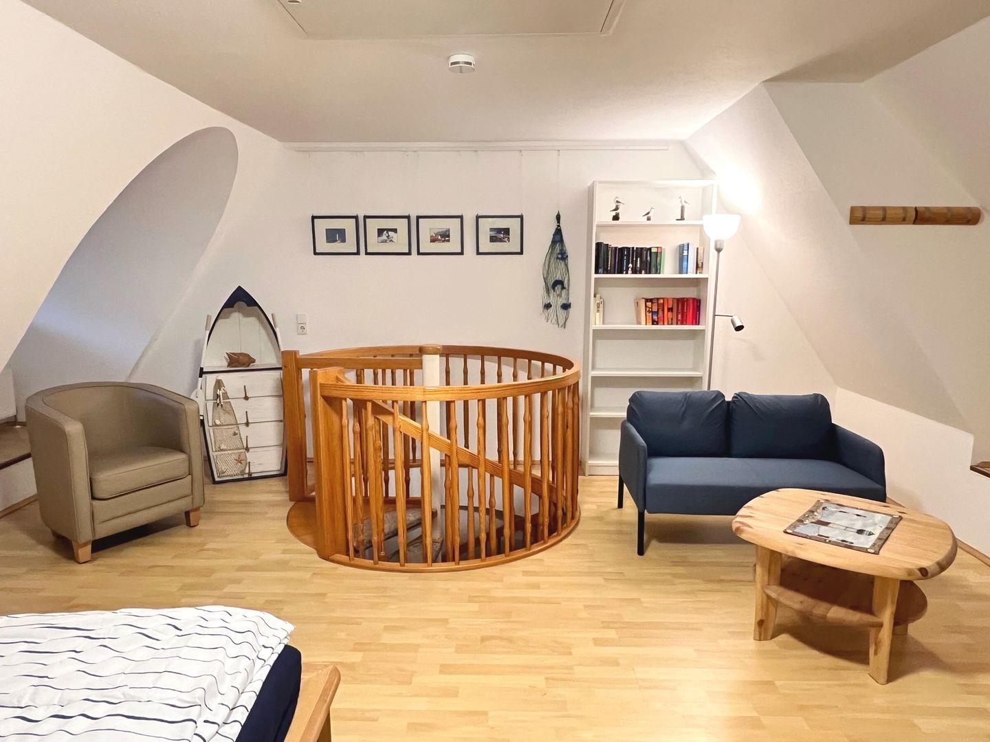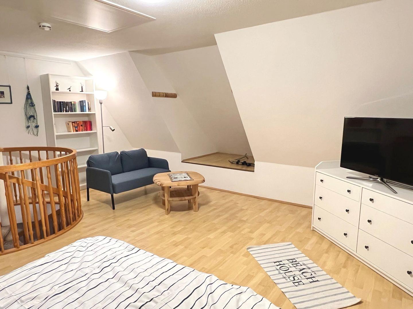 Die Wohnung befindet sich im ersten OG und wird für maximal 4 Personen plus 1 Baby/ Kleinkind vermietet. In der unteren Etage befindet sich der offene Wohn- und Essbereich, sowie die Küche und der schöne West-Balkon. Das Schlafzimmer auf der Etage verfügt über zwei Einzelbetten und einen Kleiderschrank. In der oberen Etage erstreckt sich ein großzügiges Zimmer mit einem Doppelbett, einem weiteren Fernseher, eine gemütliche Sitzecke zum Lesen und Entspannen und ein Reisebett für den kleinen Gast.