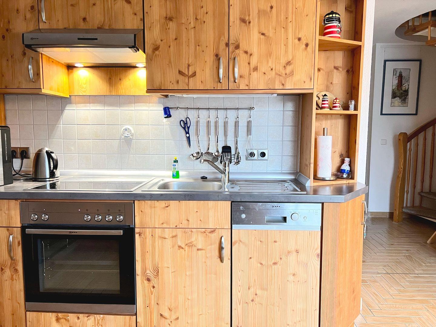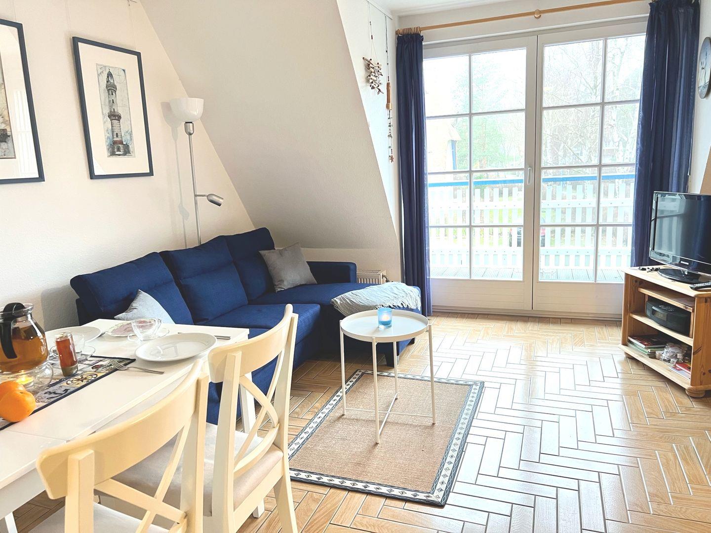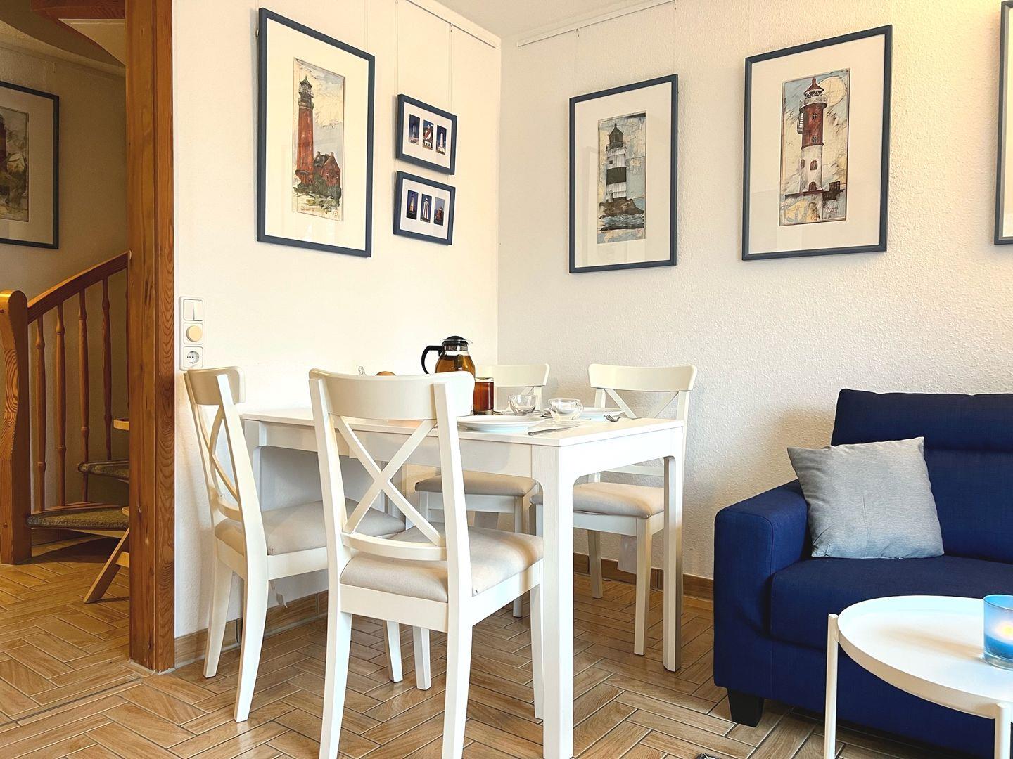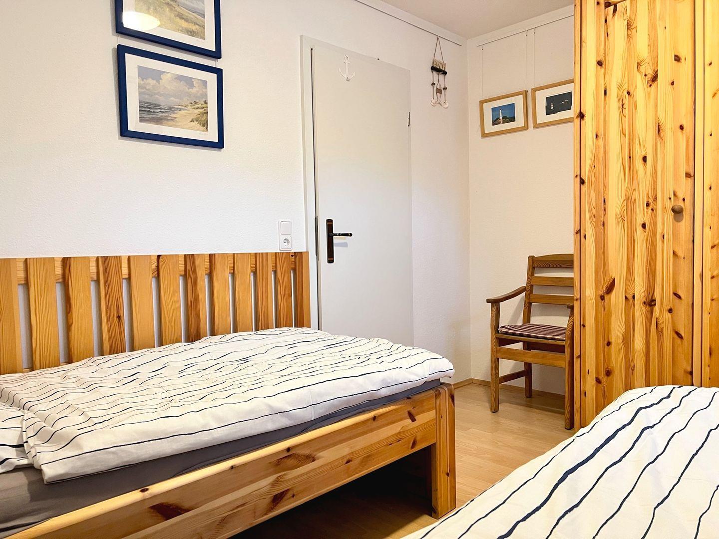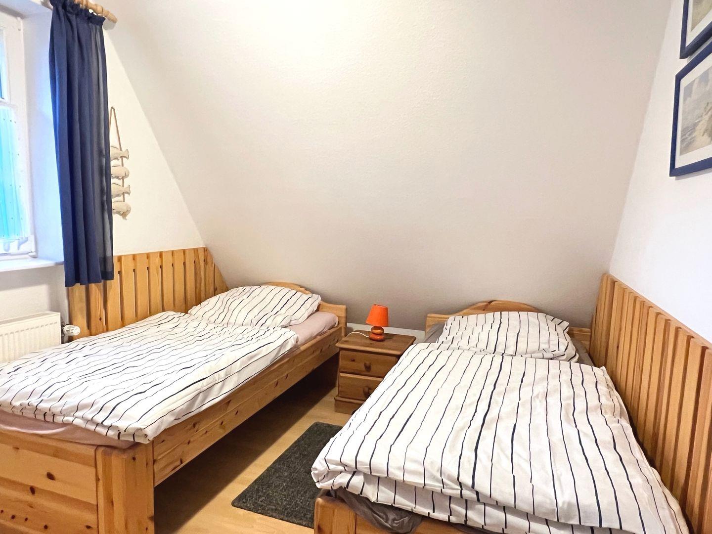 Die Wohnung befindet sich im ersten OG und wird für maximal 4 Personen plus 1 Baby/ Kleinkind vermietet. In der unteren Etage befindet sich der offene Wohn- und Essbereich, sowie die Küche und der schöne West-Balkon. Das Schlafzimmer auf der Etage verfügt über zwei Einzelbetten und einen Kleiderschrank. In der oberen Etage erstreckt sich ein großzügiges Zimmer mit einem Doppelbett, einem weiteren Fernseher, eine gemütliche Sitzecke zum Lesen und Entspannen und ein Reisebett für den kleinen Gast.