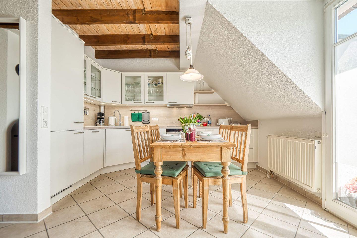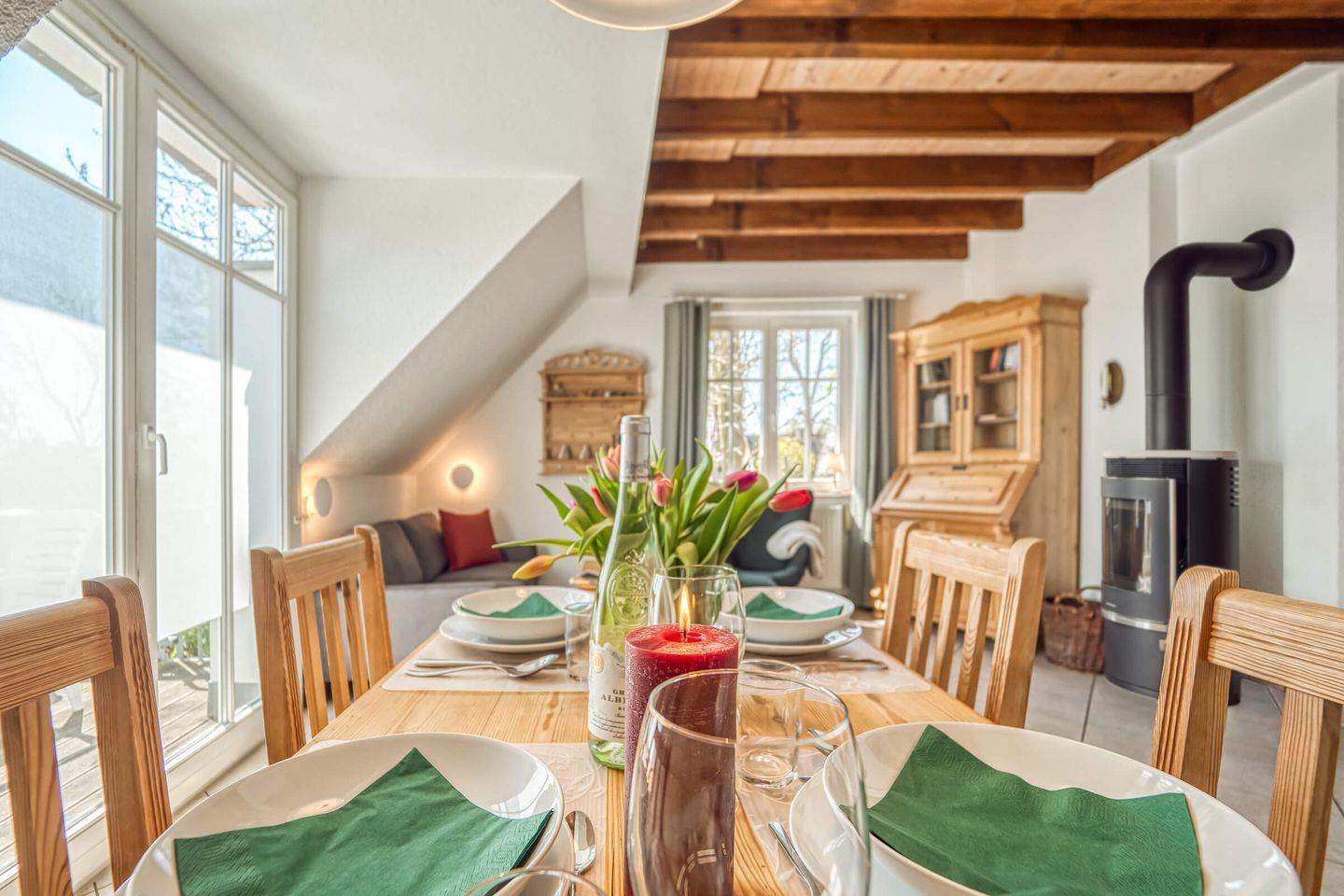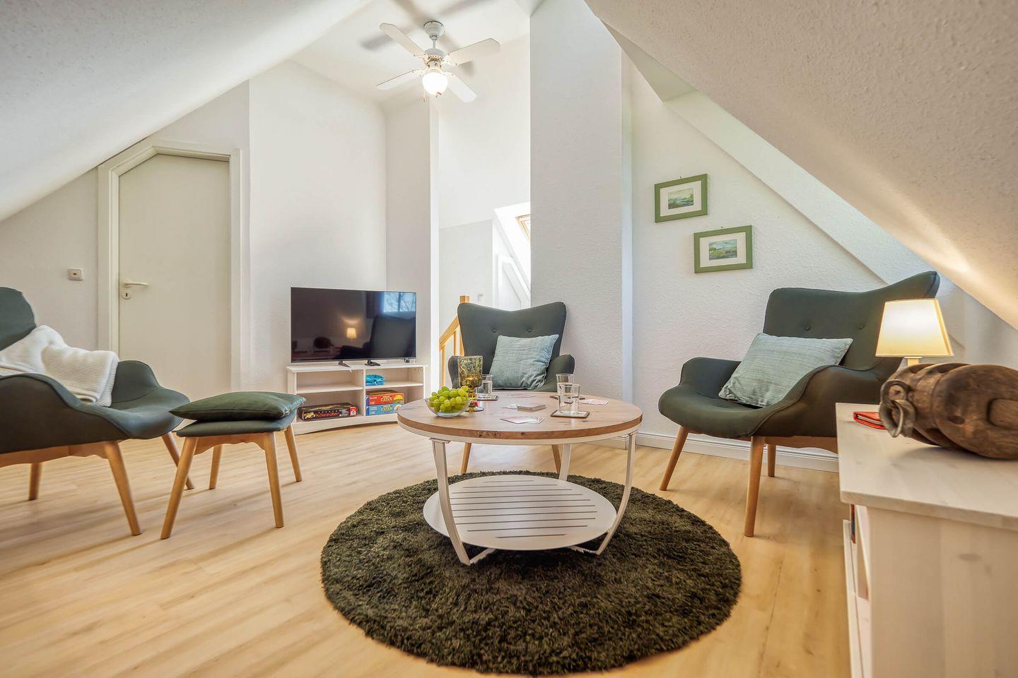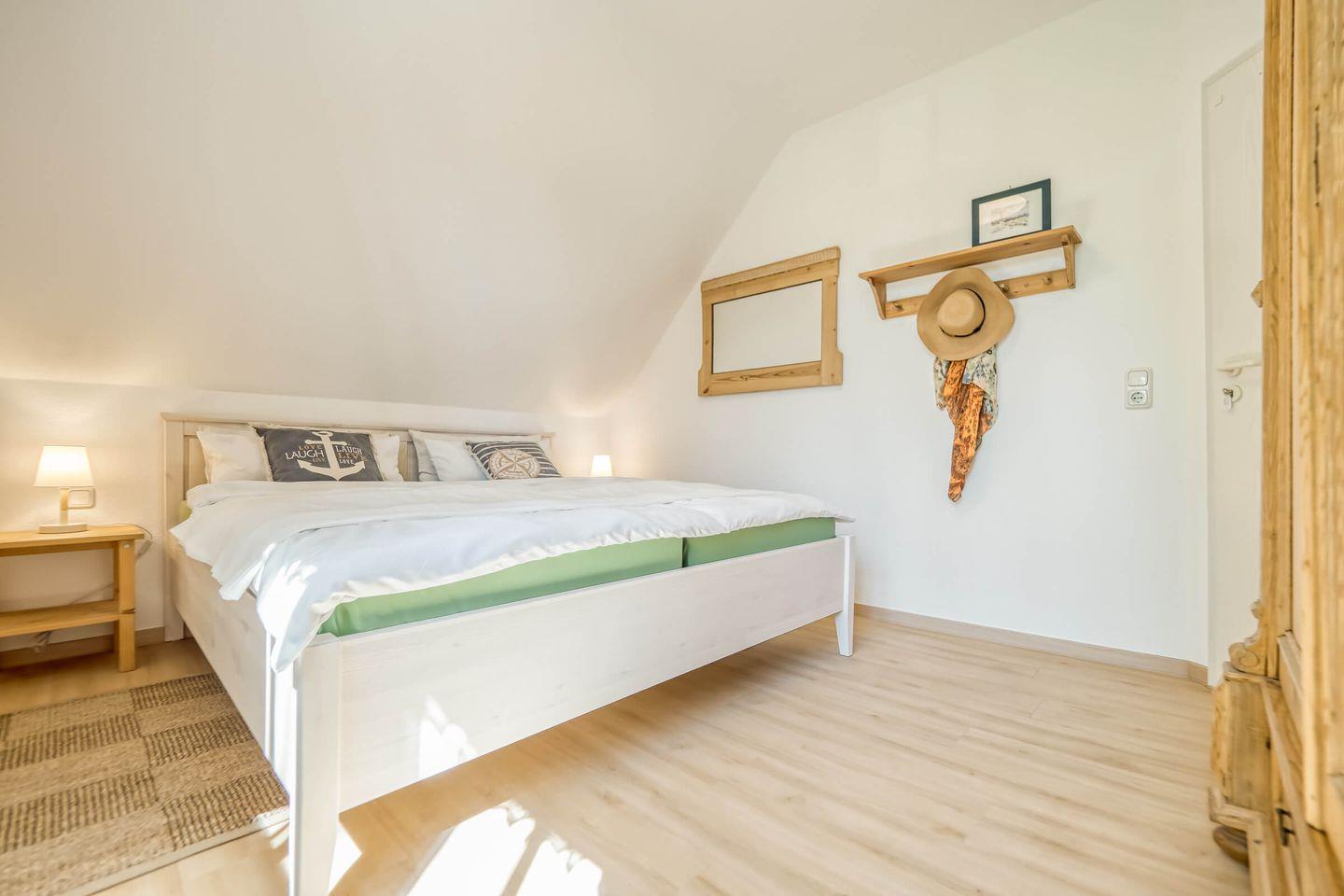 Die 75 qm große Maisonettewohnung bietet 5 Schlafplätze (90 cm x 200 cm). Ein Schlafzimmer verfügt über ein Doppelbett, ein Schlafzimmer über zwei Einzelbetten, und ein Bett befindet sich im DG in einer Nische, getrennt vom Wohnbereich.