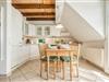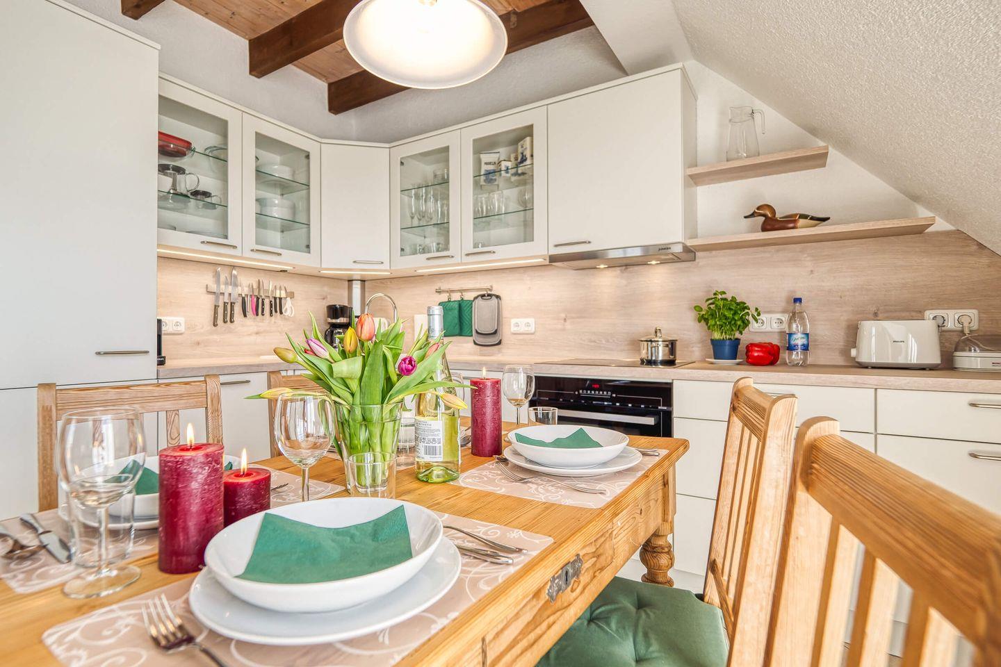 Der Wohnbereich auf Eingangsebene ist mit einer offenen Küche und Essecke verbunden. Hier befindet sich auch der Zugang zum Südbalkon. Die Küche verfügt über einen großen Kühlschrank mit getrennten Tiefkühlfächern, einen Induktionsherd mit 4 Kochbereichen und einen Backofen mit integrierter Mikrowelle. Es gibt einen Wasserkocher, einen Toaster, einen Eierkocher, eine Kaffeemaschine und eine Nespressomaschine.