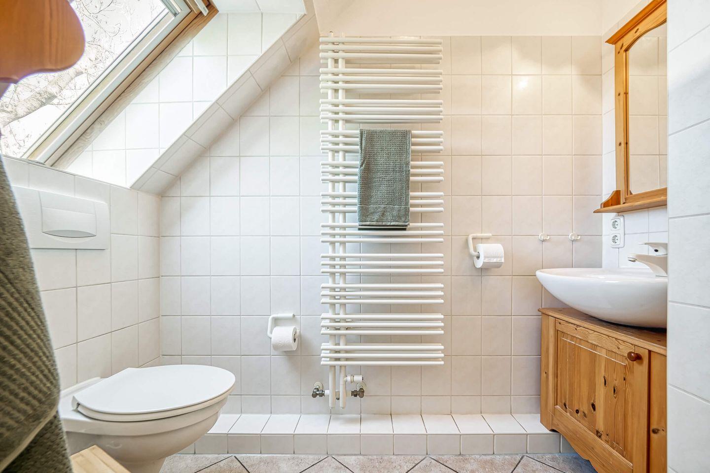 Die Wohnung verfügt über 2 Bäder. Im Bad auf der Eingangsebene ist neben Waschbecken und WC die Waschmaschine angeschlossen. Im Bad im DG ist neben WC und Waschbecken die Dusche untergebracht.