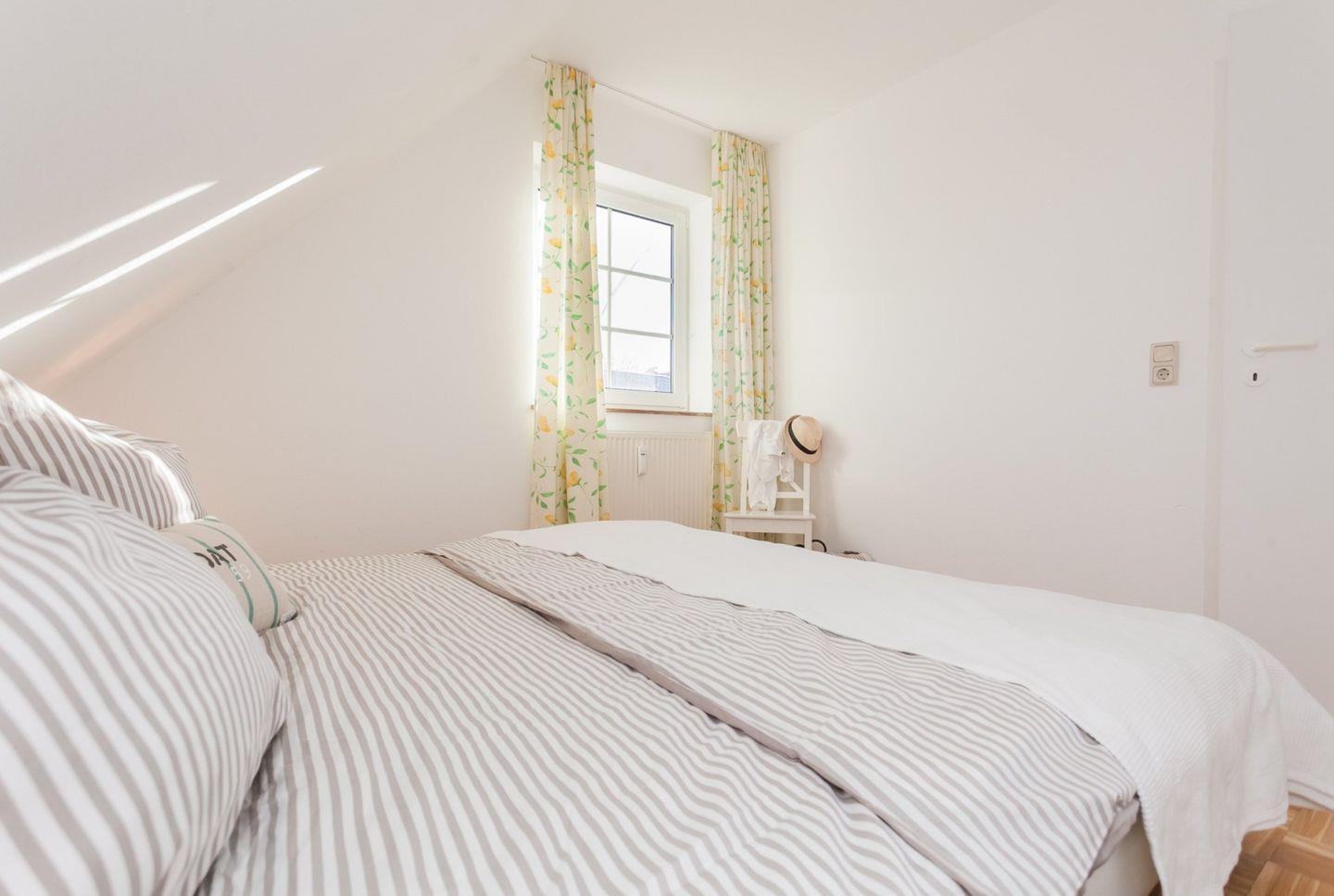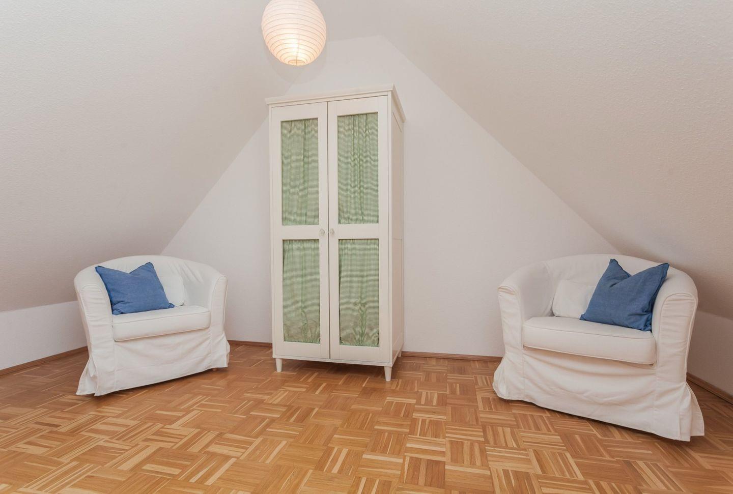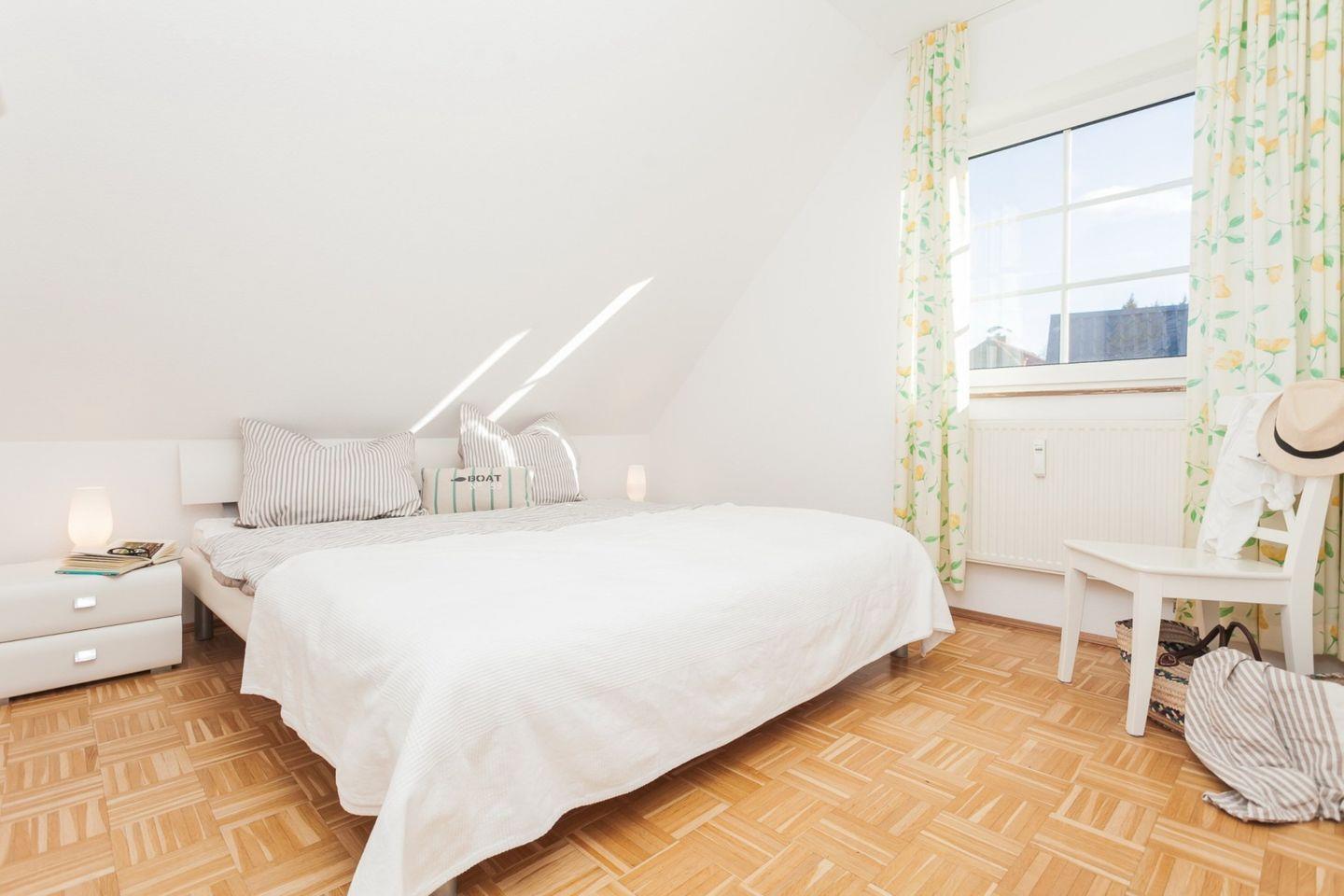 Die 80 qm große Maisonettewohnung kann mit bis zu 4 Erwachsenen und 1 Kind angemietet werden. Im 1. Obergeschoss liegt das Wohnzimmer mit der integrierten Küchenzeile und dem Essbereich. Von hier gelangen Sie auch auf den sonnigen Westbalkon. Eines der Schlafzimmer ist mit einem Doppelbett ausgestattet, im zweiten steht ein Schlafsofa für eine Person. Das Badezimmer ist mit Dusche und WC versehen. Über eine Treppe im Wohnraum erreicht man das dritte Schlafzimmer im Dachgeschoss, dieses ist mit einem Doppelbett eingerichtet.