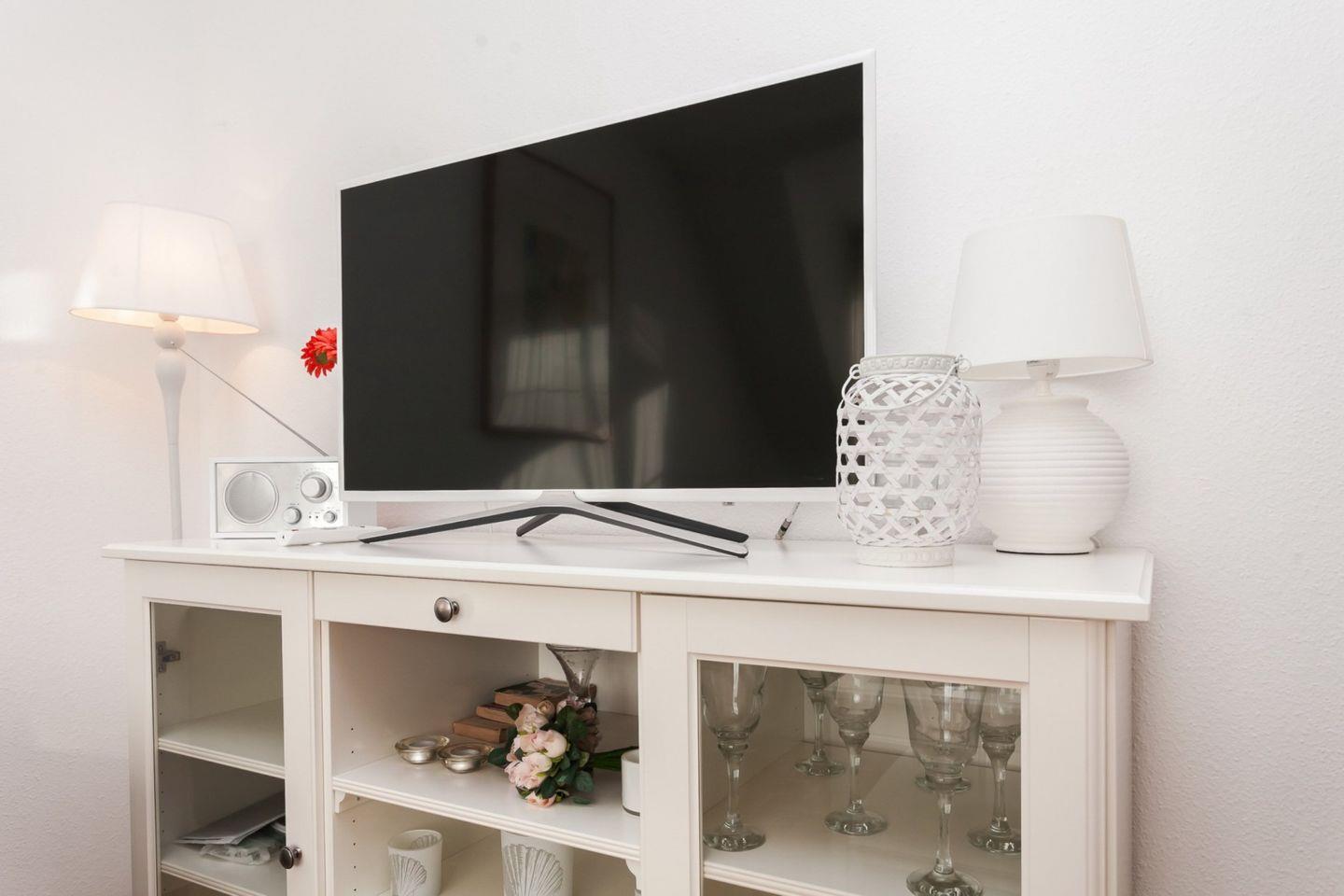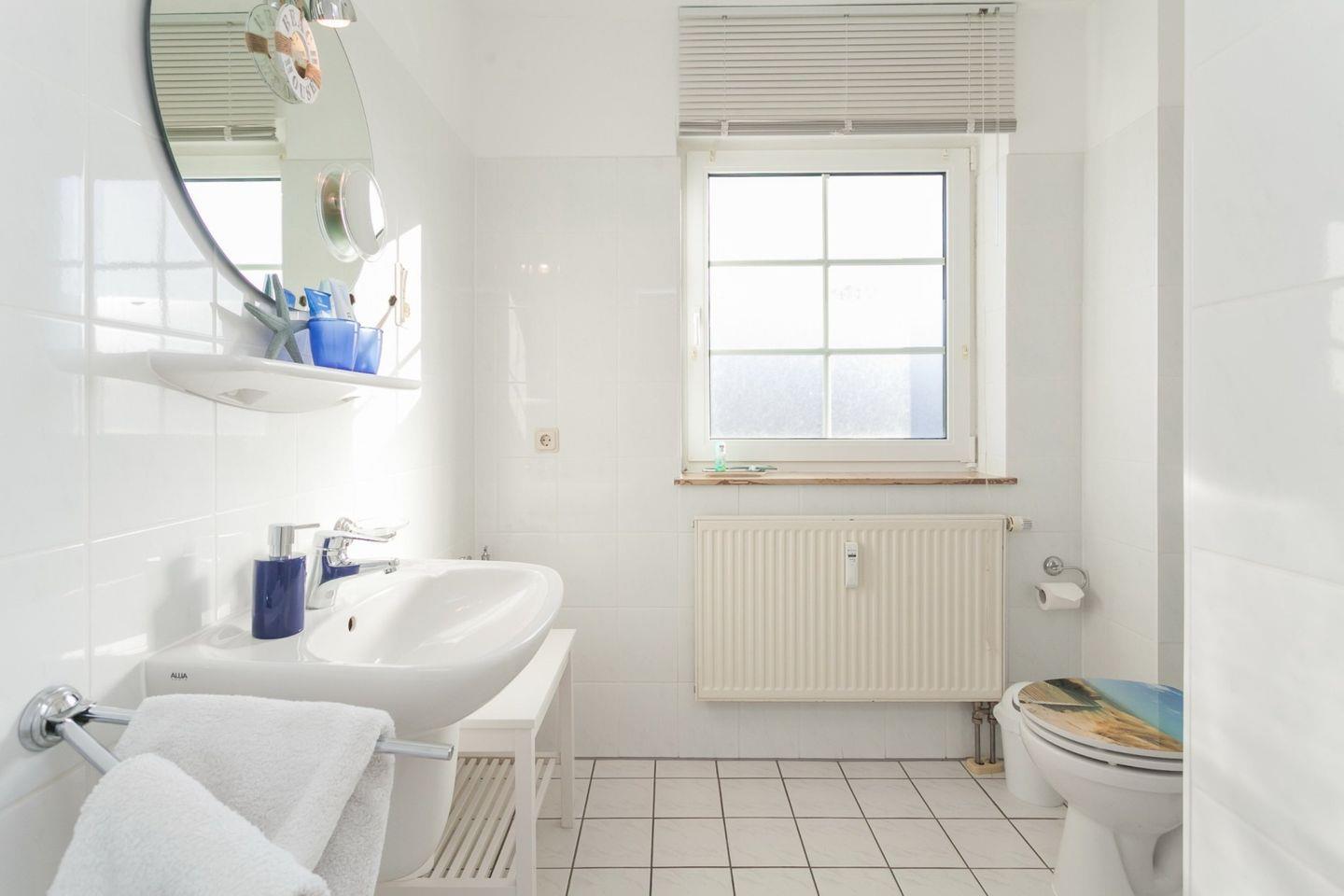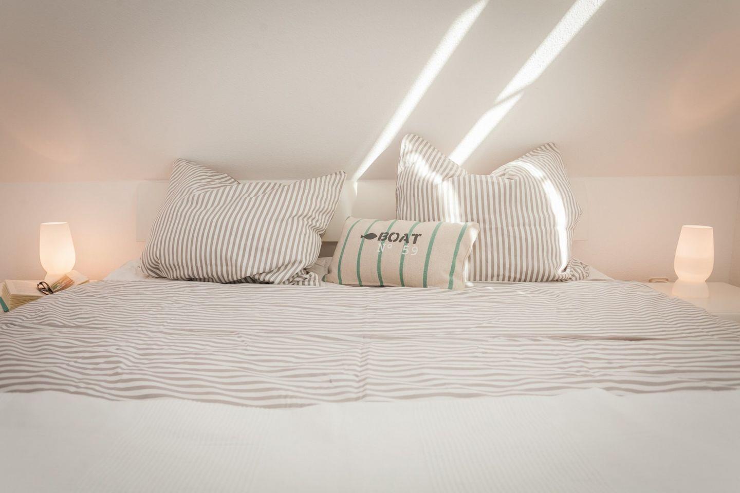 Die 80 qm große Maisonettewohnung kann mit bis zu 4 Erwachsenen und 1 Kind angemietet werden. Im 1. Obergeschoss liegt das Wohnzimmer mit der integrierten Küchenzeile und dem Essbereich. Von hier gelangen Sie auch auf den sonnigen Westbalkon. Eines der Schlafzimmer ist mit einem Doppelbett ausgestattet, im zweiten steht ein Schlafsofa für eine Person. Das Badezimmer ist mit Dusche und WC versehen. Über eine Treppe im Wohnraum erreicht man das dritte Schlafzimmer im Dachgeschoss, dieses ist mit einem Doppelbett eingerichtet.