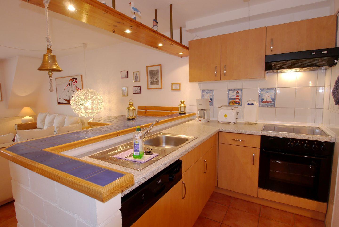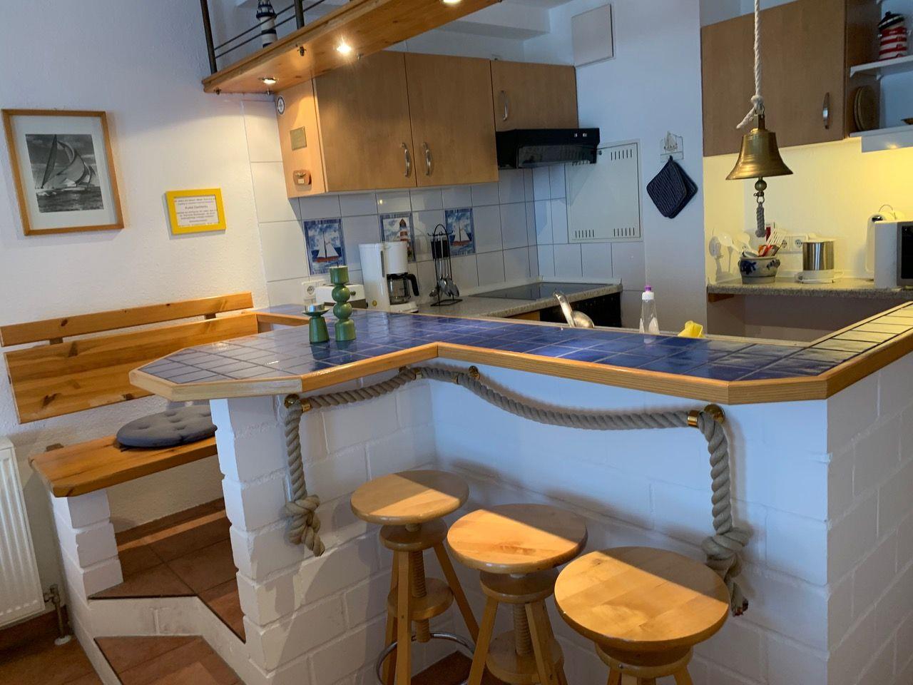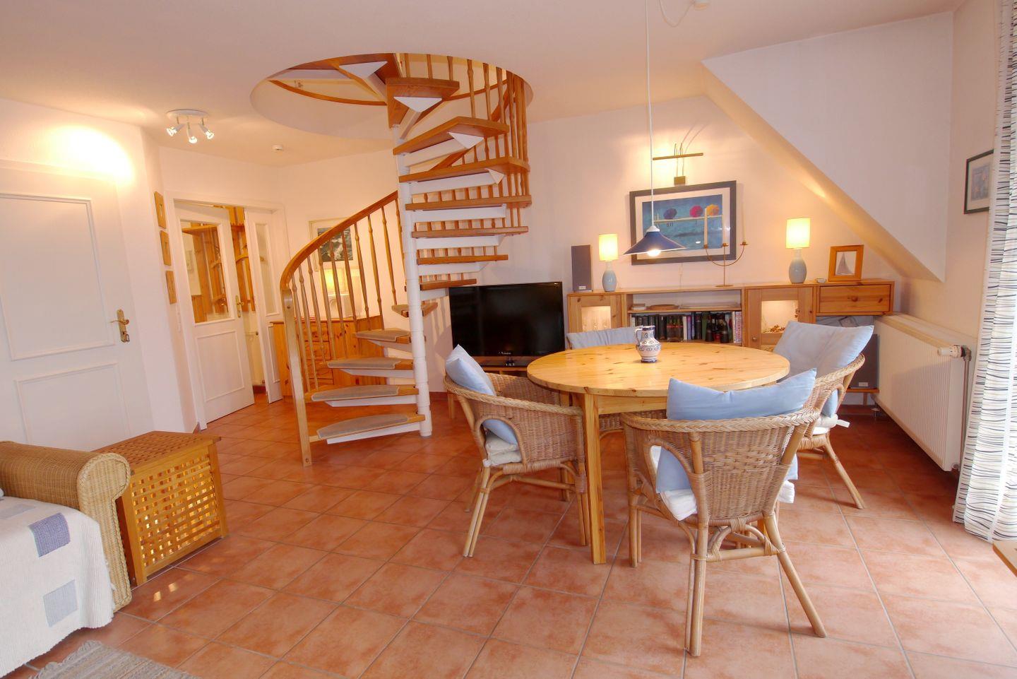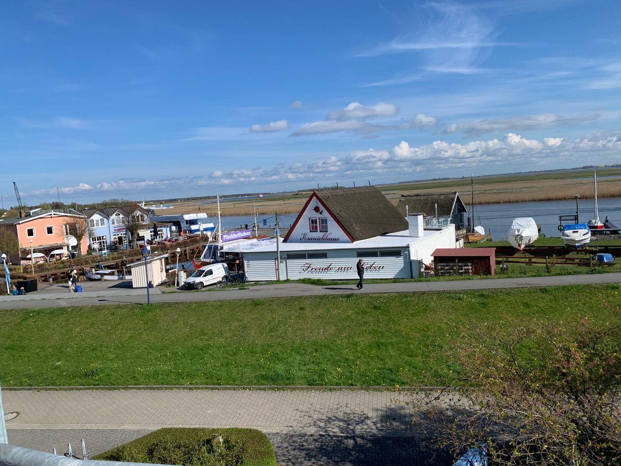 In der Maisonettwohnung finden Sie auf der Wohnebene den großen Wohnbereich mit integrierter Küche und das Bad mit Dusche und WC. Auf dieser Ebene ist auch der Südbalkon mit Blick auf den Hafen und das Boddengewässer. Auf der oberen Etage ist das Schlafzimmer mit einem Ehebett und einem zweitem Fernseher, einer weiteren kleinen Sitzecke sowie nochmals ein Gäste WC und ein weiterer Balkon Richtung Norden.