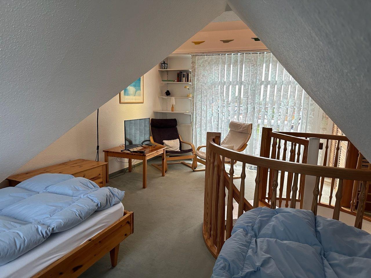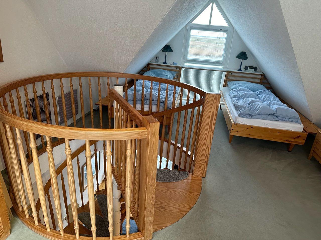 Über eine Wendeltreppe erreichen Sie das Schlafzimmer mit zwei einzel stehenden Betten und einem zweiten Fernseher.