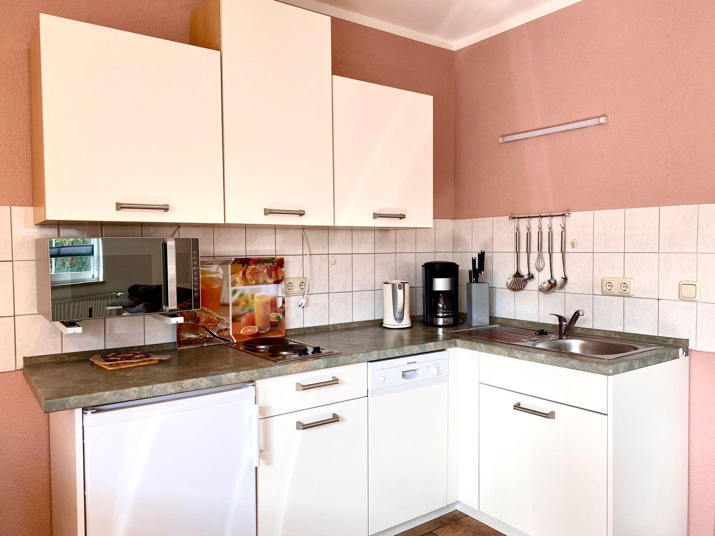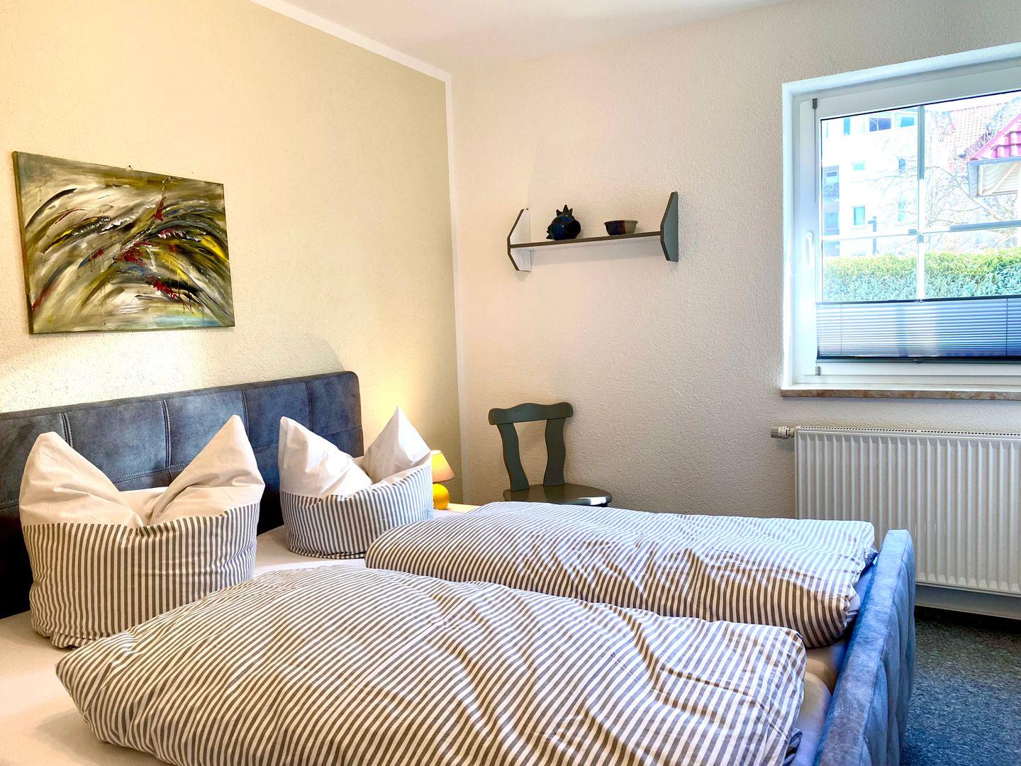 In einem gepflegten Garten befindet sich das Haus Windrose mit der Ferienwohnung" Brückendeck ". Diese ca. 45 qm große Ferienwohnung liegt im Erdgeschoss und wird für maximal zwei Erwachsene und ein Kind angeboten. Im Wohnzimmer befinden sich eine integrierte Küche und eine Essecke. Von hier gelangen Sie auf die große Terrasse, die zur Südseite ausgerichtet ist. Ihnen steht ein Schlafzimmer mit Doppelbett und eine Schlafcouch im Wohnzimmer zur Verfügung. Das Bad hat ein Fenster und ist mit einer neuen Glasdusche und WC sowie Handtuchtrockner ausgestattet. In der Küche befindet sich eine Mikrowelle mit Grill und Backfunktion. In der Wohnung ist in jedem Zimmer mindestens ein Fenster mit Fliegengitter vorhanden.